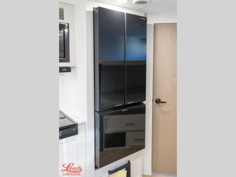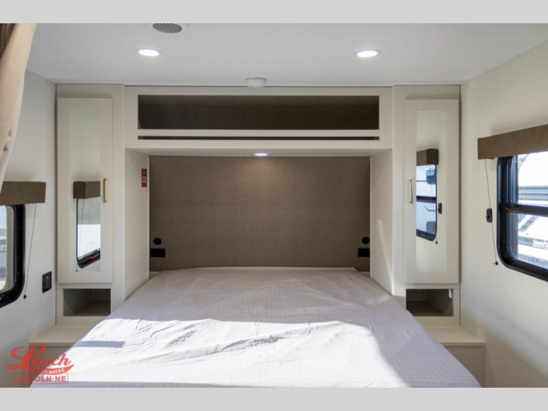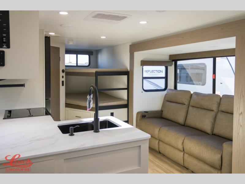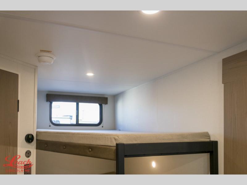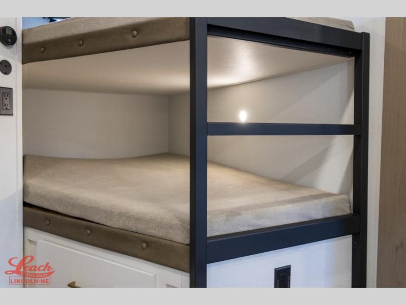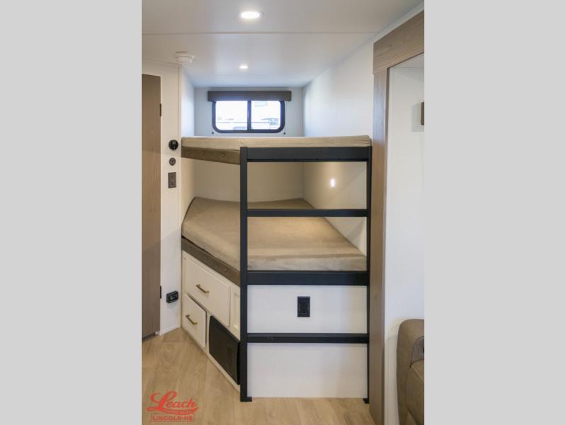 This fantastic travel trailer is designed to provide the ultimate in comfort, convenience, and adventure! The double-size bunk beds are perfect for kids, providing ample sleeping space and an under-bed storage space for all your belongings. The full bathroom features a linen closet, providing convenient storage for towels and toiletries. In the kitchen area, the U-shaped dinette is a great spot for creating memories that will last a lifetime, the refrigerator keeps your food and drinks fresh, while the microwave provides a quick and easy way to prepare meals. And for major convenience, the pull-out trash makes cleaning up a simple task. Take a nap in the comfortable front queen bed, which is a serene retreat, providing a comfortable spot to rest and relax. Jump to the exterior in a comfortable way with the double entry/exit door providing added convenience and flexibility, while the exterior awning provides shade and protection from the elements. The pass-through storage offers ample space for your outdoor gear and equipment.