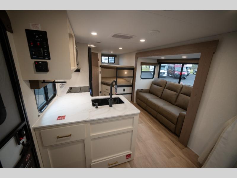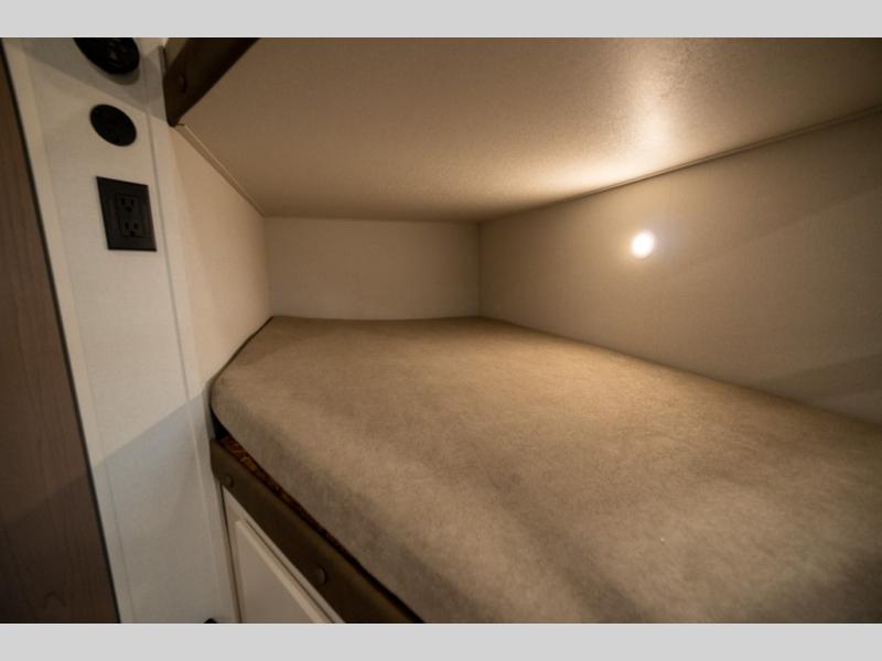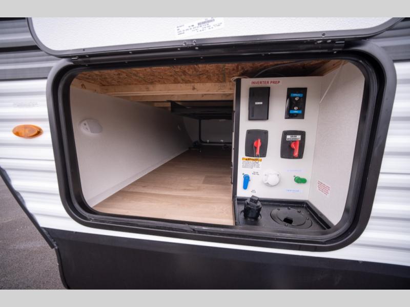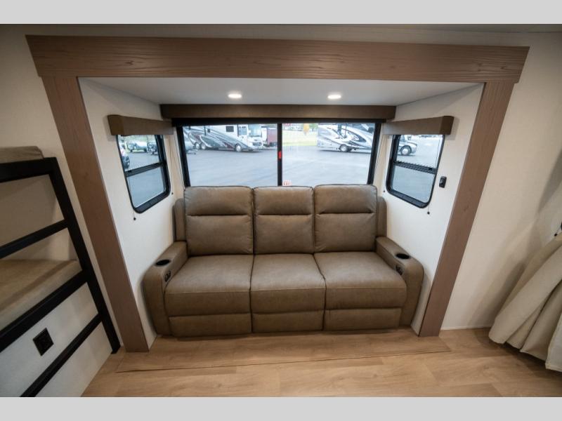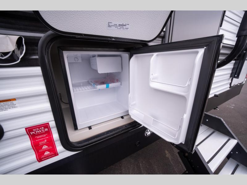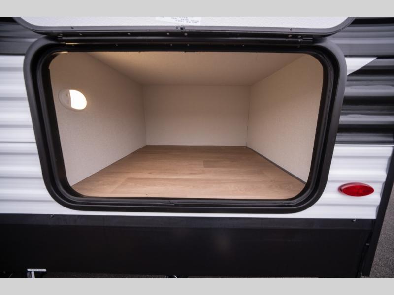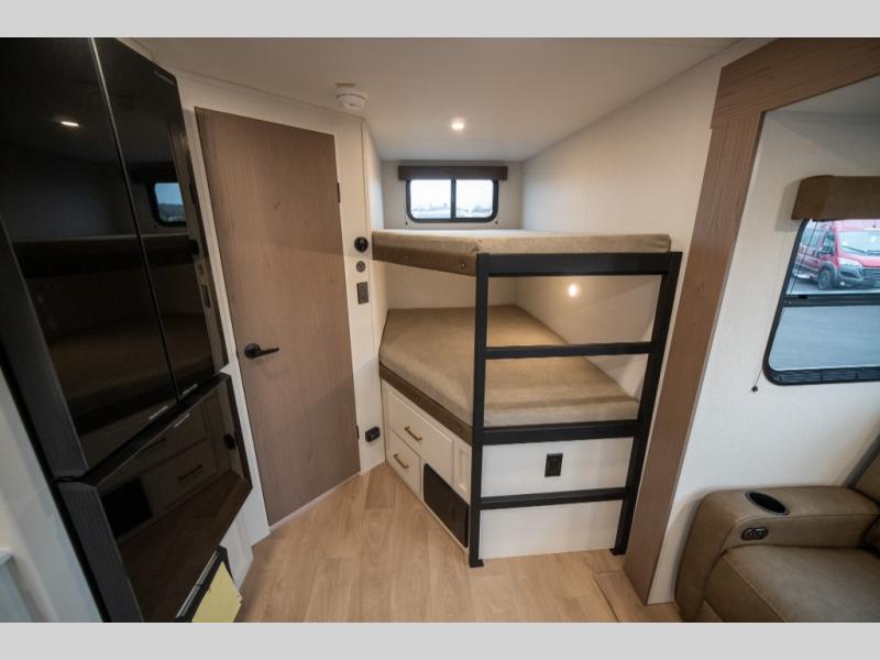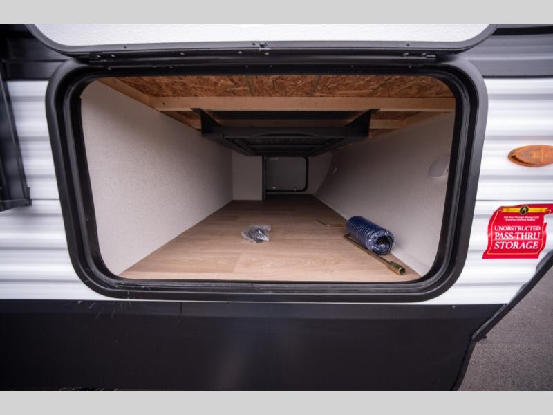 This fantastic travel trailer is designed to provide the ultimate in comfort, convenience, and adventure! The double-size bunk beds are perfect for kids, providing ample sleeping space and an under-bed storage space for all your belongings. The full bathroom features a linen closet, providing convenient storage for towels and toiletries. In the kitchen area, the U-shaped dinette is a great spot for creating memories that will last a lifetime, the refrigerator keeps your food and drinks fresh, while the microwave provides a quick and easy way to prepare meals. And for major convenience, the pull-out trash makes cleaning up a simple task. Take a nap in the comfortable front queen bed, which is a serene retreat, providing a comfortable spot to rest and relax. Jump to the exterior in a comfortable way with the double entry/exit door providing added convenience and flexibility, while the exterior awning provides shade and protection from the elements. The pass-through storage offers ample space for your outdoor gear and equipment.