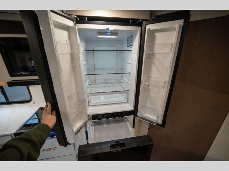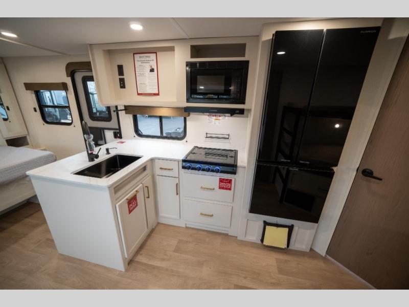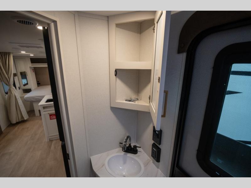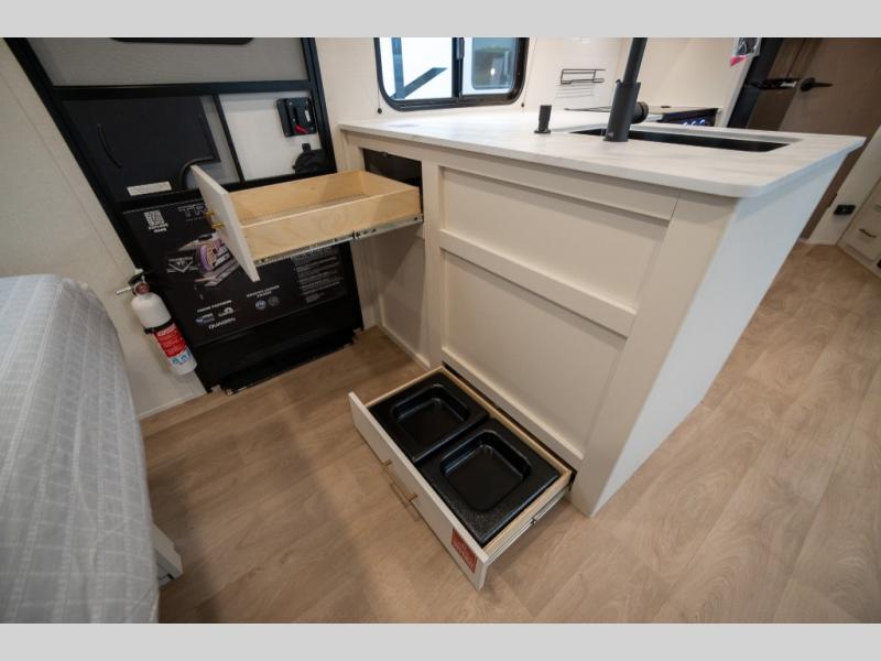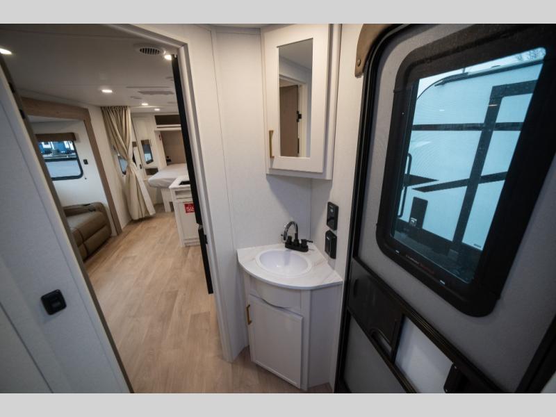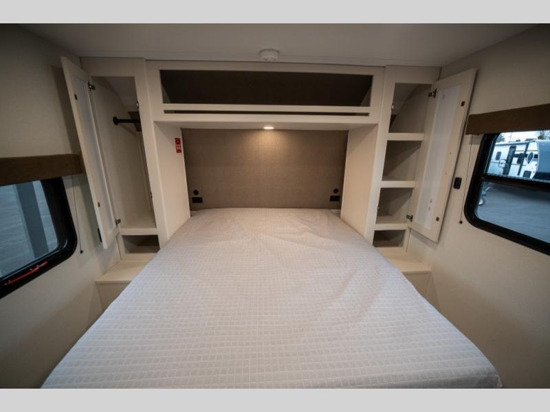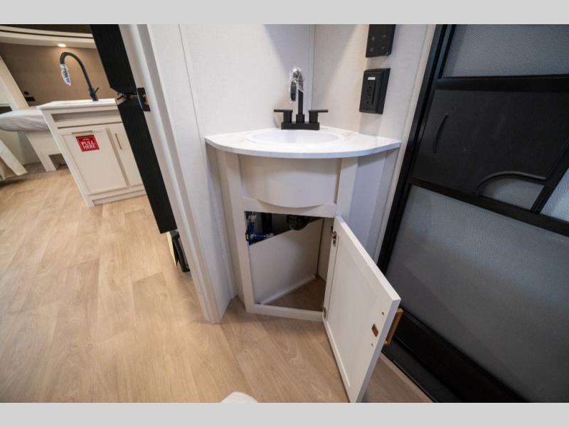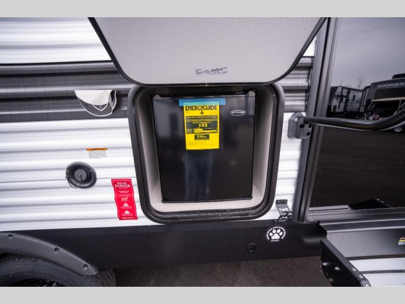 This fantastic travel trailer is designed to provide the ultimate in comfort, convenience, and adventure! The double-size bunk beds are perfect for kids, providing ample sleeping space and an under-bed storage space for all your belongings. The full bathroom features a linen closet, providing convenient storage for towels and toiletries. In the kitchen area, the U-shaped dinette is a great spot for creating memories that will last a lifetime, the refrigerator keeps your food and drinks fresh, while the microwave provides a quick and easy way to prepare meals. And for major convenience, the pull-out trash makes cleaning up a simple task. Take a nap in the comfortable front queen bed, which is a serene retreat, providing a comfortable spot to rest and relax. Jump to the exterior in a comfortable way with the double entry/exit door providing added convenience and flexibility, while the exterior awning provides shade and protection from the elements. The pass-through storage offers ample space for your outdoor gear and equipment.