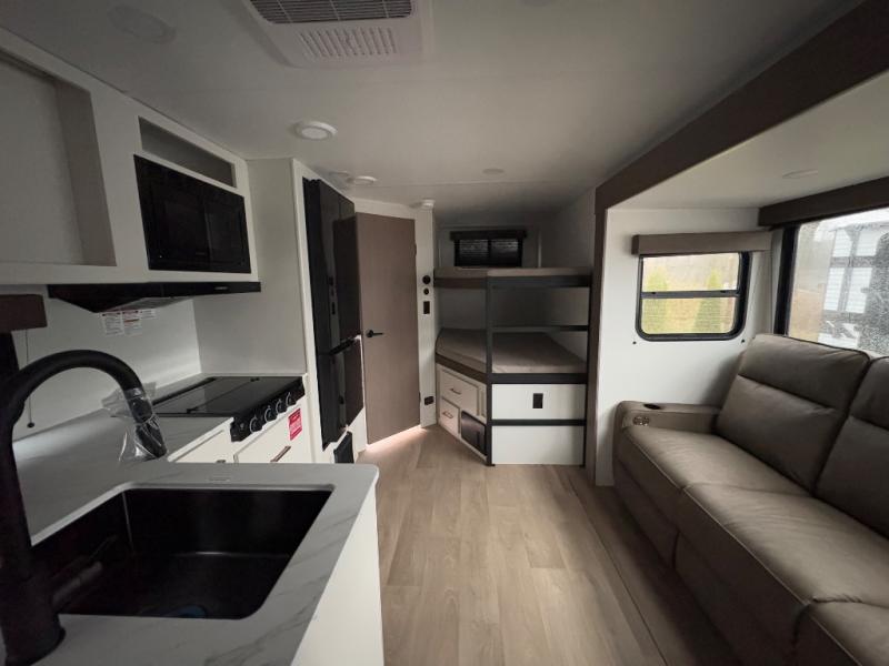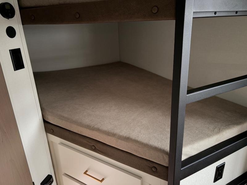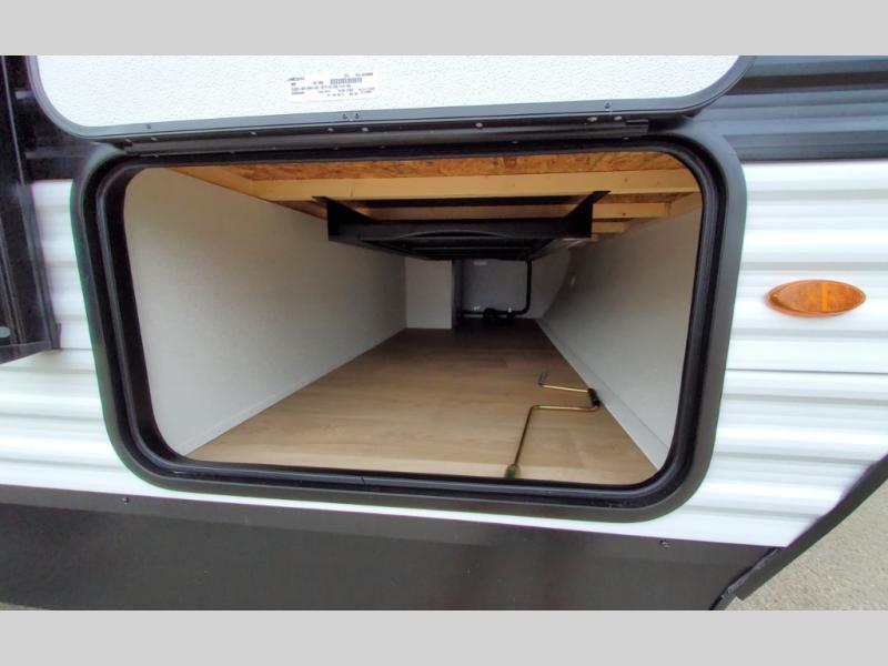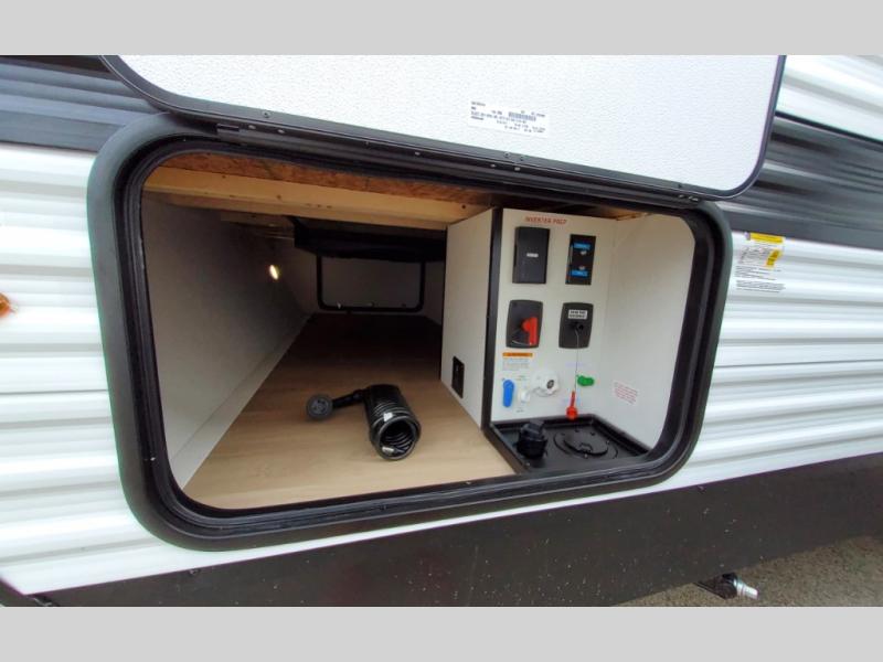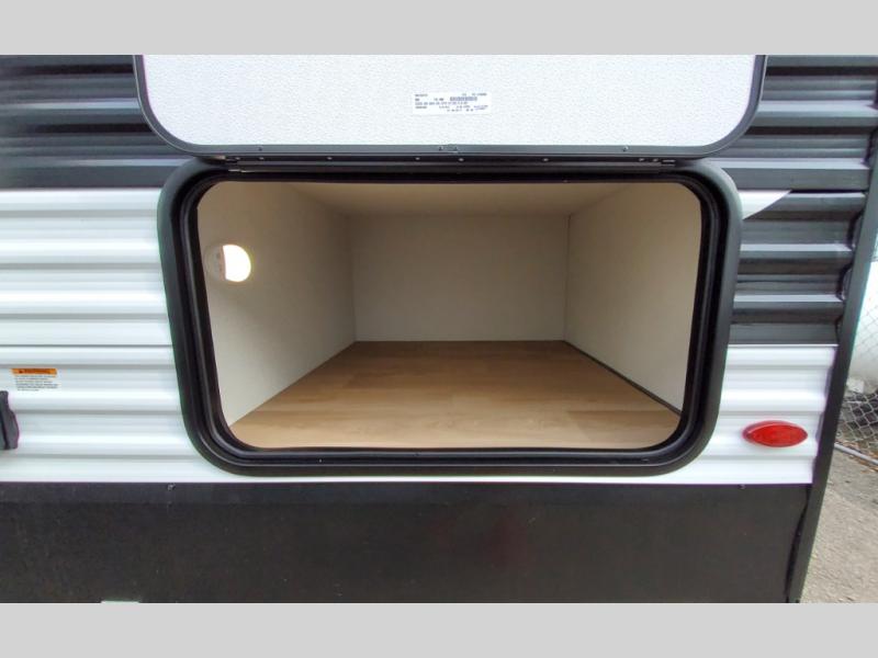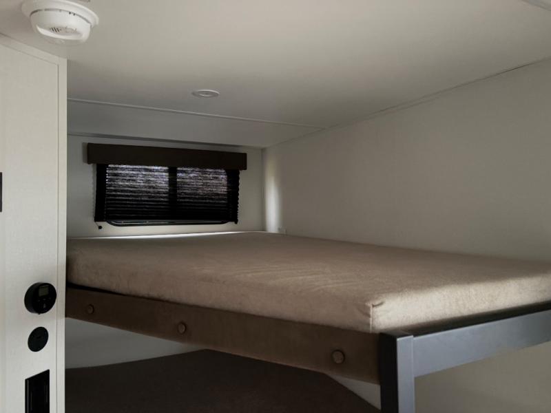 This fantastic travel trailer is designed to provide the ultimate in comfort, convenience, and adventure! The double-size bunk beds are perfect for kids, providing ample sleeping space and an under-bed storage space for all your belongings. The full bathroom features a linen closet, providing convenient storage for towels and toiletries. In the kitchen area, the U-shaped dinette is a great spot for creating memories that will last a lifetime, the refrigerator keeps your food and drinks fresh, while the microwave provides a quick and easy way to prepare meals. And for major convenience, the pull-out trash makes cleaning up a simple task. Take a nap in the comfortable front queen bed, which is a serene retreat, providing a comfortable spot to rest and relax. Jump to the exterior in a comfortable way with the double entry/exit door providing added convenience and flexibility, while the exterior awning provides shade and protection from the elements. The pass-through storage offers ample space for your outdoor gear and equipment.
