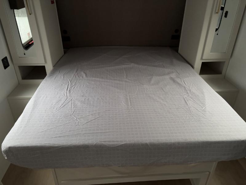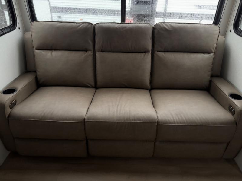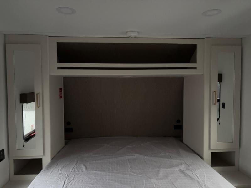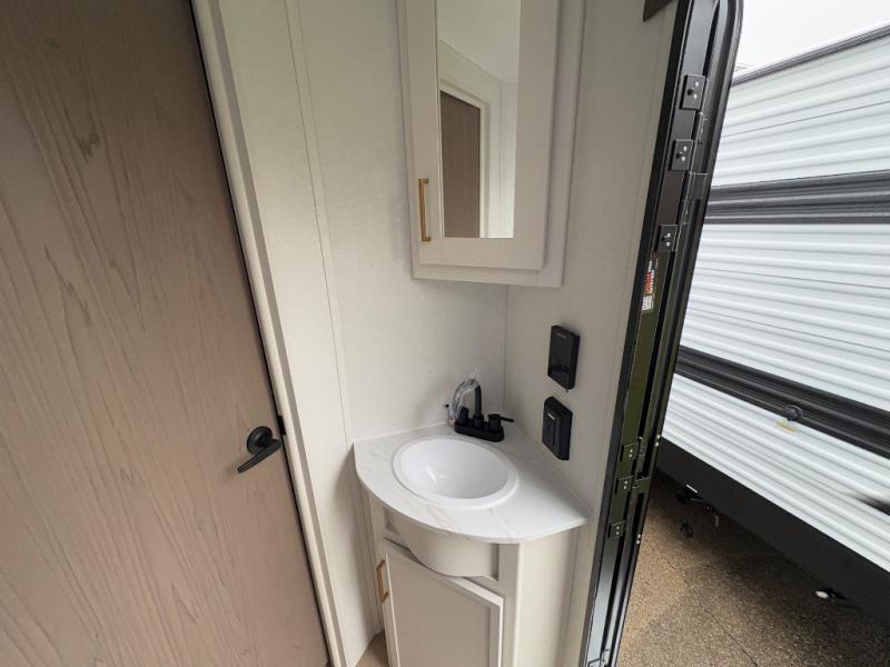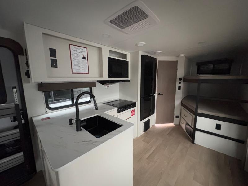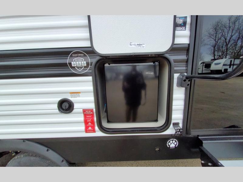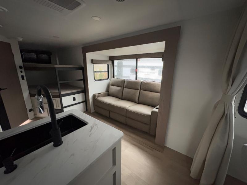 This fantastic travel trailer is designed to provide the ultimate in comfort, convenience, and adventure! The double-size bunk beds are perfect for kids, providing ample sleeping space and an under-bed storage space for all your belongings. The full bathroom features a linen closet, providing convenient storage for towels and toiletries. In the kitchen area, the U-shaped dinette is a great spot for creating memories that will last a lifetime, the refrigerator keeps your food and drinks fresh, while the microwave provides a quick and easy way to prepare meals. And for major convenience, the pull-out trash makes cleaning up a simple task. Take a nap in the comfortable front queen bed, which is a serene retreat, providing a comfortable spot to rest and relax. Jump to the exterior in a comfortable way with the double entry/exit door providing added convenience and flexibility, while the exterior awning provides shade and protection from the elements. The pass-through storage offers ample space for your outdoor gear and equipment.