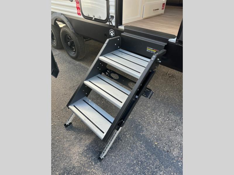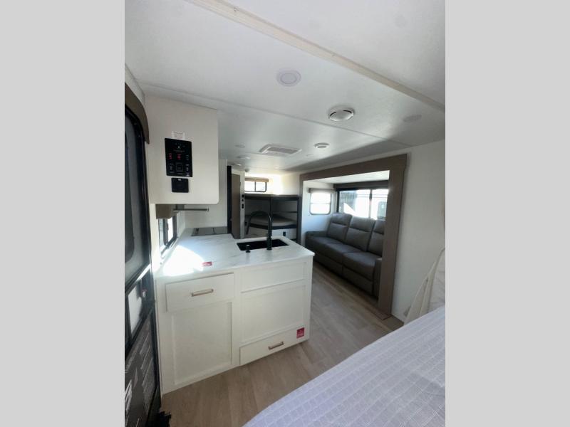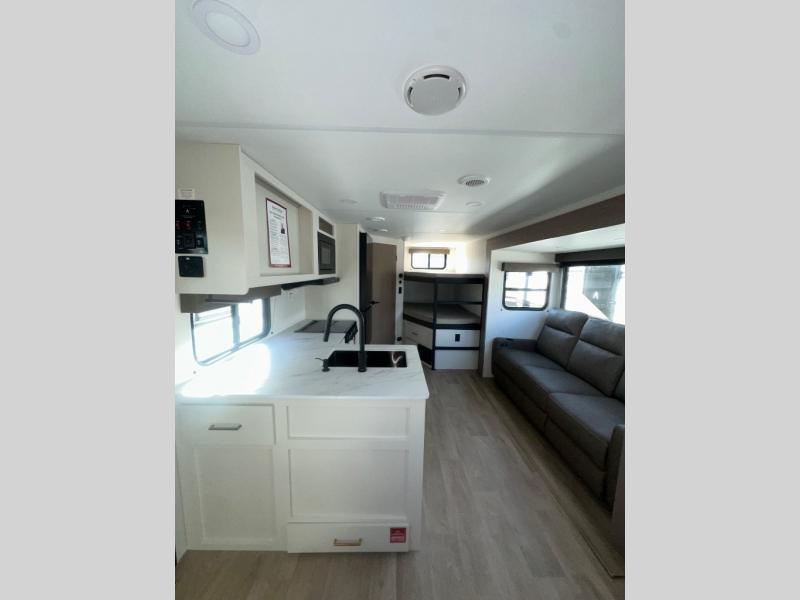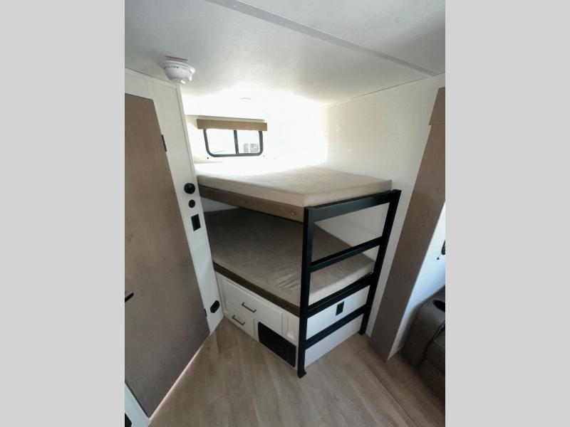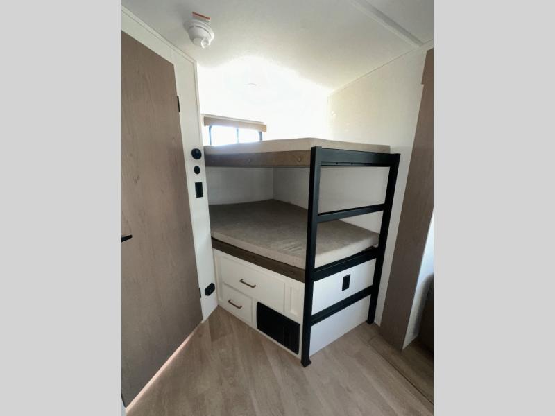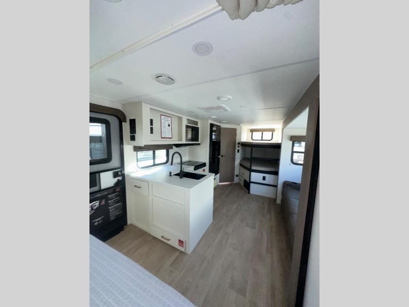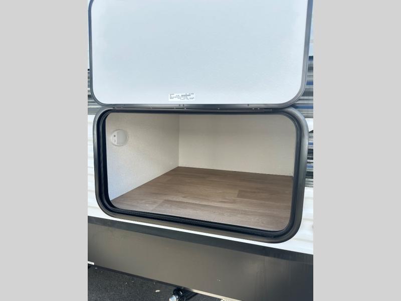 This fantastic travel trailer is designed to provide the ultimate in comfort, convenience, and adventure! The double-size bunk beds are perfect for kids, providing ample sleeping space and an under-bed storage space for all your belongings. The full bathroom features a linen closet, providing convenient storage for towels and toiletries. In the kitchen area, the U-shaped dinette is a great spot for creating memories that will last a lifetime, the refrigerator keeps your food and drinks fresh, while the microwave provides a quick and easy way to prepare meals. And for major convenience, the pull-out trash makes cleaning up a simple task. Take a nap in the comfortable front queen bed, which is a serene retreat, providing a comfortable spot to rest and relax. Jump to the exterior in a comfortable way with the double entry/exit door providing added convenience and flexibility, while the exterior awning provides shade and protection from the elements. The pass-through storage offers ample space for your outdoor gear and equipment.
