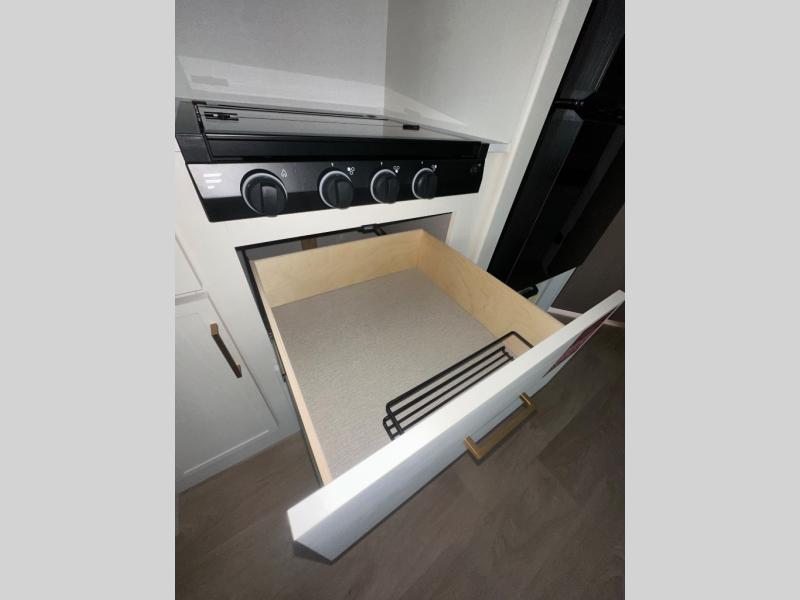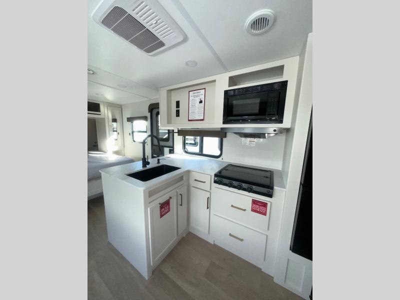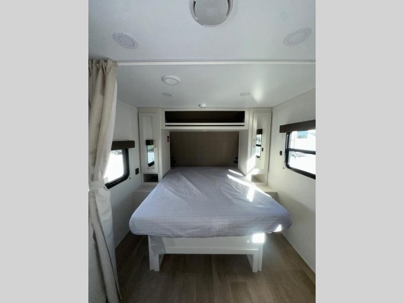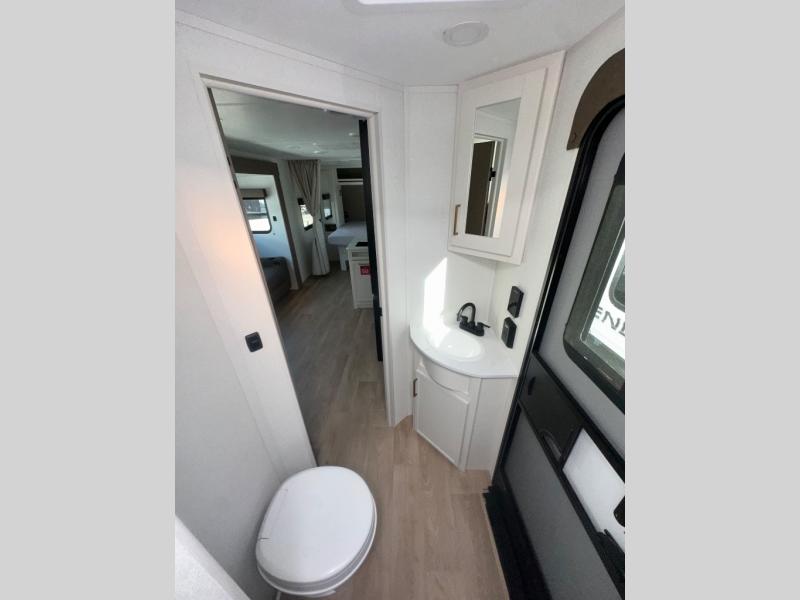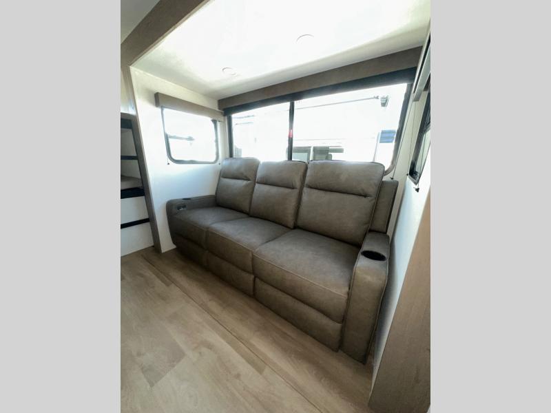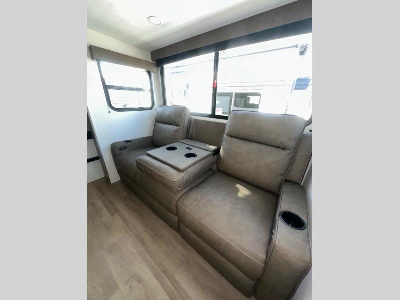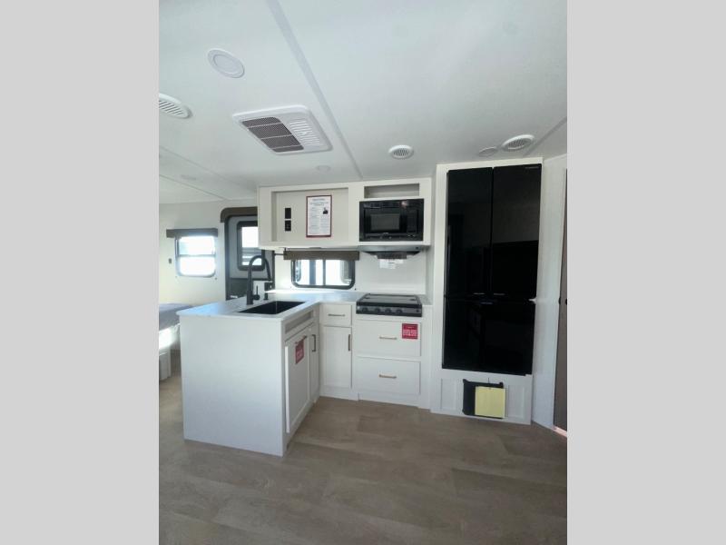 This fantastic travel trailer is designed to provide the ultimate in comfort, convenience, and adventure! The double-size bunk beds are perfect for kids, providing ample sleeping space and an under-bed storage space for all your belongings. The full bathroom features a linen closet, providing convenient storage for towels and toiletries. In the kitchen area, the U-shaped dinette is a great spot for creating memories that will last a lifetime, the refrigerator keeps your food and drinks fresh, while the microwave provides a quick and easy way to prepare meals. And for major convenience, the pull-out trash makes cleaning up a simple task. Take a nap in the comfortable front queen bed, which is a serene retreat, providing a comfortable spot to rest and relax. Jump to the exterior in a comfortable way with the double entry/exit door providing added convenience and flexibility, while the exterior awning provides shade and protection from the elements. The pass-through storage offers ample space for your outdoor gear and equipment.
