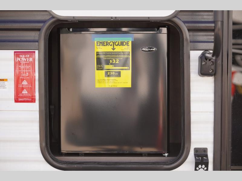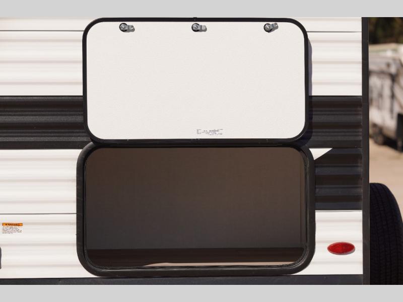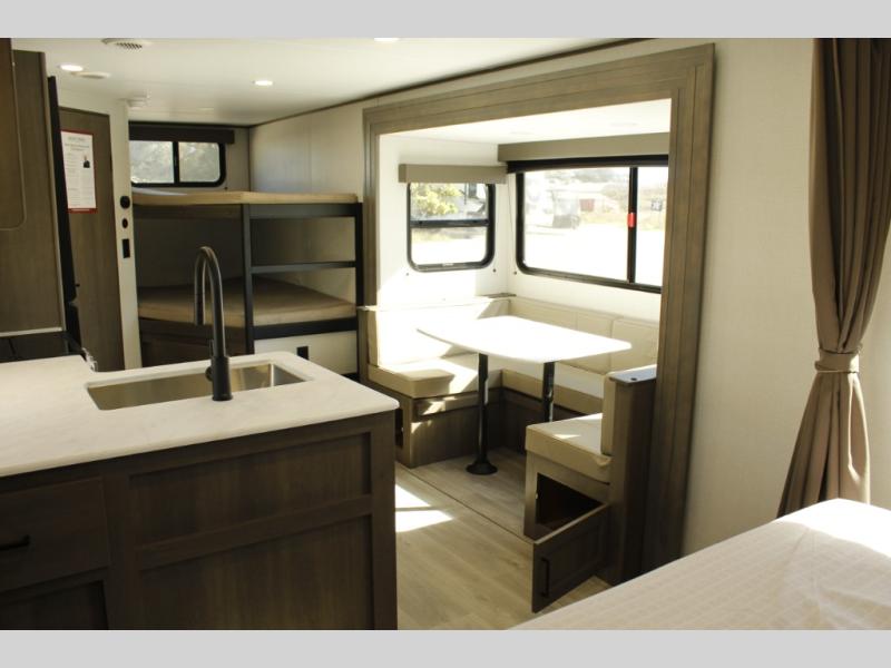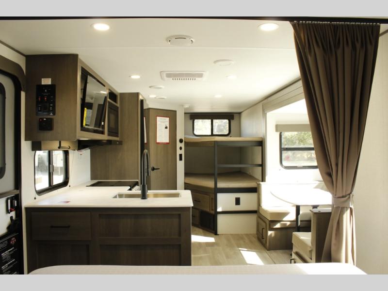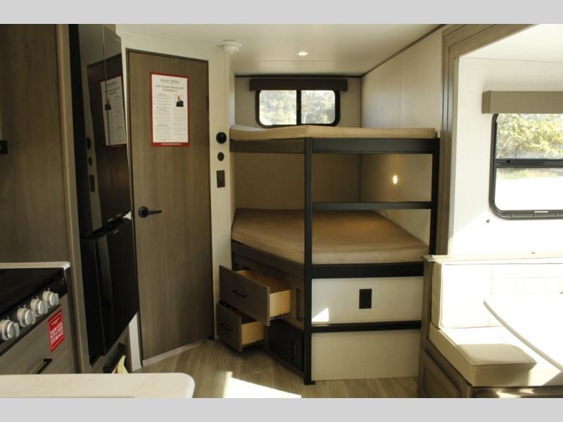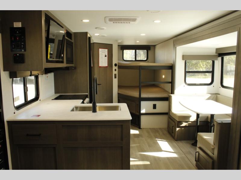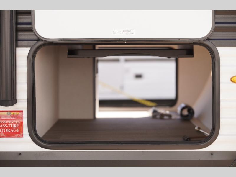 This fantastic travel trailer is designed to provide the ultimate in comfort, convenience, and adventure! The double-size bunk beds are perfect for kids, providing ample sleeping space and an under-bed storage space for all your belongings. The full bathroom features a linen closet, providing convenient storage for towels and toiletries. In the kitchen area, the U-shaped dinette is a great spot for creating memories that will last a lifetime, the refrigerator keeps your food and drinks fresh, while the microwave provides a quick and easy way to prepare meals. And for major convenience, the pull-out trash makes cleaning up a simple task. Take a nap in the comfortable front queen bed, which is a serene retreat, providing a comfortable spot to rest and relax. Jump to the exterior in a comfortable way with the double entry/exit door providing added convenience and flexibility, while the exterior awning provides shade and protection from the elements. The pass-through storage offers ample space for your outdoor gear and equipment.