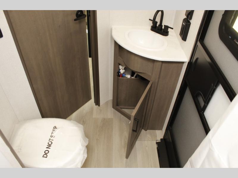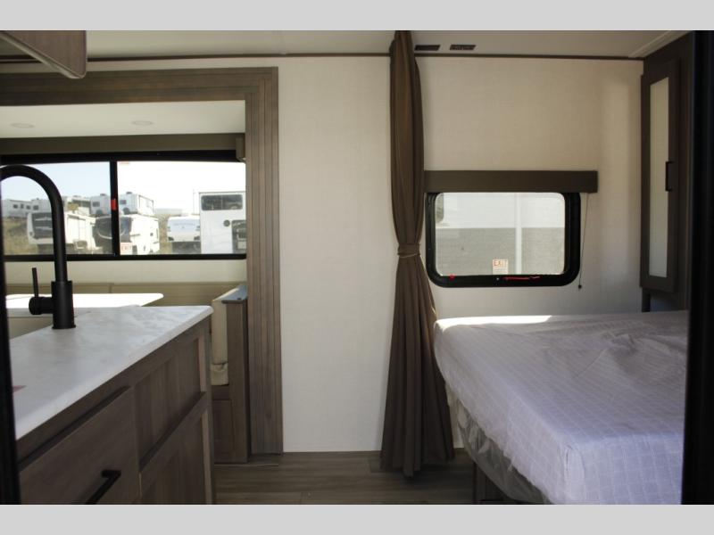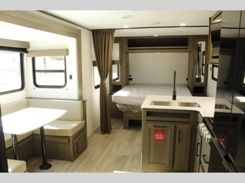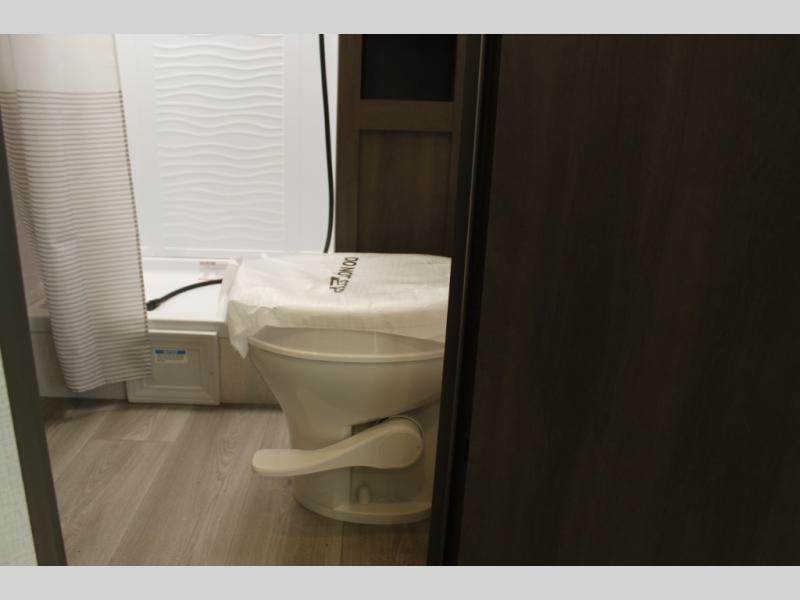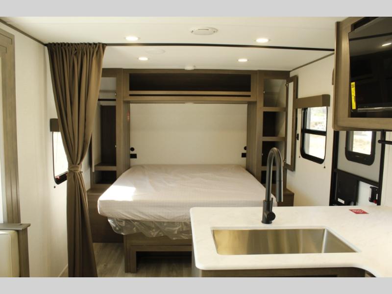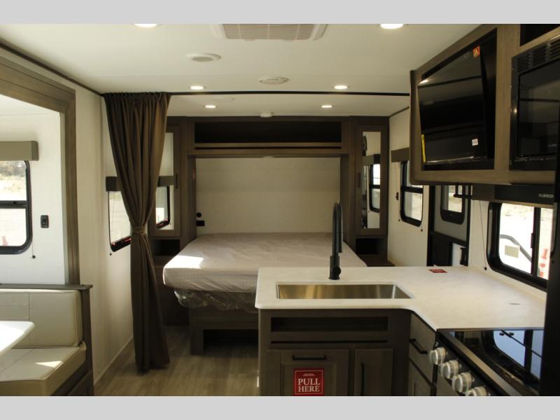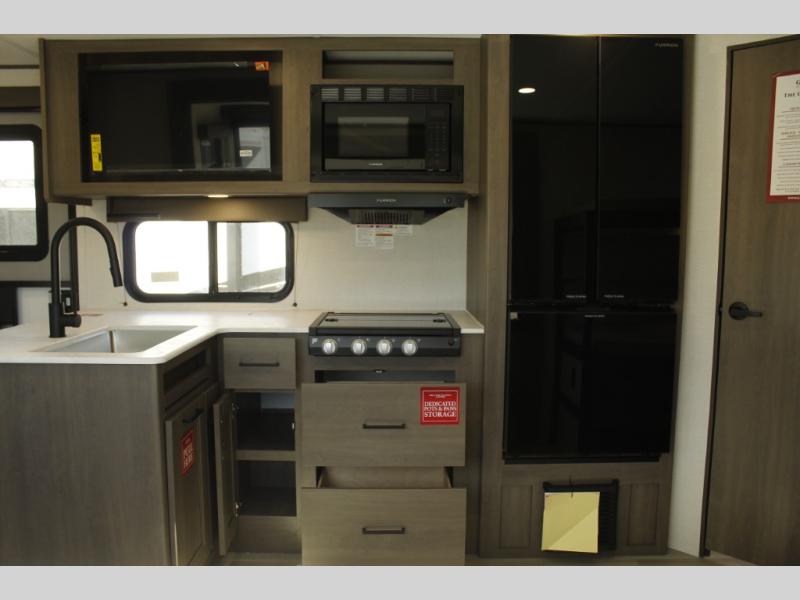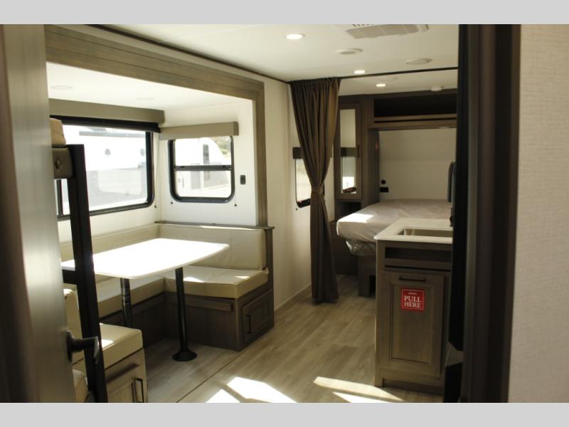 This fantastic travel trailer is designed to provide the ultimate in comfort, convenience, and adventure! The double-size bunk beds are perfect for kids, providing ample sleeping space and an under-bed storage space for all your belongings. The full bathroom features a linen closet, providing convenient storage for towels and toiletries. In the kitchen area, the U-shaped dinette is a great spot for creating memories that will last a lifetime, the refrigerator keeps your food and drinks fresh, while the microwave provides a quick and easy way to prepare meals. And for major convenience, the pull-out trash makes cleaning up a simple task. Take a nap in the comfortable front queen bed, which is a serene retreat, providing a comfortable spot to rest and relax. Jump to the exterior in a comfortable way with the double entry/exit door providing added convenience and flexibility, while the exterior awning provides shade and protection from the elements. The pass-through storage offers ample space for your outdoor gear and equipment.