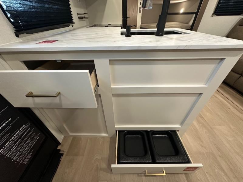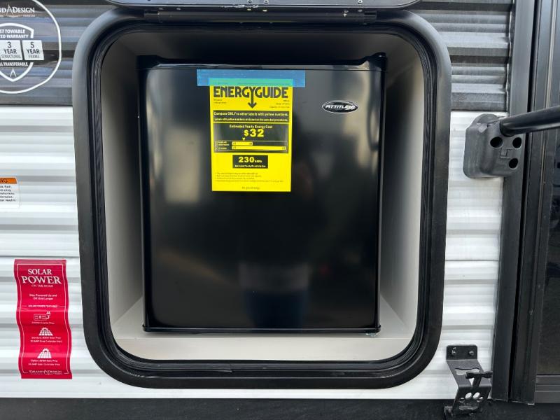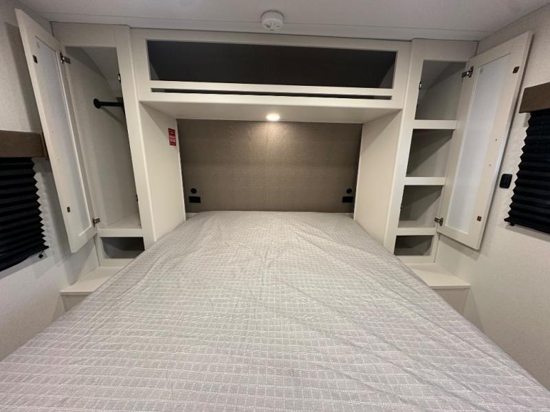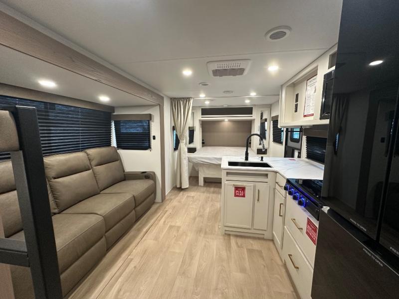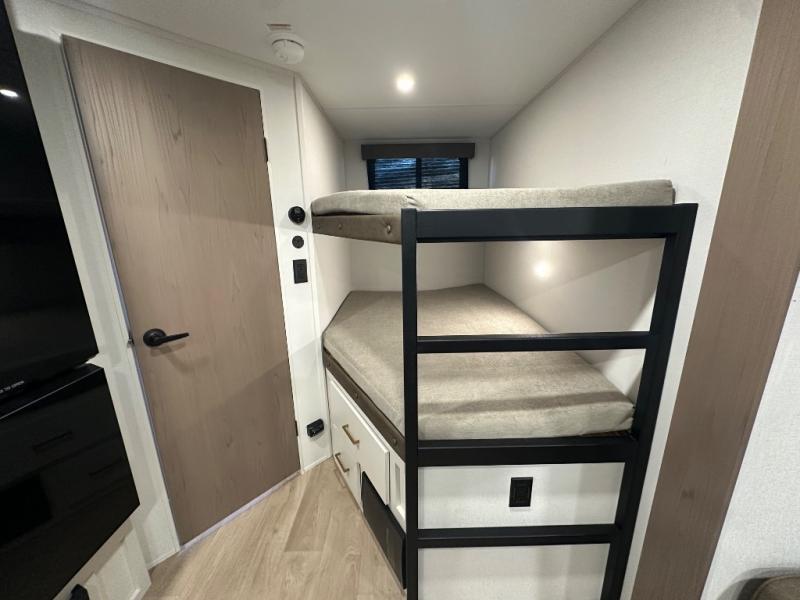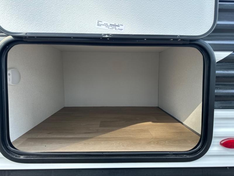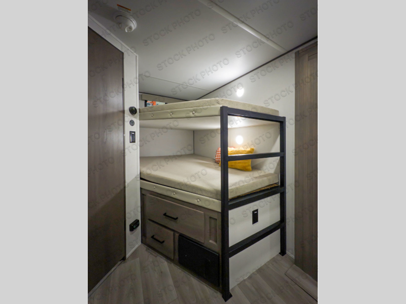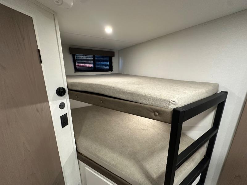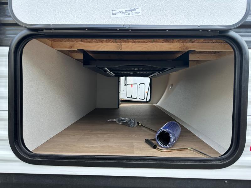 This fantastic travel trailer is designed to provide the ultimate in comfort, convenience, and adventure! The double-size bunk beds are perfect for kids, providing ample sleeping space and an under-bed storage space for all your belongings. The full bathroom features a linen closet, providing convenient storage for towels and toiletries. In the kitchen area, the U-shaped dinette is a great spot for creating memories that will last a lifetime, the refrigerator keeps your food and drinks fresh, while the microwave provides a quick and easy way to prepare meals. And for major convenience, the pull-out trash makes cleaning up a simple task. Take a nap in the comfortable front queen bed, which is a serene retreat, providing a comfortable spot to rest and relax. Jump to the exterior in a comfortable way with the double entry/exit door providing added convenience and flexibility, while the exterior awning provides shade and protection from the elements. The pass-through storage offers ample space for your outdoor gear and equipment.