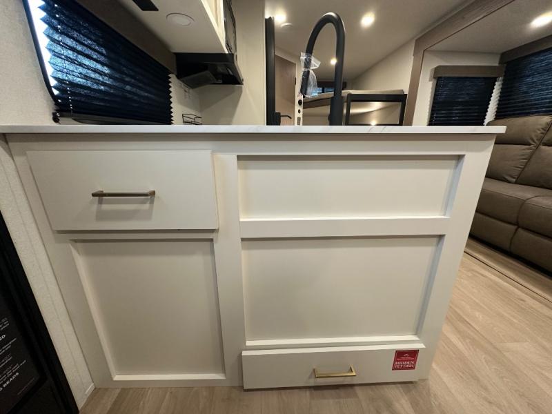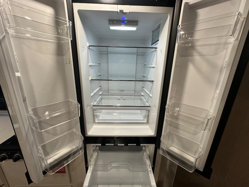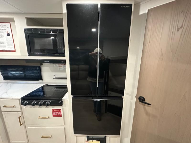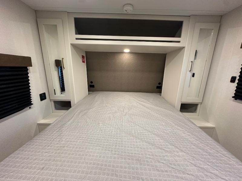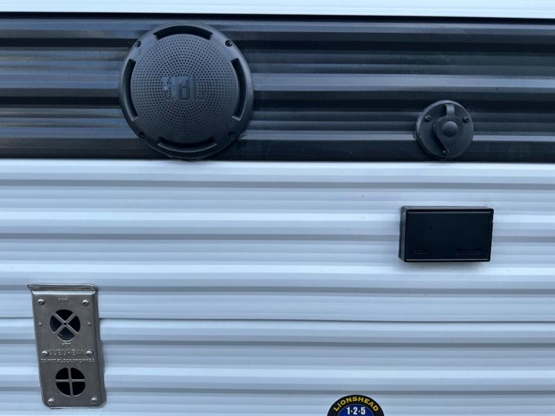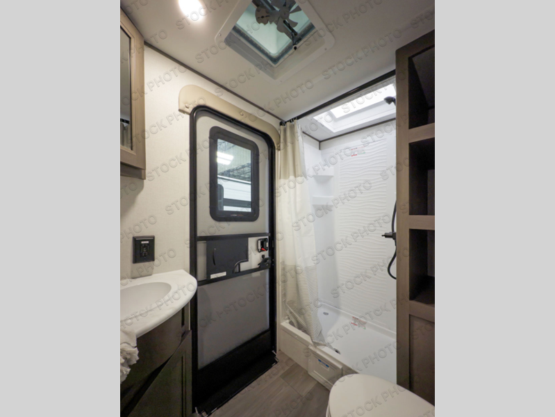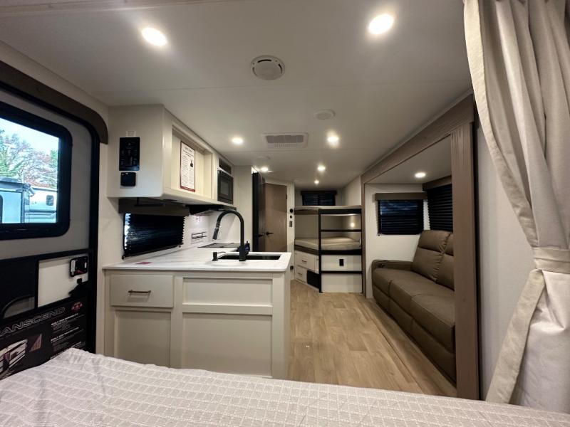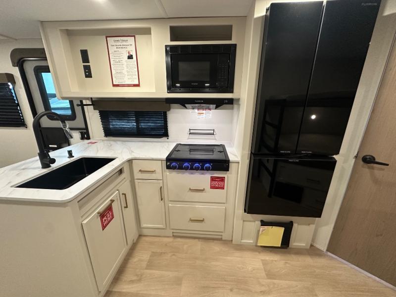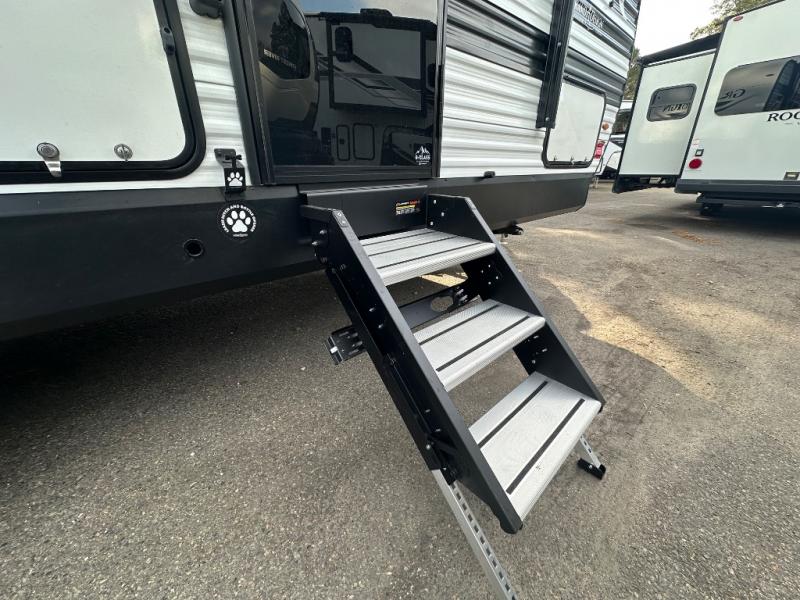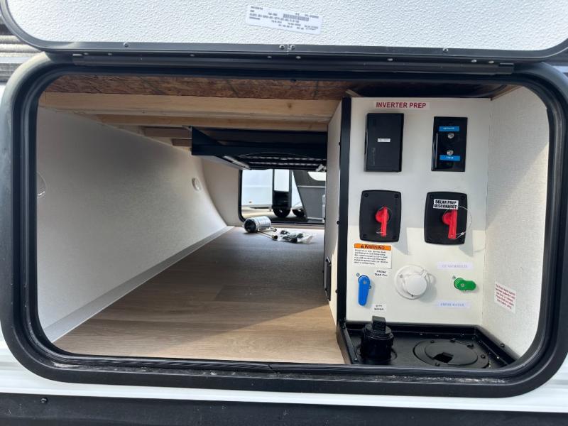 This fantastic travel trailer is designed to provide the ultimate in comfort, convenience, and adventure! The double-size bunk beds are perfect for kids, providing ample sleeping space and an under-bed storage space for all your belongings. The full bathroom features a linen closet, providing convenient storage for towels and toiletries. In the kitchen area, the U-shaped dinette is a great spot for creating memories that will last a lifetime, the refrigerator keeps your food and drinks fresh, while the microwave provides a quick and easy way to prepare meals. And for major convenience, the pull-out trash makes cleaning up a simple task. Take a nap in the comfortable front queen bed, which is a serene retreat, providing a comfortable spot to rest and relax. Jump to the exterior in a comfortable way with the double entry/exit door providing added convenience and flexibility, while the exterior awning provides shade and protection from the elements. The pass-through storage offers ample space for your outdoor gear and equipment.
