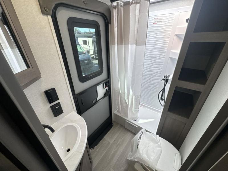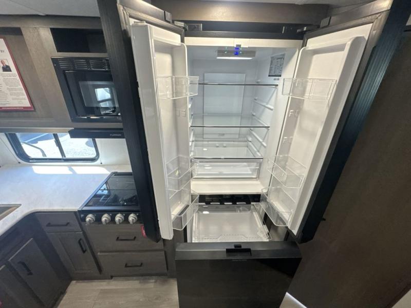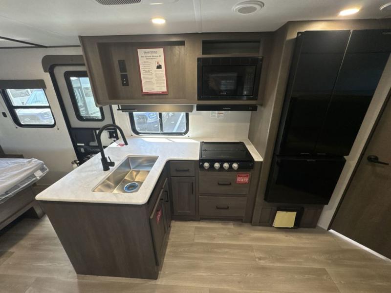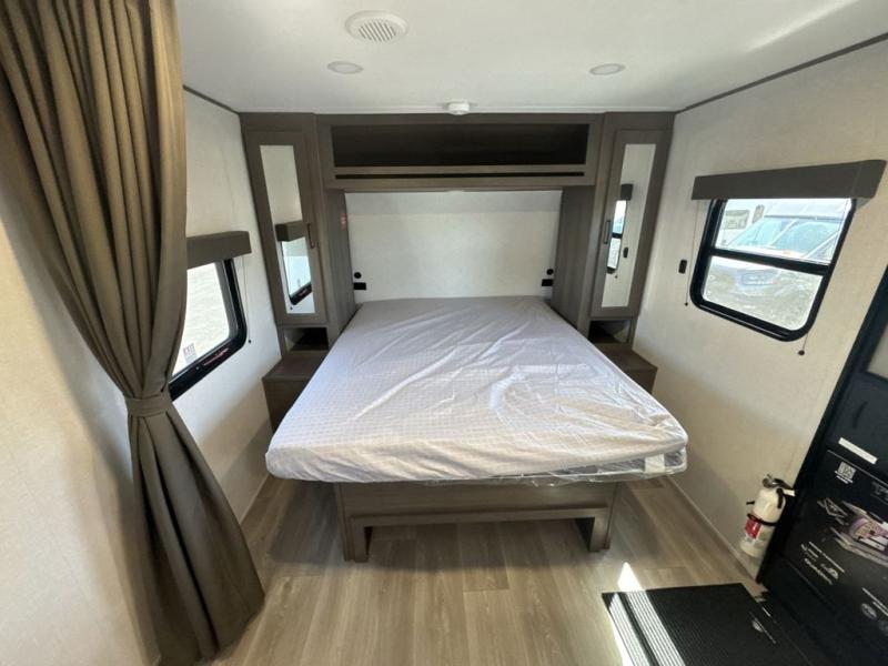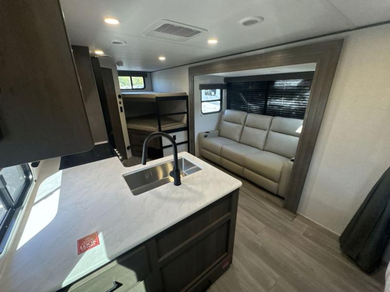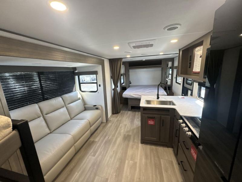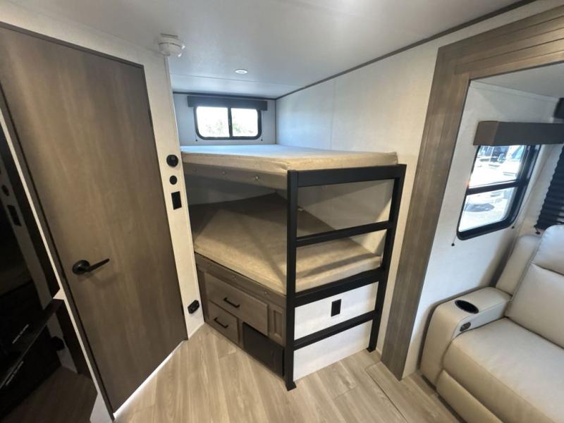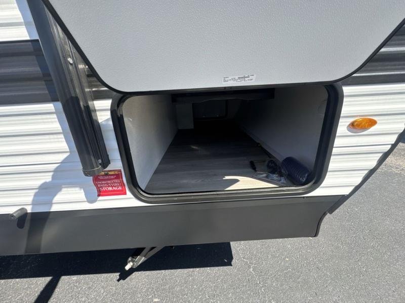 This fantastic travel trailer is designed to provide the ultimate in comfort, convenience, and adventure! The double-size bunk beds are perfect for kids, providing ample sleeping space and an under-bed storage space for all your belongings. The full bathroom features a linen closet, providing convenient storage for towels and toiletries. In the kitchen area, the U-shaped dinette is a great spot for creating memories that will last a lifetime, the refrigerator keeps your food and drinks fresh, while the microwave provides a quick and easy way to prepare meals. And for major convenience, the pull-out trash makes cleaning up a simple task. Take a nap in the comfortable front queen bed, which is a serene retreat, providing a comfortable spot to rest and relax. Jump to the exterior in a comfortable way with the double entry/exit door providing added convenience and flexibility, while the exterior awning provides shade and protection from the elements. The pass-through storage offers ample space for your outdoor gear and equipment.
