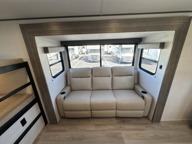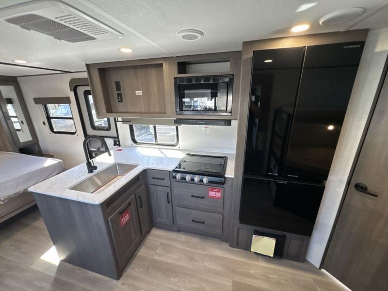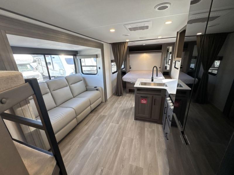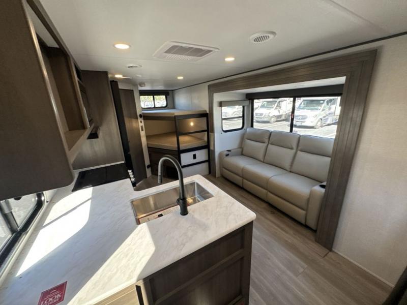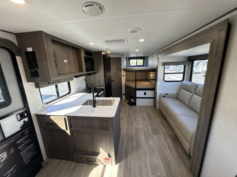 This fantastic travel trailer is designed to provide the ultimate in comfort, convenience, and adventure! The double-size bunk beds are perfect for kids, providing ample sleeping space and an under-bed storage space for all your belongings. The full bathroom features a linen closet, providing convenient storage for towels and toiletries. In the kitchen area, the U-shaped dinette is a great spot for creating memories that will last a lifetime, the refrigerator keeps your food and drinks fresh, while the microwave provides a quick and easy way to prepare meals. And for major convenience, the pull-out trash makes cleaning up a simple task. Take a nap in the comfortable front queen bed, which is a serene retreat, providing a comfortable spot to rest and relax. Jump to the exterior in a comfortable way with the double entry/exit door providing added convenience and flexibility, while the exterior awning provides shade and protection from the elements. The pass-through storage offers ample space for your outdoor gear and equipment.
