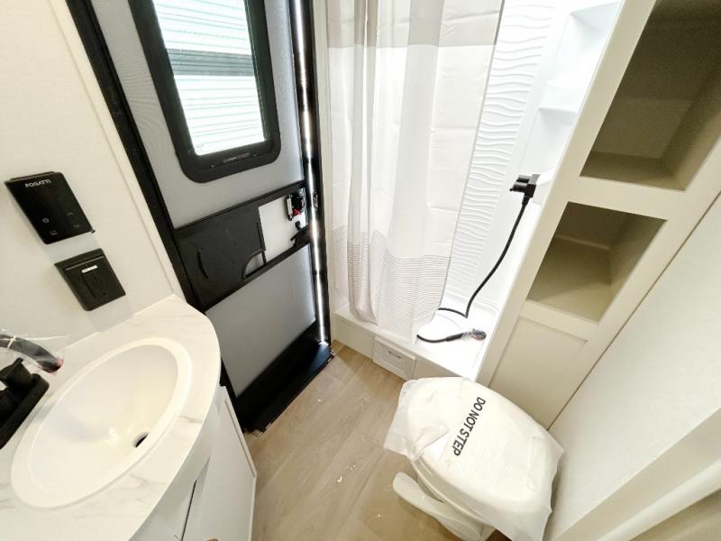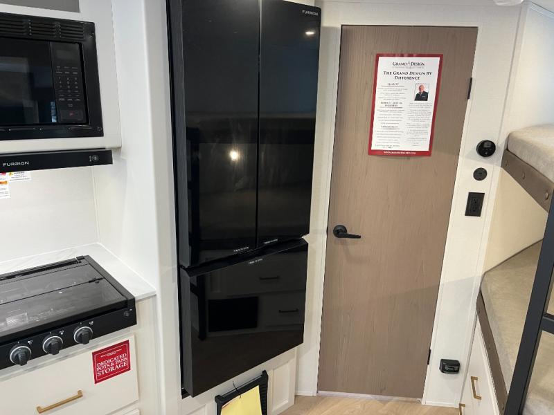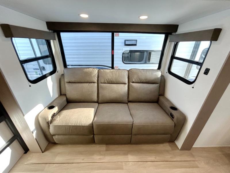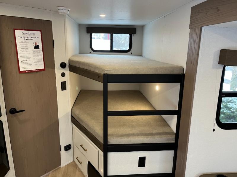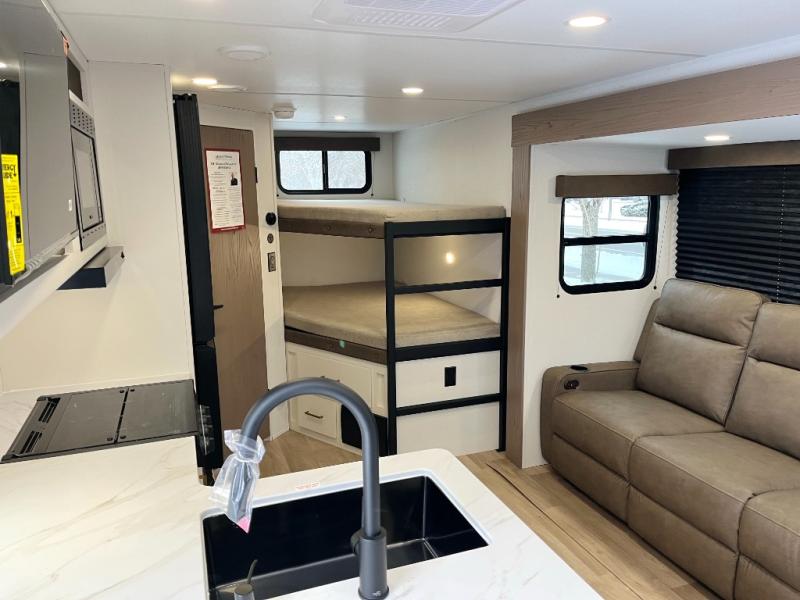 This fantastic travel trailer is designed to provide the ultimate in comfort, convenience, and adventure! The double-size bunk beds are perfect for kids, providing ample sleeping space and an under-bed storage space for all your belongings. The full bathroom features a linen closet, providing convenient storage for towels and toiletries. In the kitchen area, the theater dinette is a great spot for creating memories that will last a lifetime, the refrigerator keeps your food and drinks fresh, while the microwave provides a quick and easy way to prepare meals. And for major convenience, the pull-out trash makes cleaning up a simple task. Take a nap in the comfortable front queen bed, which is a serene retreat, providing a comfortable spot to rest and relax. Jump to the exterior in a comfortable way with the double entry/exit door providing added convenience and flexibility, while the exterior awning provides shade and protection from the elements. The pass-through storage offers ample space for your outdoor gear and equipment.