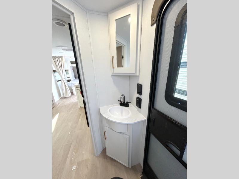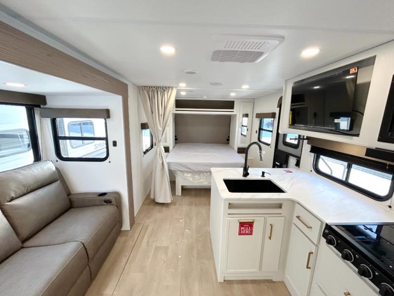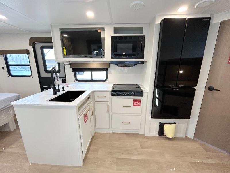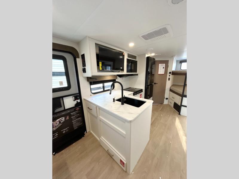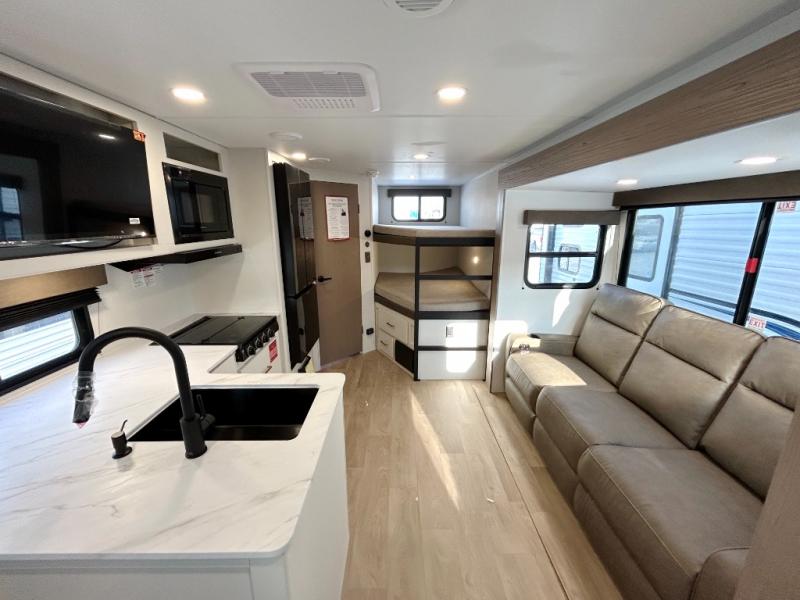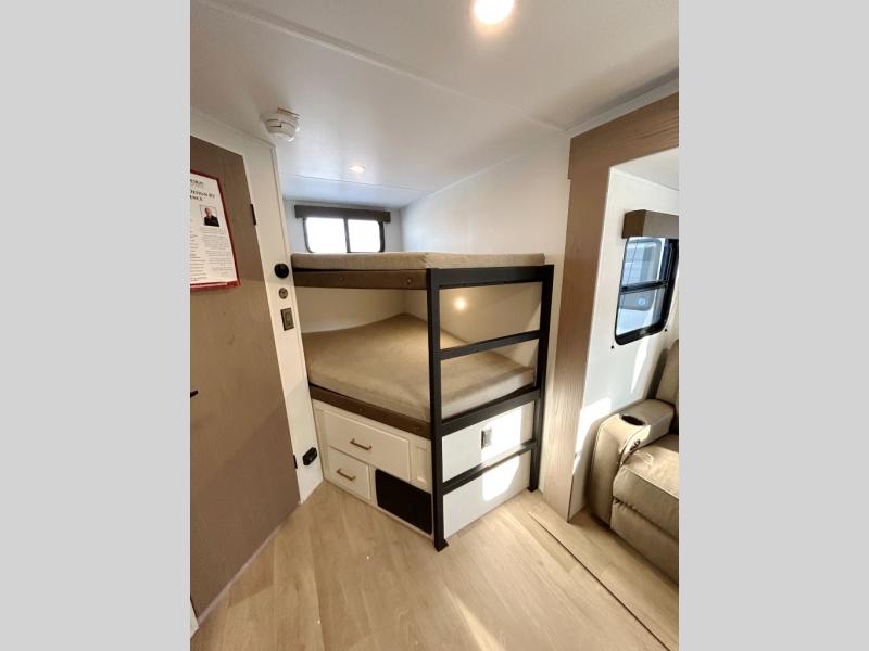 This fantastic travel trailer is designed to provide the ultimate in comfort, convenience, and adventure! The double-size bunk beds are perfect for kids, providing ample sleeping space and an under-bed storage space for all your belongings. The full bathroom features a linen closet, providing convenient storage for towels and toiletries. In the kitchen area, the theater dinette is a great spot for creating memories that will last a lifetime, the refrigerator keeps your food and drinks fresh, while the microwave provides a quick and easy way to prepare meals. And for major convenience, the pull-out trash makes cleaning up a simple task. Take a nap in the comfortable front queen bed, which is a serene retreat, providing a comfortable spot to rest and relax. Jump to the exterior in a comfortable way with the double entry/exit door providing added convenience and flexibility, while the exterior awning provides shade and protection from the elements. The pass-through storage offers ample space for your outdoor gear and equipment.