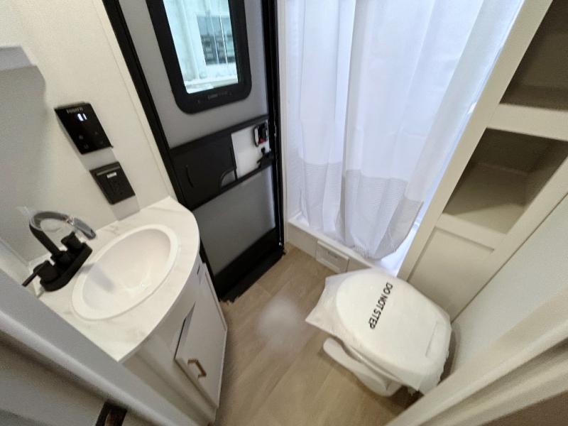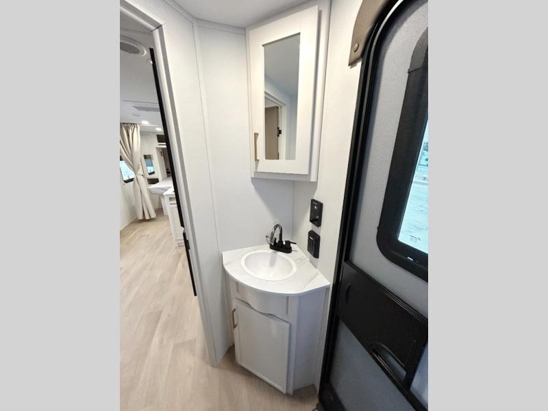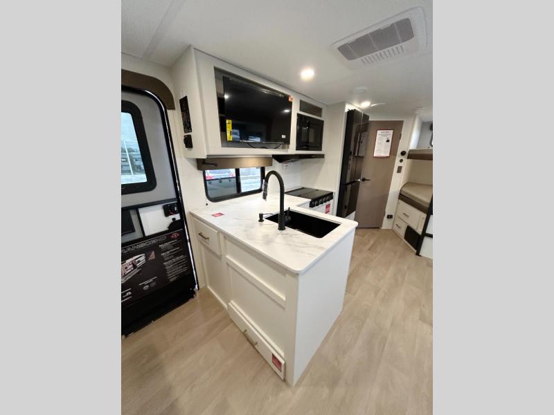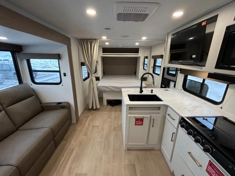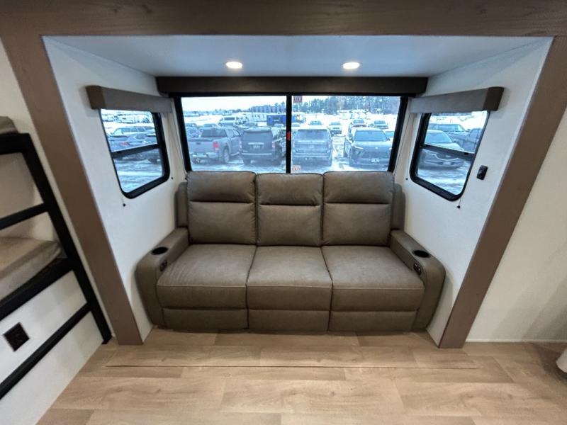 This fantastic travel trailer is designed to provide the ultimate in comfort, convenience, and adventure! The double-size bunk beds are perfect for kids, providing ample sleeping space and an under-bed storage space for all your belongings. The full bathroom features a linen closet, providing convenient storage for towels and toiletries. In the kitchen area, the theater dinette is a great spot for creating memories that will last a lifetime, the refrigerator keeps your food and drinks fresh, while the microwave provides a quick and easy way to prepare meals. And for major convenience, the pull-out trash makes cleaning up a simple task. Take a nap in the comfortable front queen bed, which is a serene retreat, providing a comfortable spot to rest and relax. Jump to the exterior in a comfortable way with the double entry/exit door providing added convenience and flexibility, while the exterior awning provides shade and protection from the elements. The pass-through storage offers ample space for your outdoor gear and equipment.