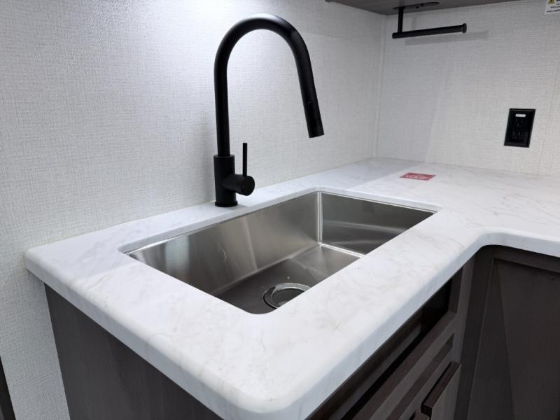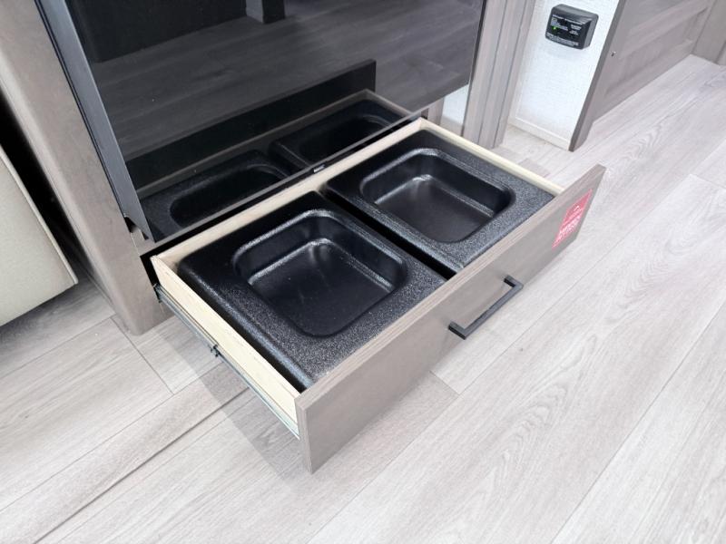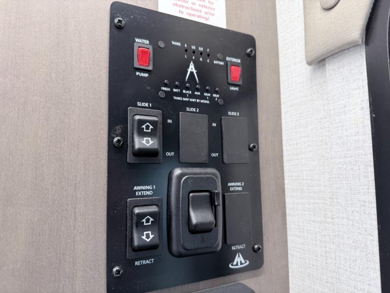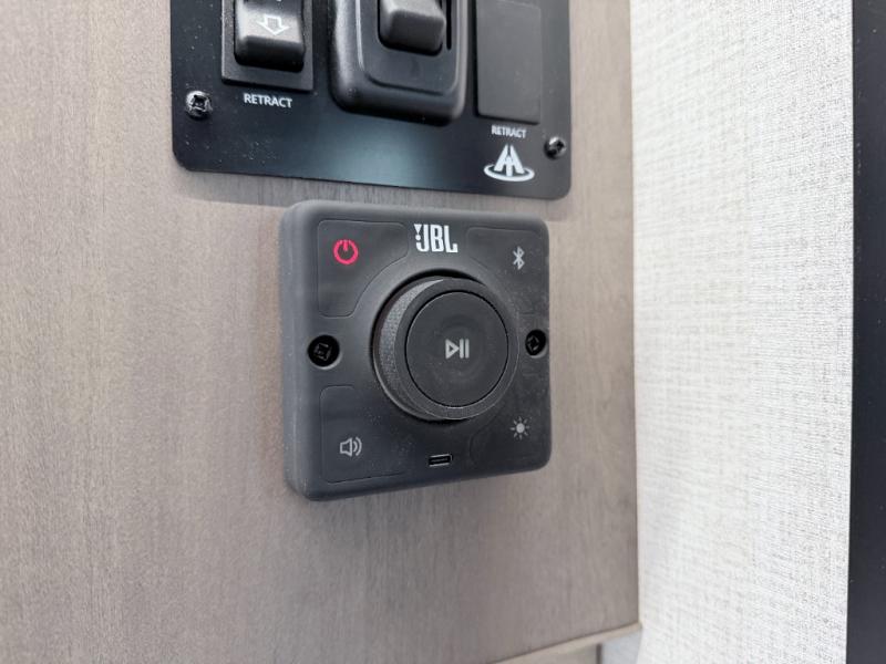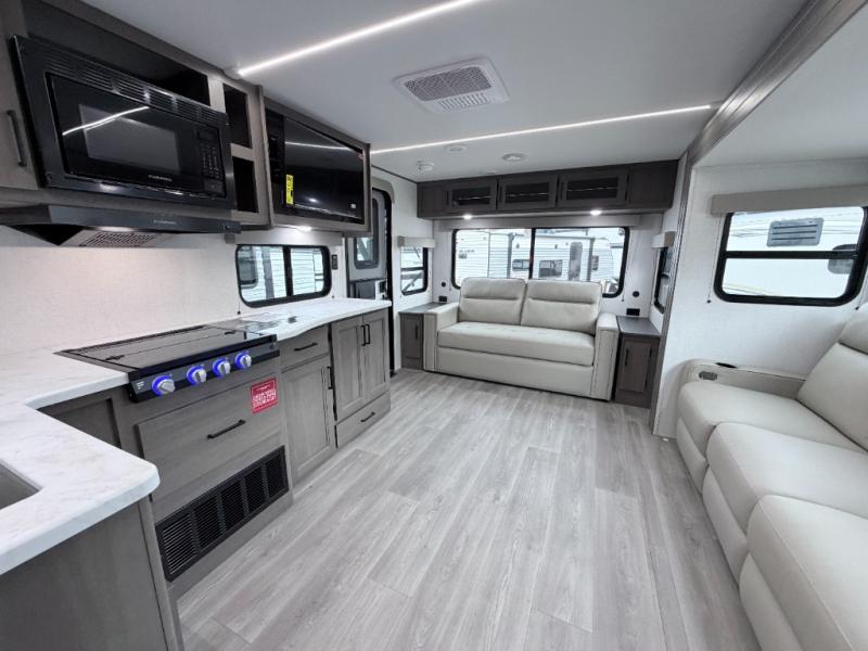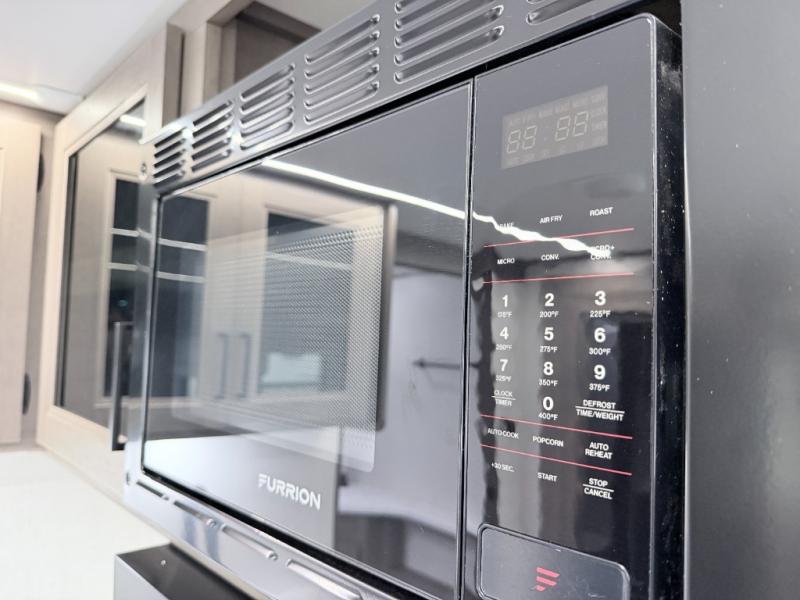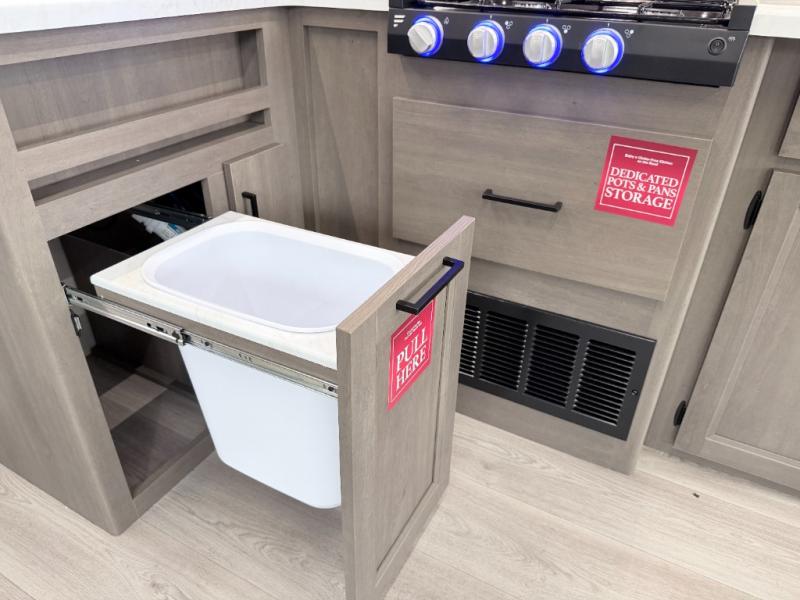 Enjoy meals inside or outside with a fully equipped kitchen featuring a three-burner cooktop, convection microwave/air fryer combo, and seamless countertops. Step outdoors to use the exterior griddle and 1.7 cu. ft. refrigerator—ideal for quick breakfasts or evening cookouts beneath the 17' power awning with LED lighting.