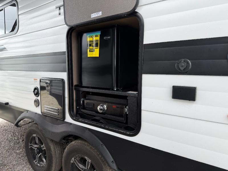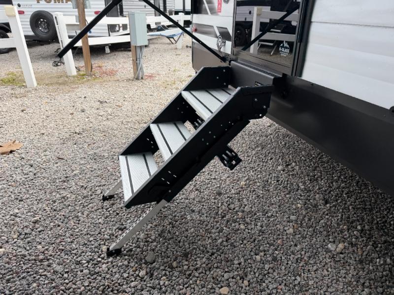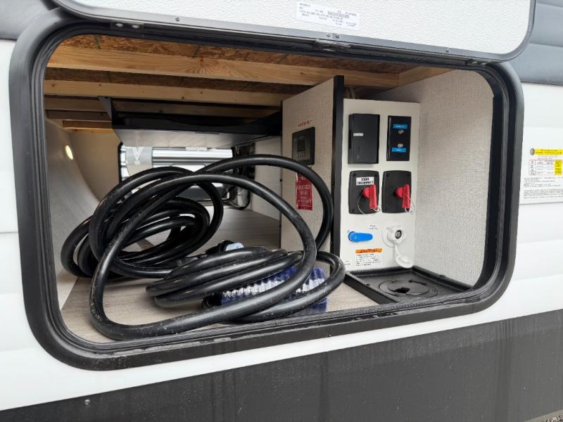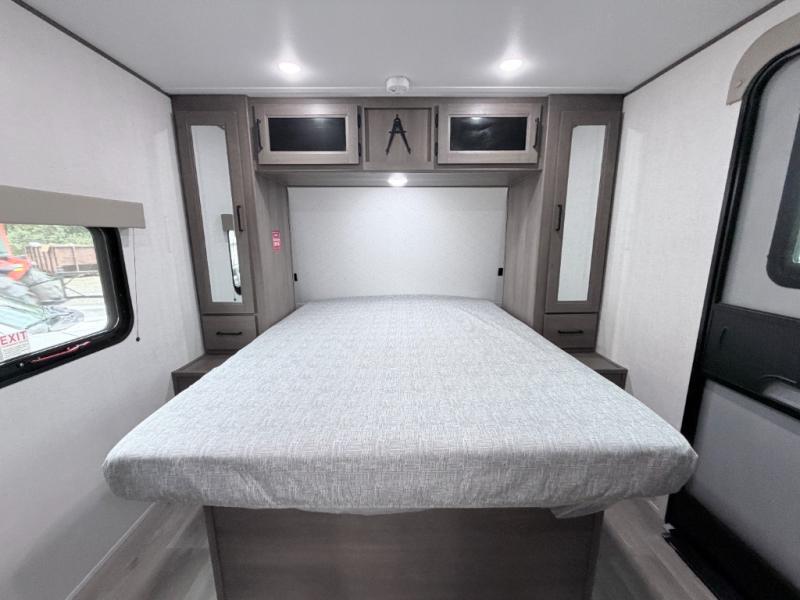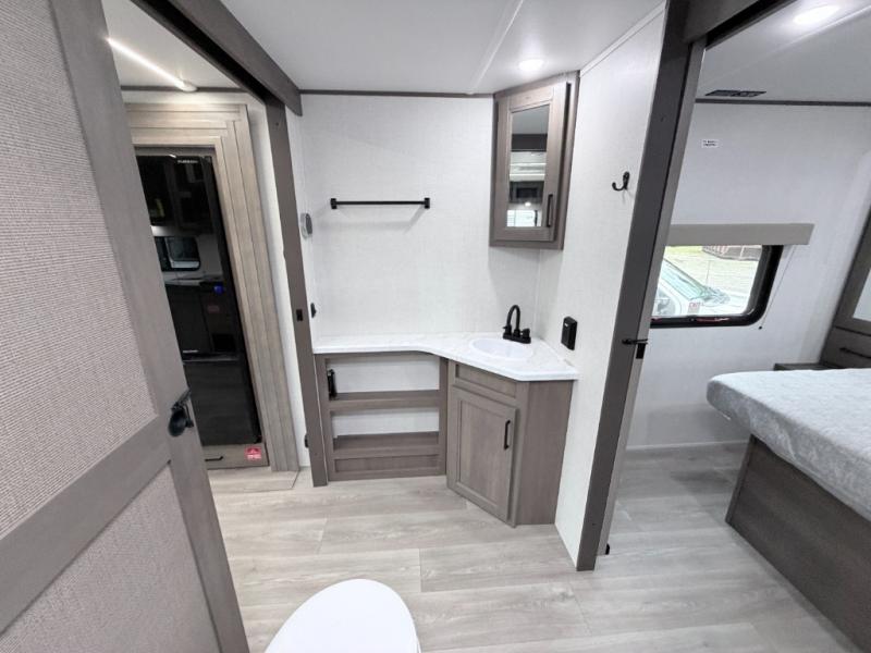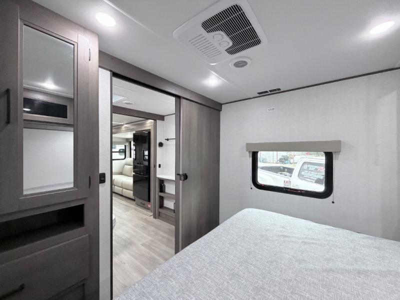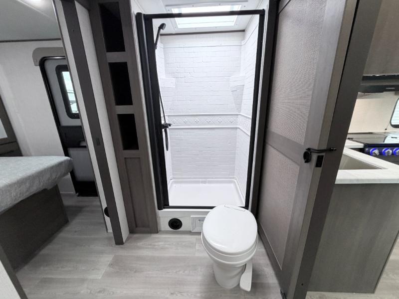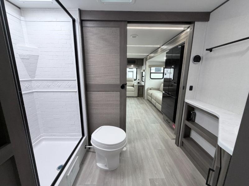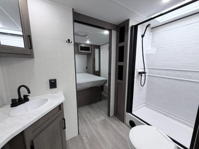 The walk-through bath allows easy access from both the living area and the front private bedroom. Inside the bedroom, you'll enjoy a comfortable queen bed, TV prep, overhead storage, and a private entry door for added convenience.