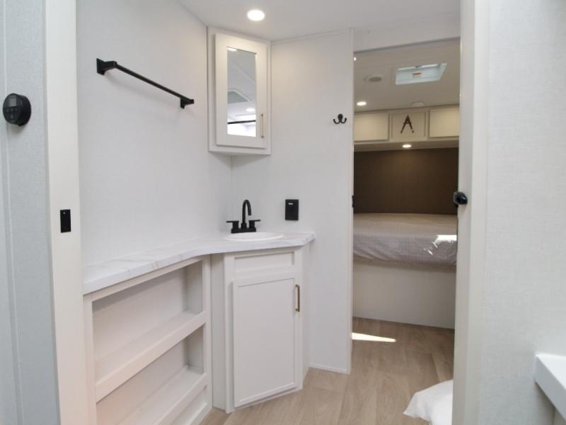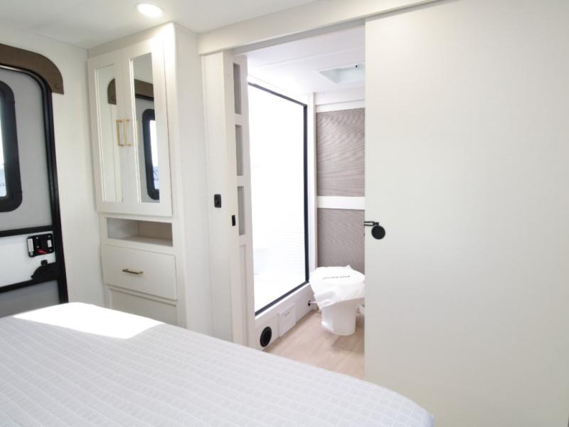 Walk-thru bathroom with easy access from both the living area and bedroom