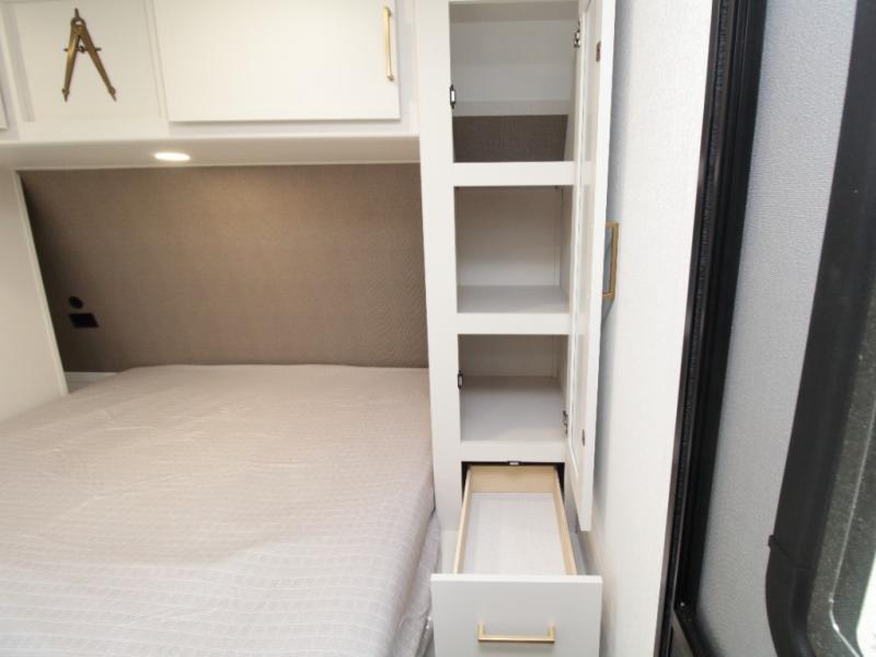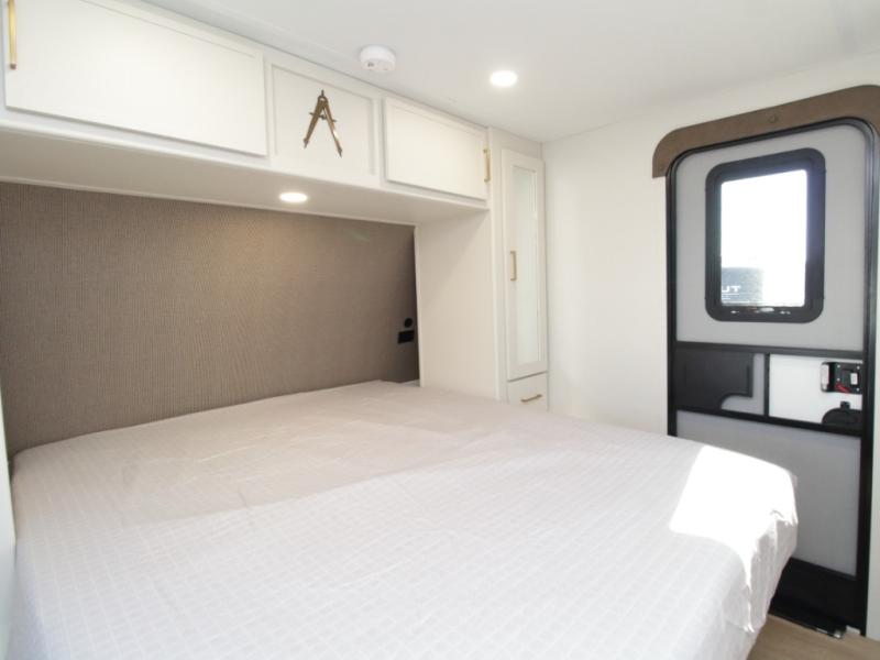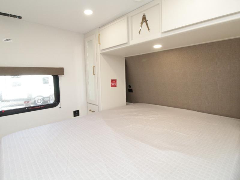 Front master bedroom featuring a queen bed, ample storage, and TV prep
