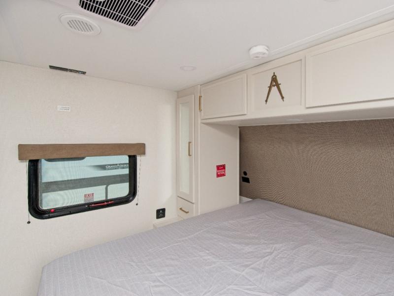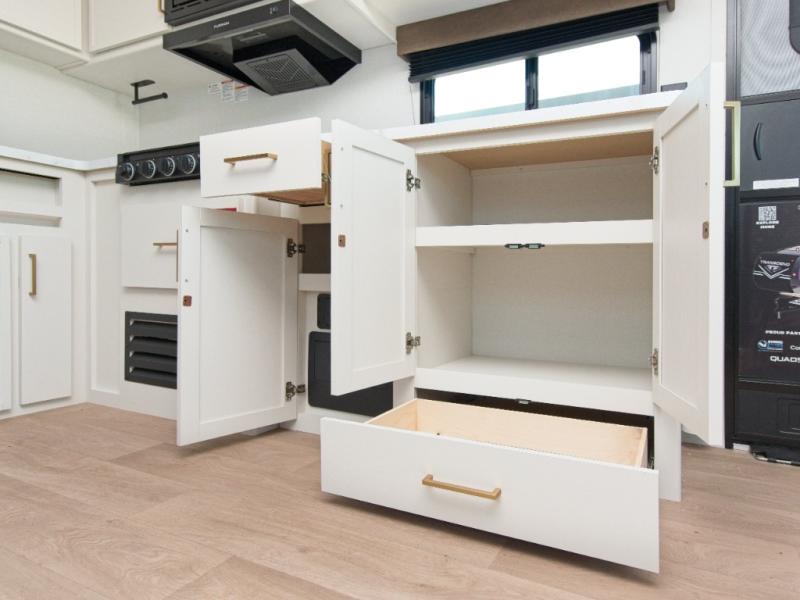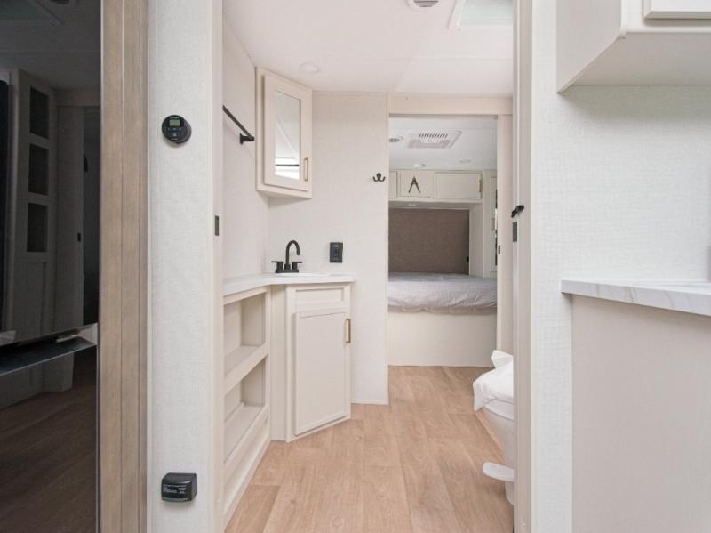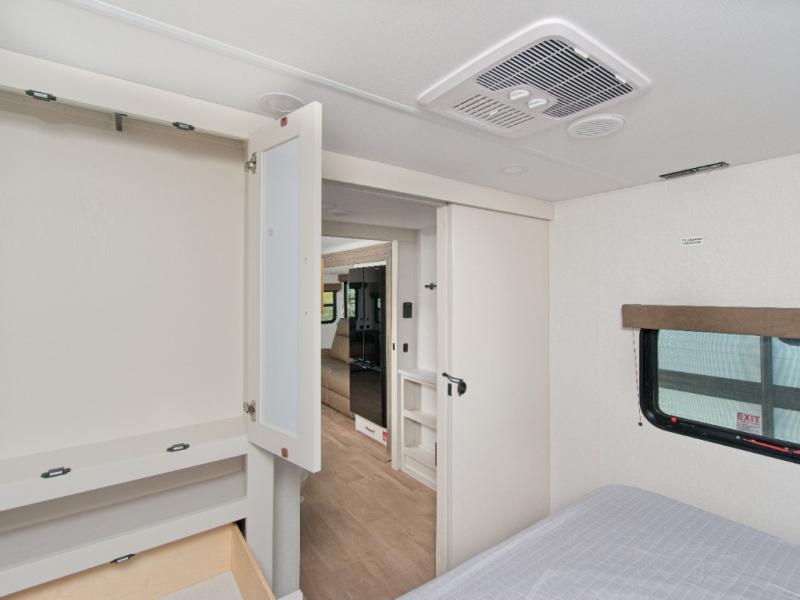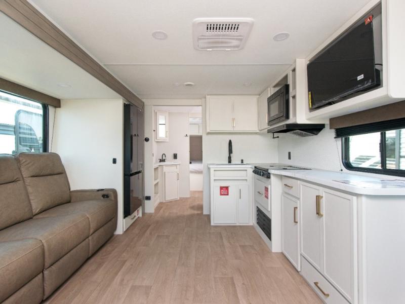 the amount of interior space you have in the living area thanks to the U-shaped dinette slide, which can be switched out for optional theater seats. The rear 70" sleeper sofa will be perfect for guests to sleep on, and the 32" TV lets you enjoy movie nights. There is a three burner range and convection microwave/combo air fryer to cook meals inside, or you can cook on the exterior griddle with a 1.7 cu. ft. refrigerator. And the 17' power awning will provide much wanted shade as you visit with friends. Back inside, the walk-thru bath is both spacious and convenient since it can be accessed from the main living area and the front master bedroom. Here, you'll find a queen bed, storage space, plus TV prep if you want to add a television. You even have your own exterior entry door for convenience!