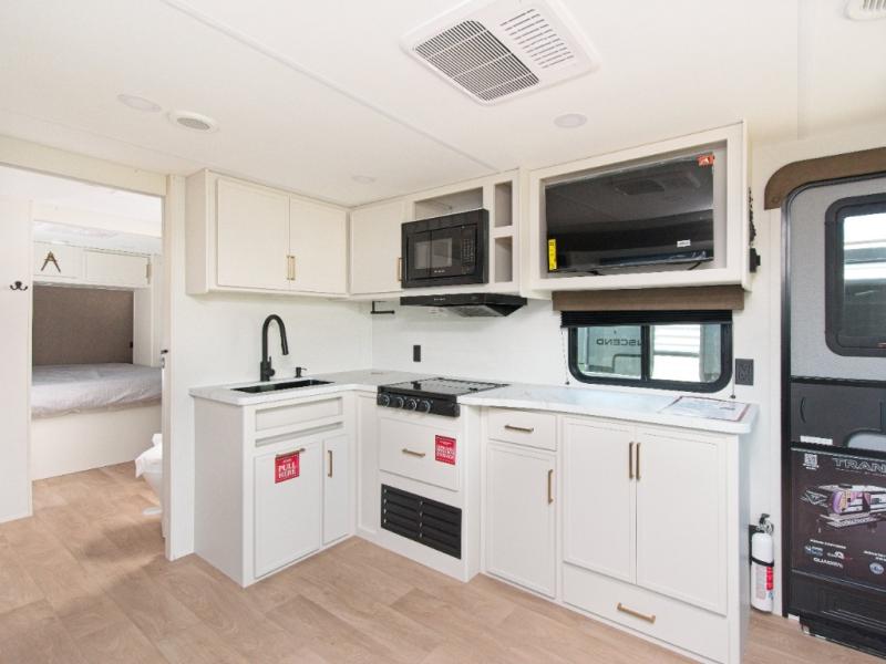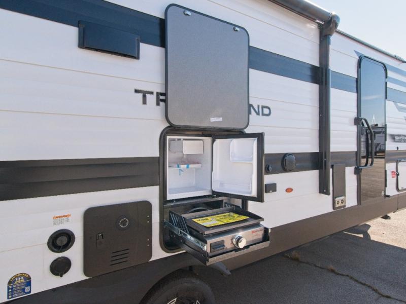 Adventure in style with the Transcend 245RLT, featuring a spacious U-shaped dinette slide and an outdoor kitchen setup with a griddle and fridge—perfect for relaxing indoors or cooking under the stars!