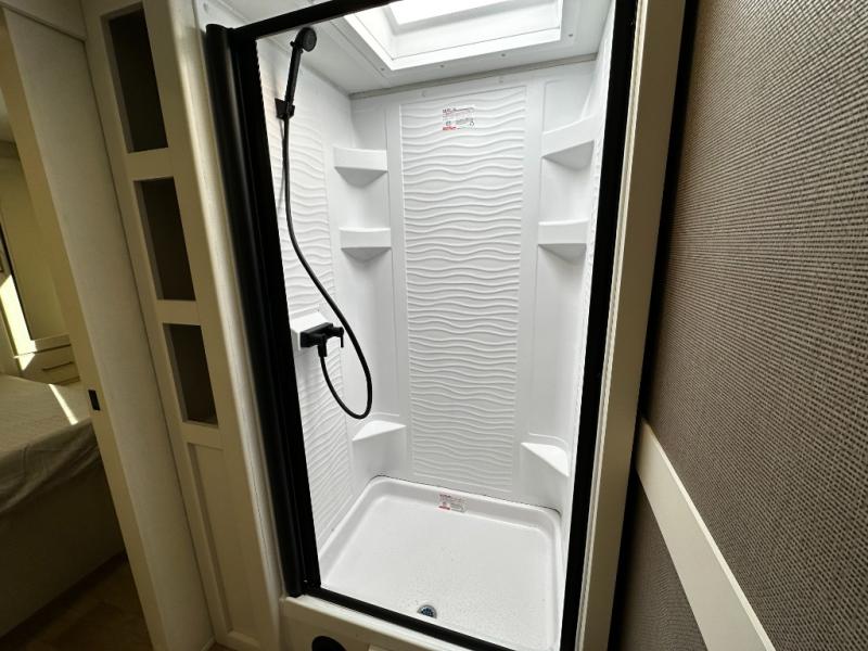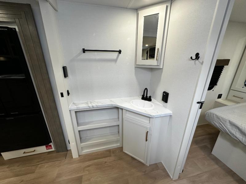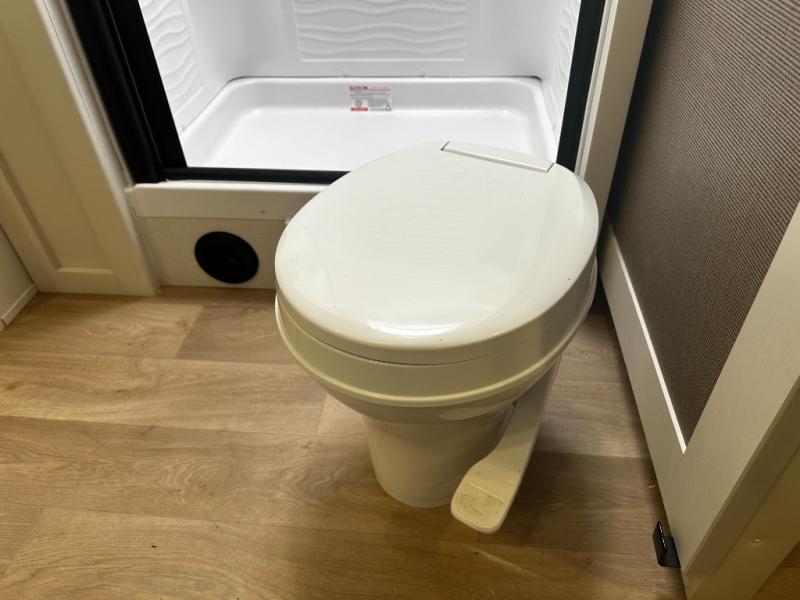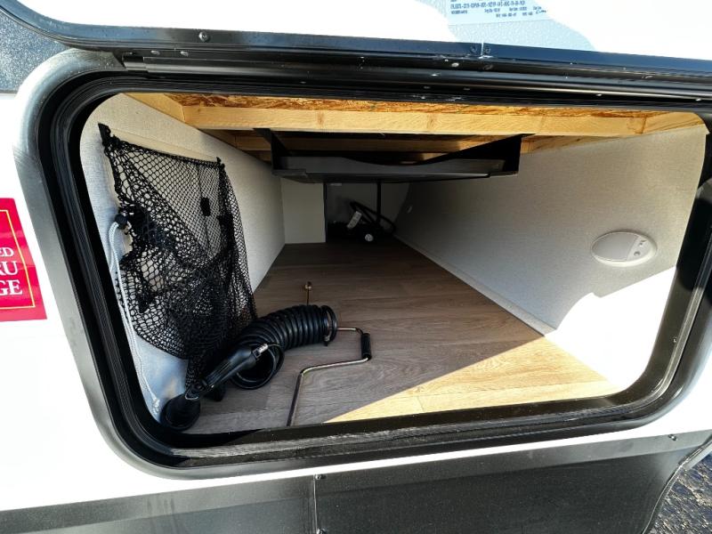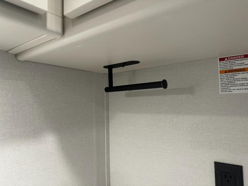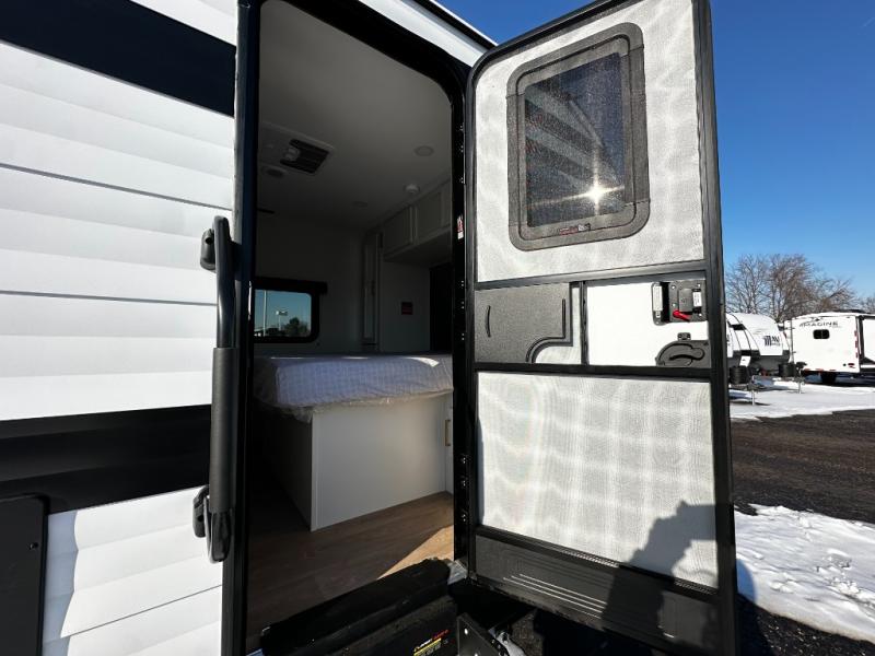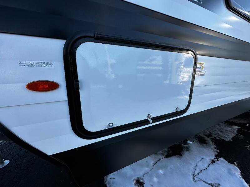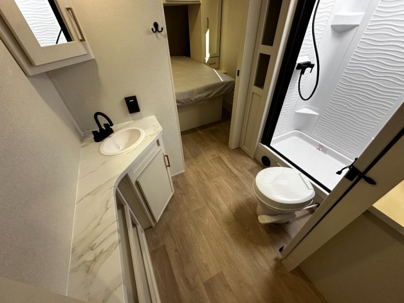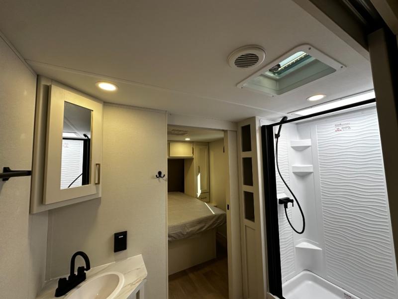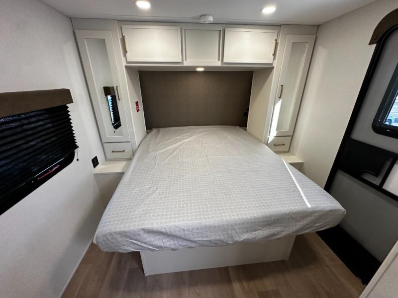 The dedicated bedroom offers a restful retreat with a cozy queen bed and wardrobe space to keep your clothes and essentials organized. A full bathroom with a roomy shower and practical storage keeps you refreshed no matter where your travels take you. Flexible sleeping options and smart storage solutions throughout the trailer make the 245RLT ideal for couples, small families, or weekend guests.