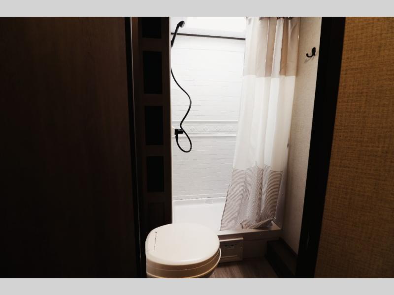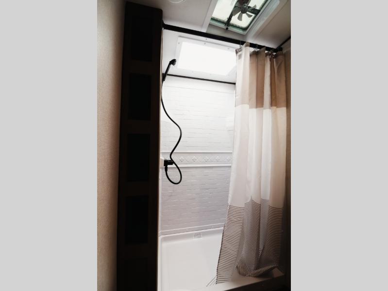 Bathroom: Walk-in shower with ABS surround, foot-flush toilet and power vent fan.