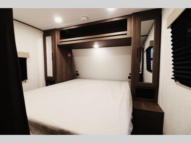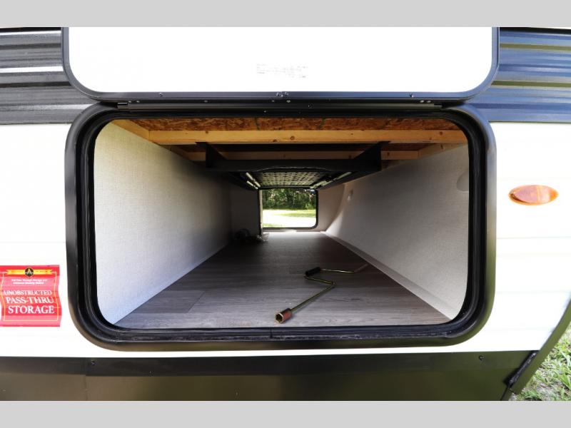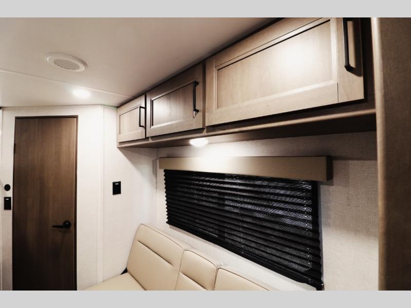 First-time RVers and couples benefit from easy setup features: 15' power awning with LED lighting, power tongue jack, motion-sensor lights, and all-in-one utility center.