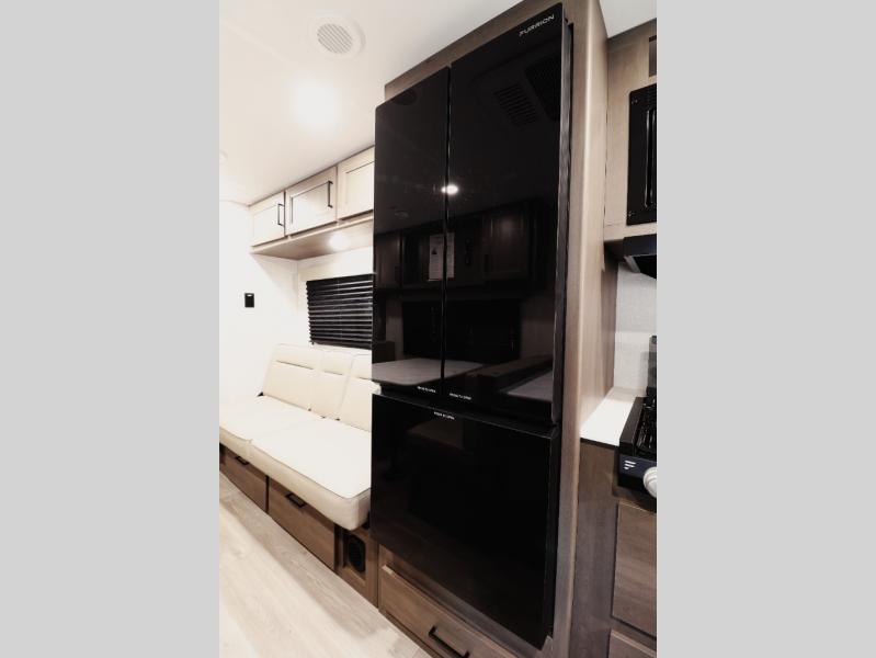 Kitchen: 10.7 cu ft 12V fridge, 3-burner range with oven, microwave, deep stainless sink, pull-out trash bin.