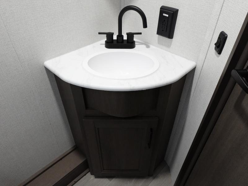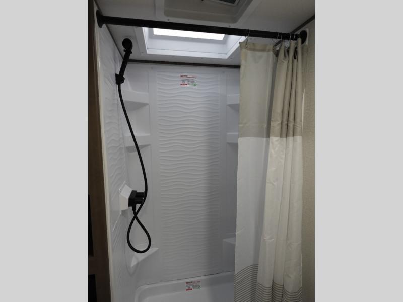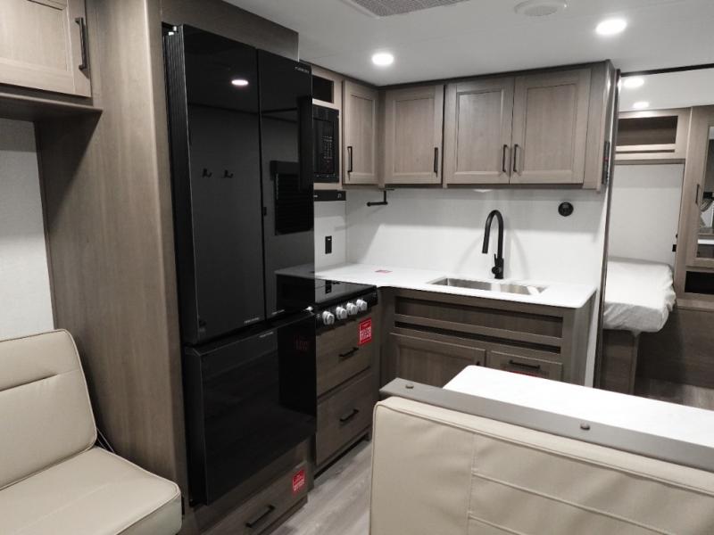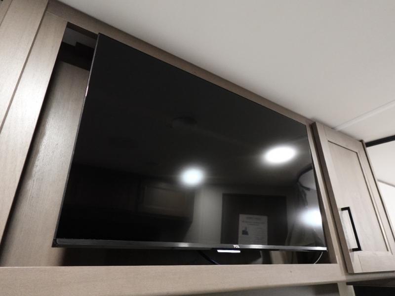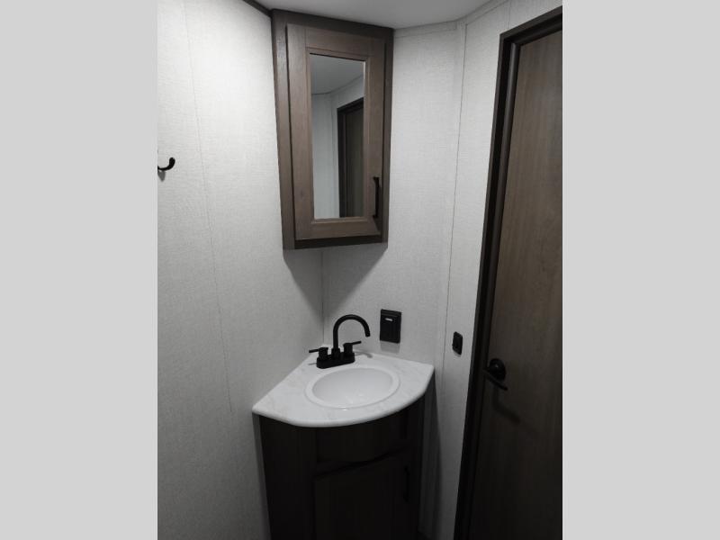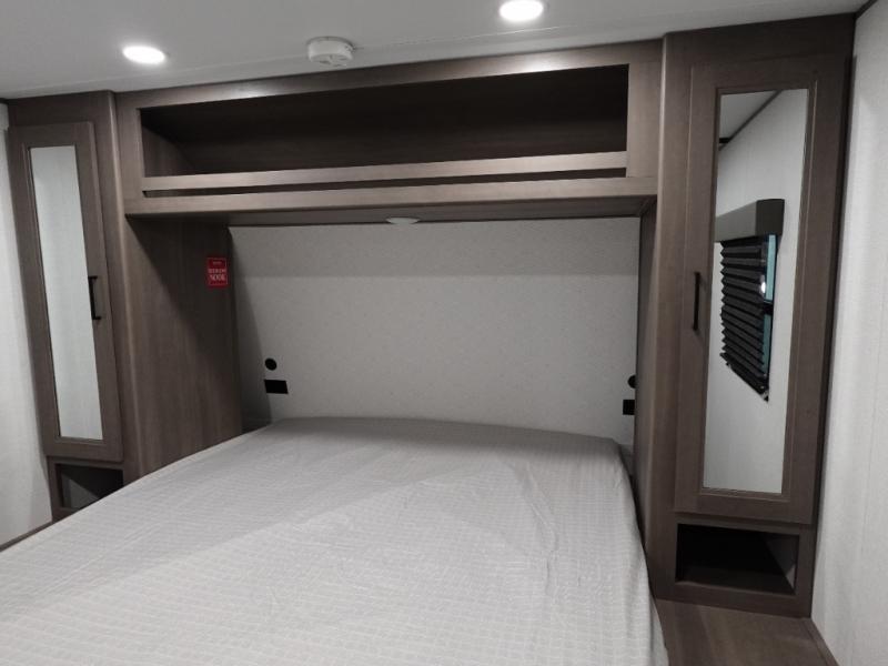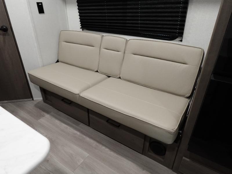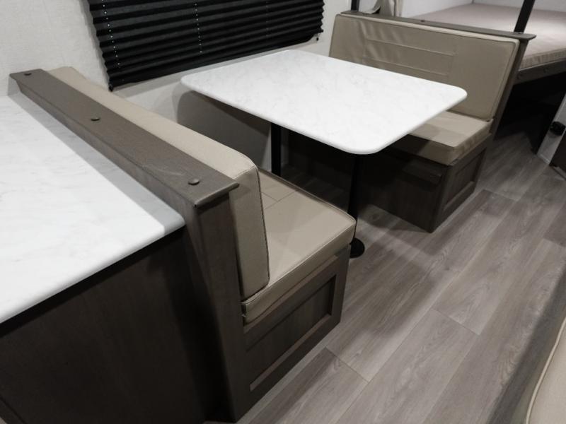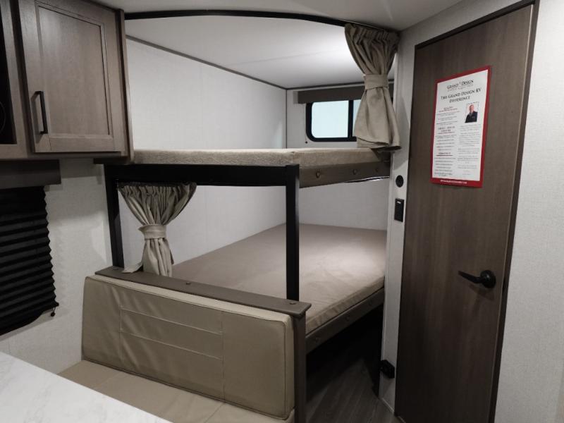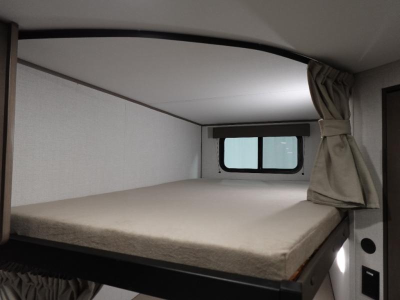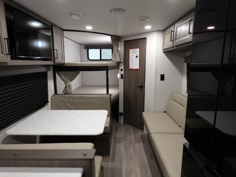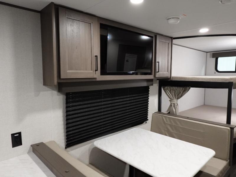 This is the perfect travel trailer if you like to camp with friends and family. Since there are double-size bunks, a queen bed in the front bedroom, plus a booth dinette and sofa, you can sleep eight campers each night! The three burner range and microwave in the kitchen will let you cook meals each day, and the 12V refrigerator will keep your cold items fresh. This model also includes a counter with extra storage underneath, a pull-out trash can storage for convenience, and a full bath to freshen up in each day. And you'll love having your own space in the front bedroom with a privacy curtain, dual wardrobes, and TV prep if you want to add a television!