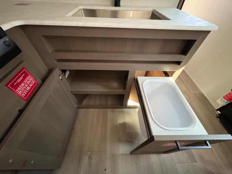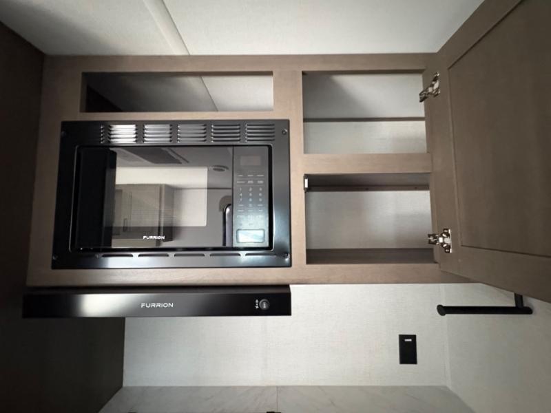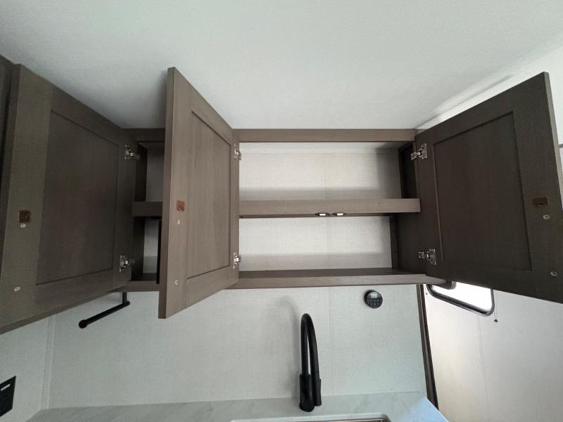 • Fully Equipped Kitchen – Three-burner cooktop, microwave, 12V refrigerator, and pull-out trash can storage for easy cleanup
