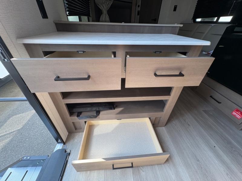 Like every Grand Design Transcend Xplor, the 24BHX is crafted with residential-quality materials and thoughtful touches—solid cabinet doors, upgraded furniture, and durable countertops mean this trailer feels like home wherever you park it. Multiple outlets and USB ports keep everyone charged and connected, while its sturdy build is ready for adventures both on and off the beaten path.