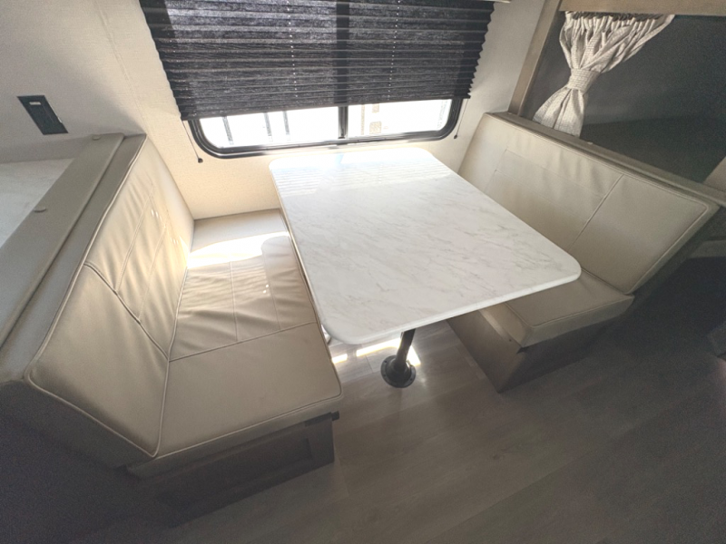 • Sleeps Up to Eight – Queen bed in the private front bedroom, double-size bunks with curtains, 69" rollover sofa, and convertible booth dinette