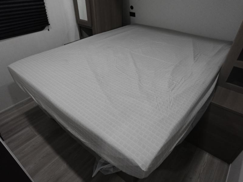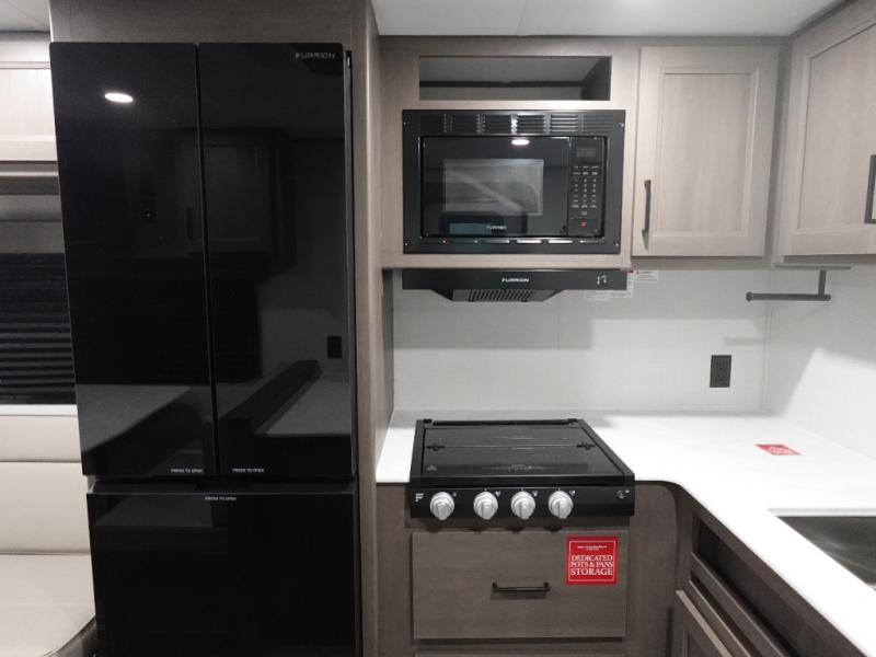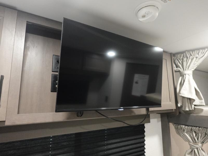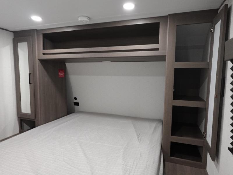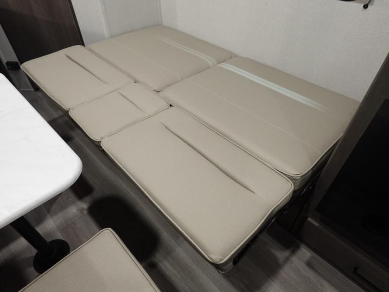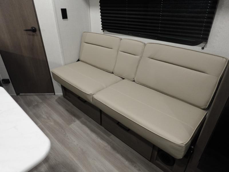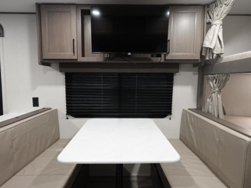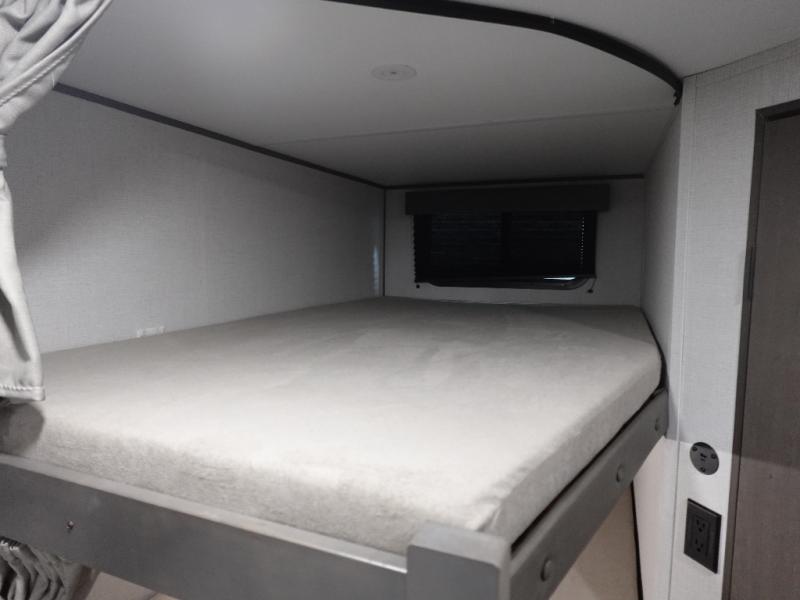 This is the perfect travel trailer if you like to camp with friends and family. Since there are double-size bunks, a queen bed in the front bedroom, plus a booth dinette and sofa, you can sleep eight campers each night! The three burner range and microwave in the kitchen will let you cook meals each day, and the 12V refrigerator will keep your cold items fresh. This model also includes a counter with extra storage underneath, a pull-out trash can storage for convenience, and a full bath to freshen up in each day. And you'll love having your own space in the front bedroom with a privacy curtain, dual wardrobes, and TV prep if you want to add a television!