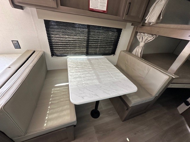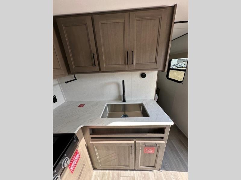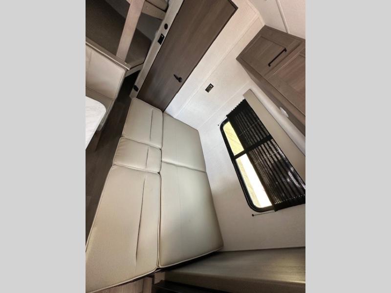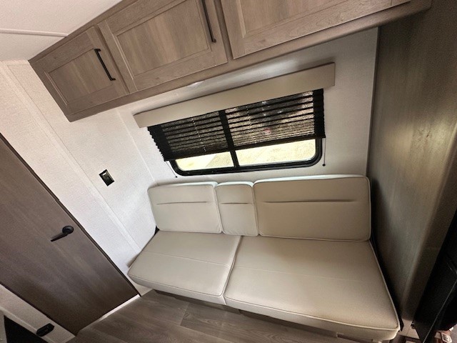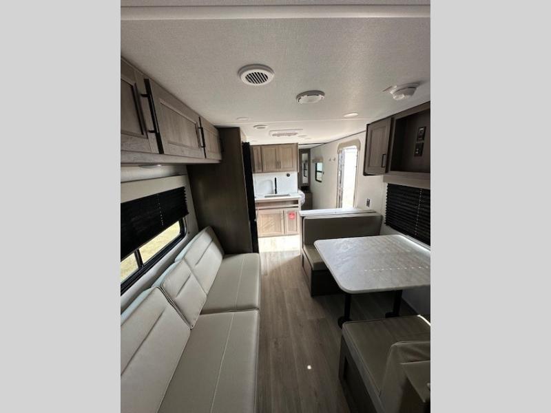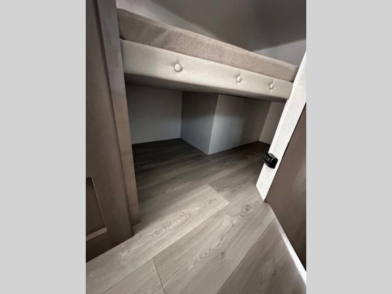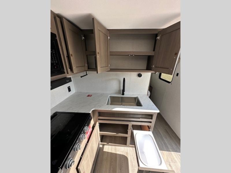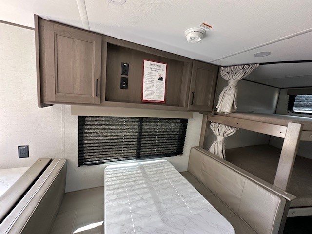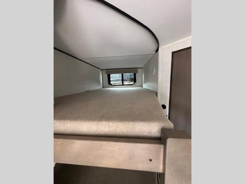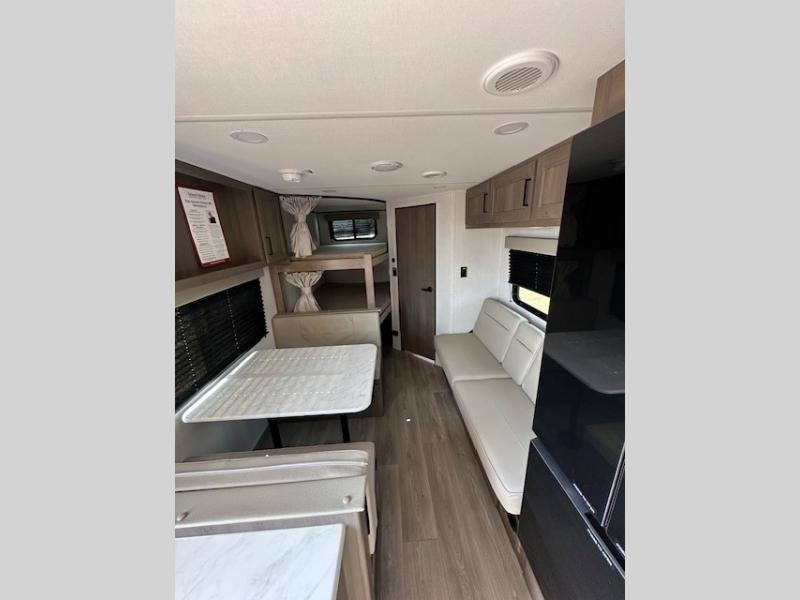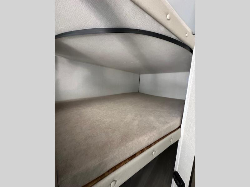 This is the perfect travel trailer if you like to camp with friends and family. Since there are double-size bunks, a queen bed in the front bedroom, plus a booth dinette and sofa, you can sleep eight campers each night! The three burner range and microwave in the kitchen will let you cook meals each day, and the 12V refrigerator will keep your cold items fresh. This model also includes a counter with extra storage underneath, a pull-out trash can storage for convenience, and a full bath to freshen up in each day. And you'll love having your own space in the front bedroom with a privacy curtain, dual wardrobes, and TV prep if you want to add a television!