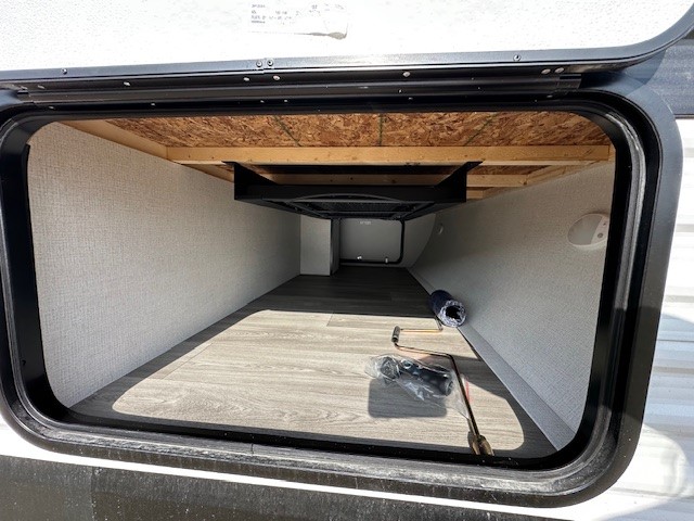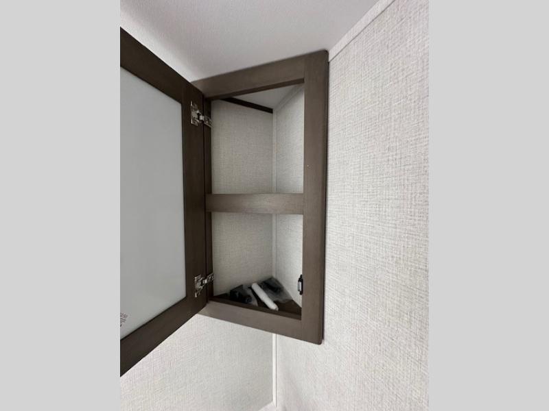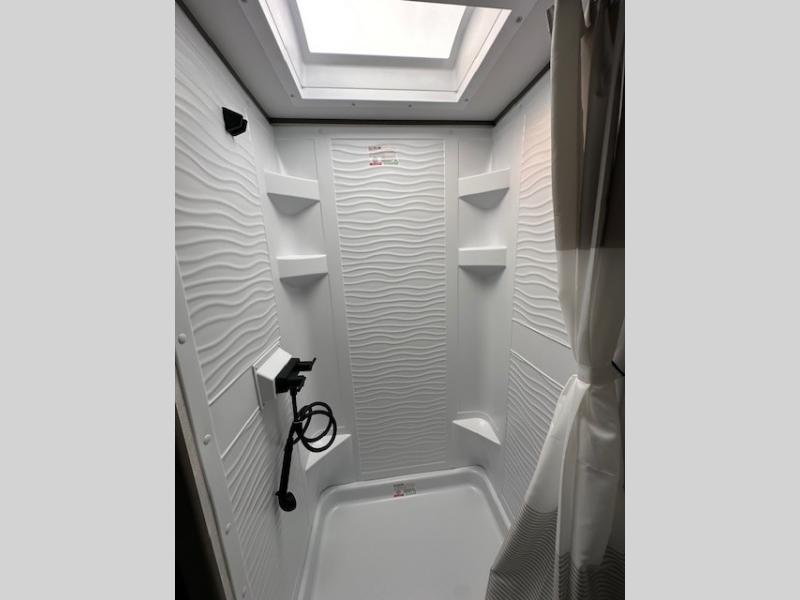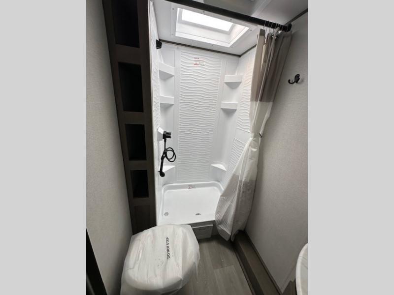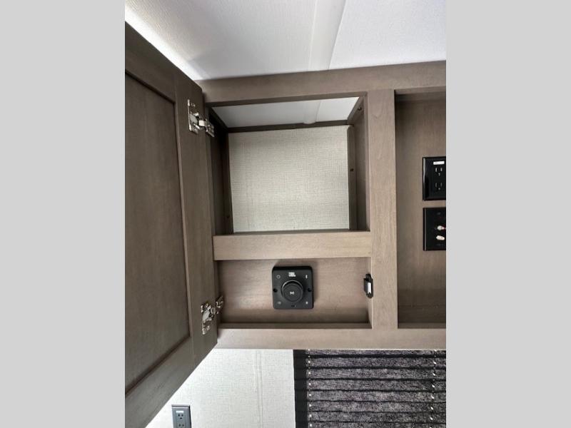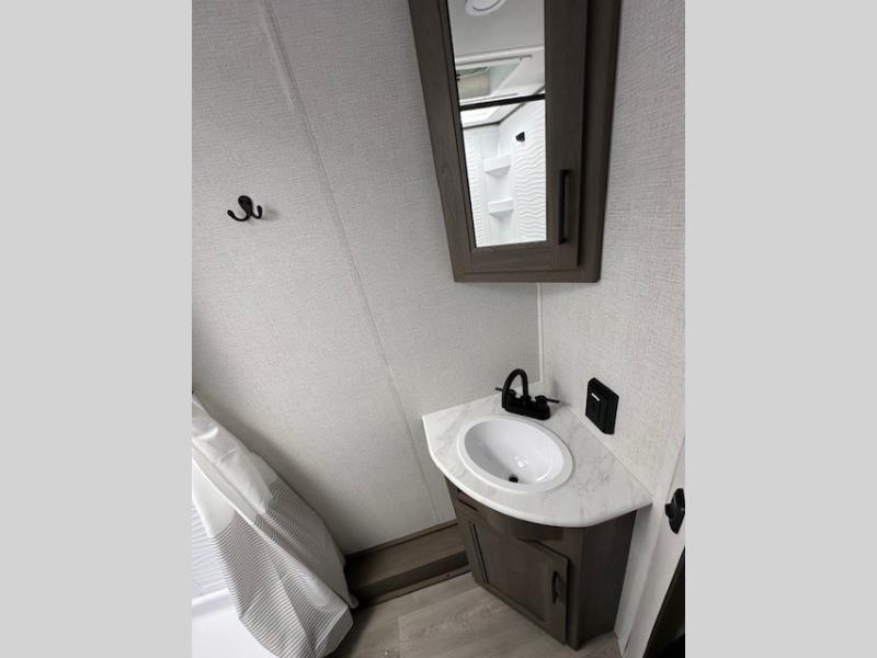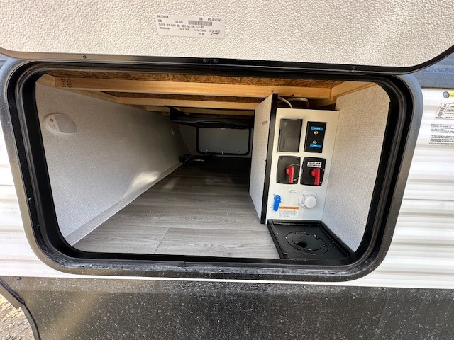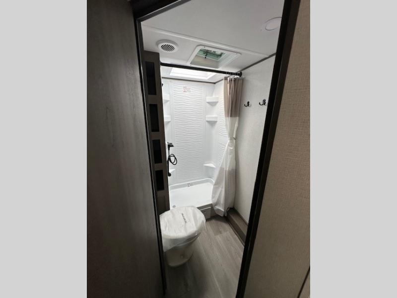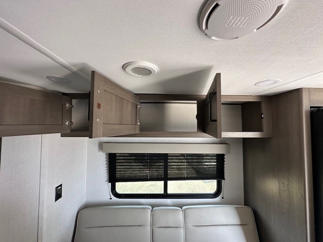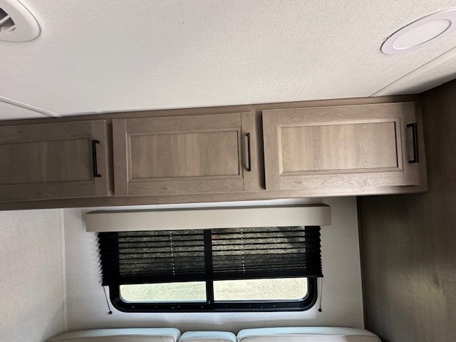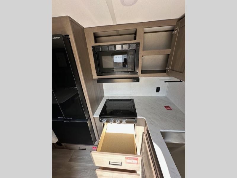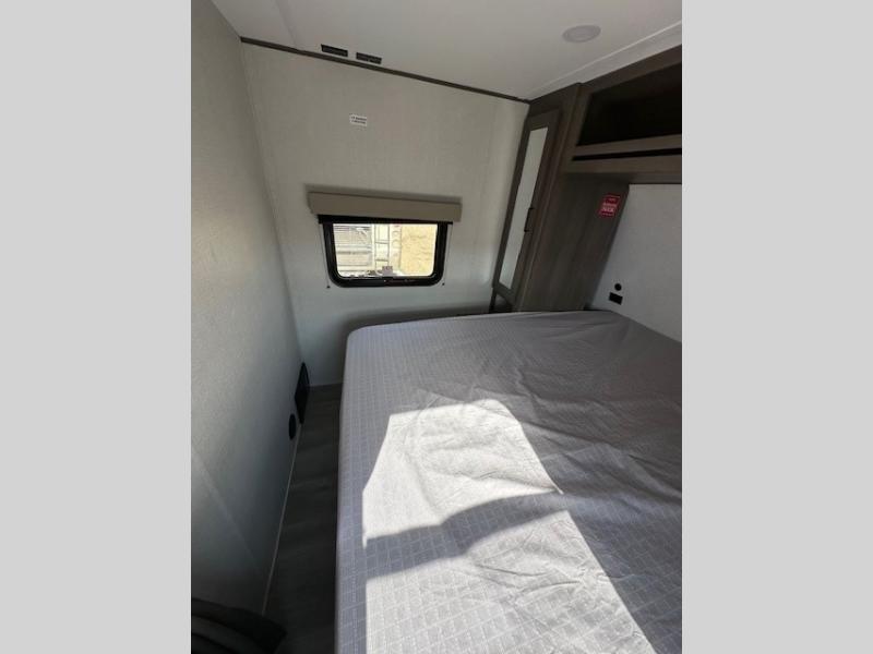 This is the perfect travel trailer if you like to camp with friends and family. Since there are double-size bunks, a queen bed in the front bedroom, plus a booth dinette and sofa, you can sleep eight campers each night! The three burner range and microwave in the kitchen will let you cook meals each day, and the 12V refrigerator will keep your cold items fresh. This model also includes a counter with extra storage underneath, a pull-out trash can storage for convenience, and a full bath to freshen up in each day. And you'll love having your own space in the front bedroom with a privacy curtain, dual wardrobes, and TV prep if you want to add a television!
