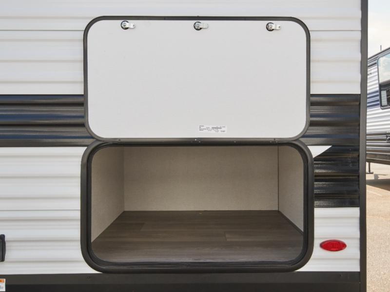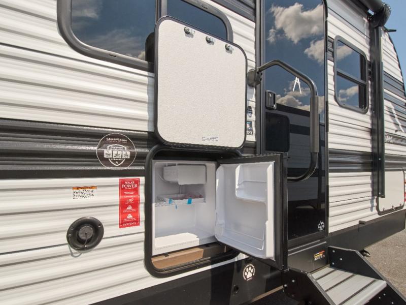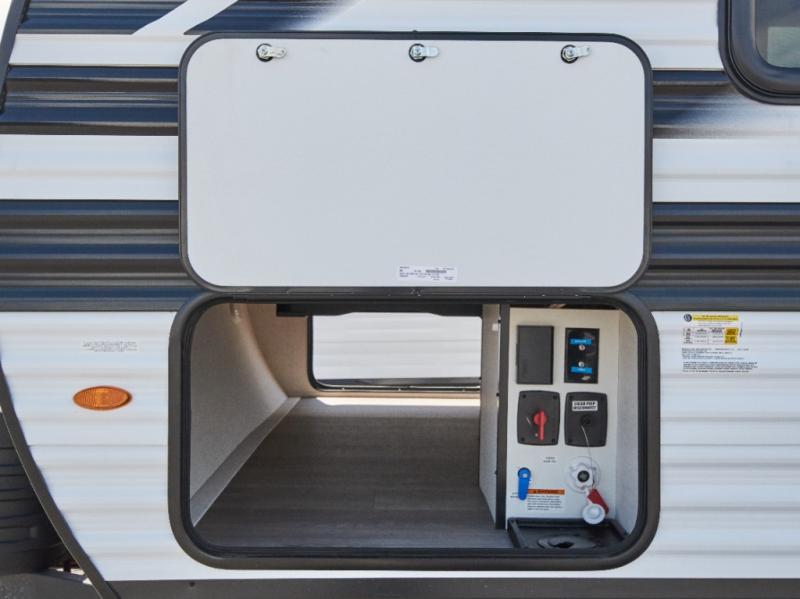 Designed with pet lovers in mind, the built-in pet dish keeps your furry companions happy. Outside, enjoy shade and ambiance under the 15' power awning with LED lighting, and take advantage of pass-through storage for all your gear.