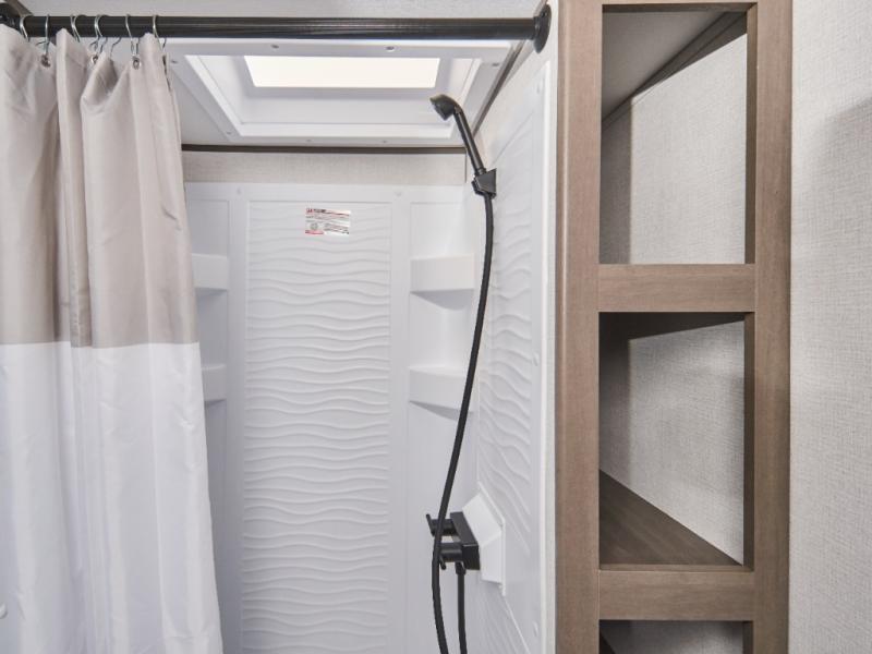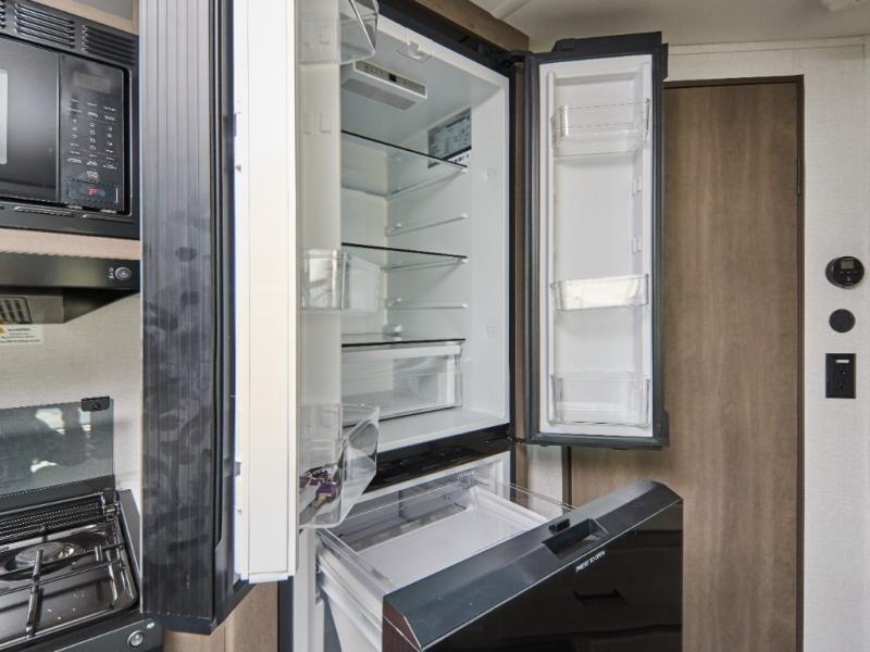 The fully equipped kitchen features a three-burner range, microwave, and a 12V refrigerator to keep meals fresh and easy. Thoughtful touches like a pull-out trash can and extra counter storage add everyday convenience, while the full bathroom ensures you stay refreshed on the road. The front bedroom offers privacy with a curtain, dual wardrobes, and TV prep for added entertainment.