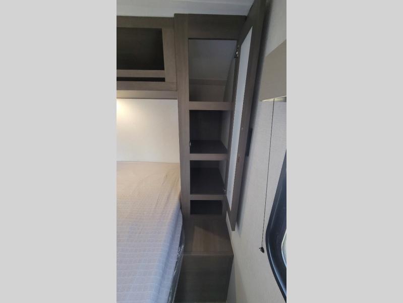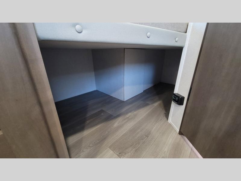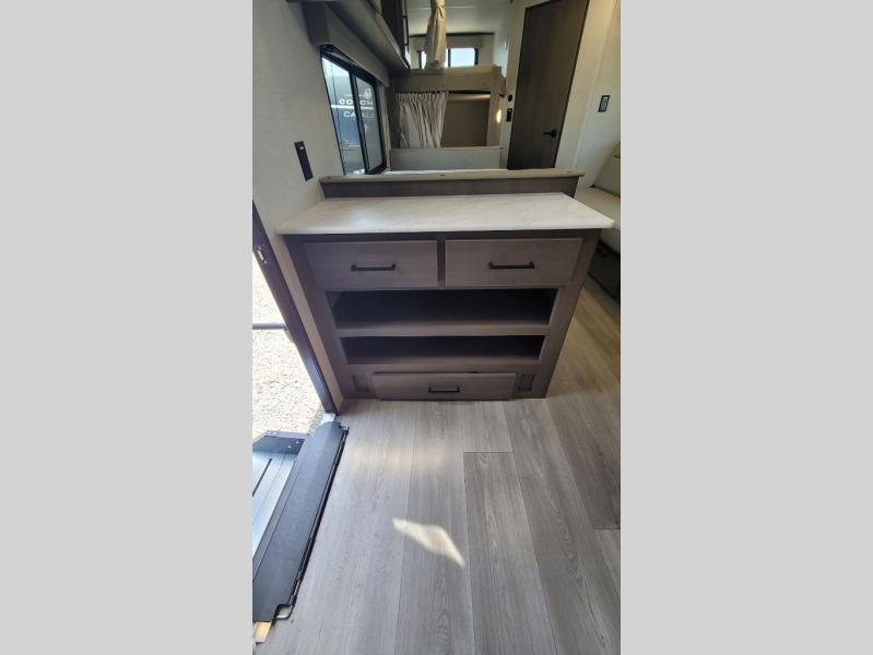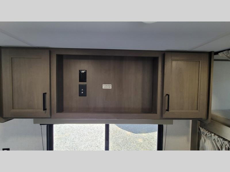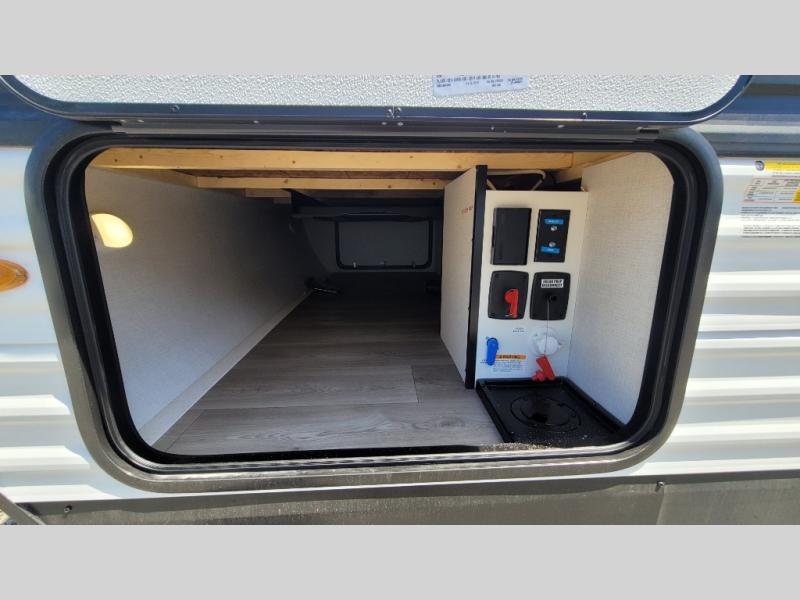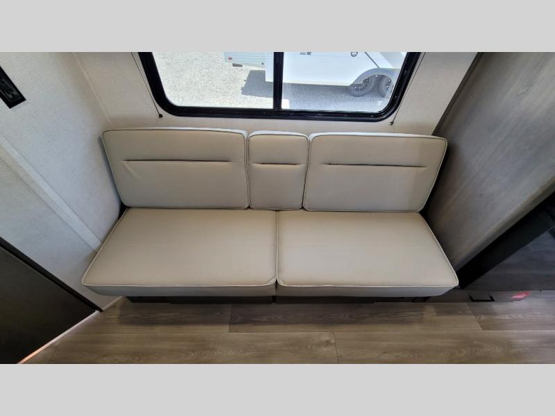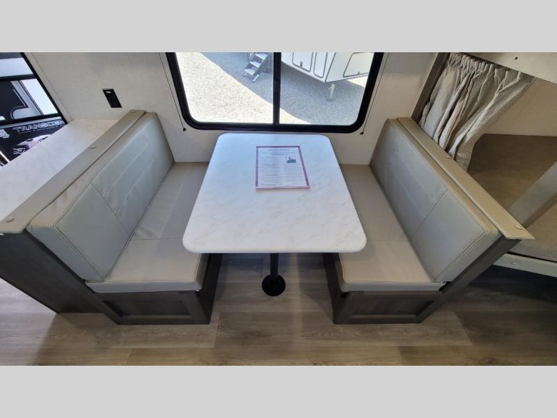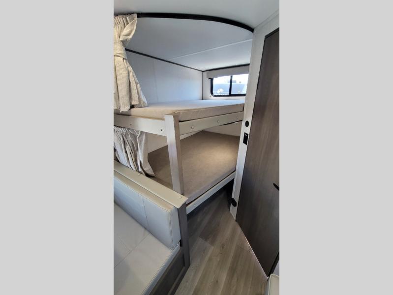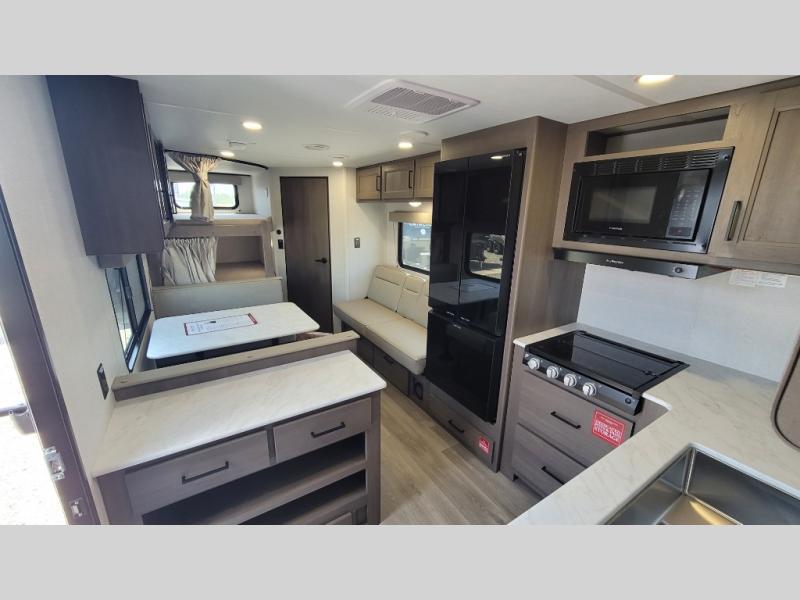 This is the perfect travel trailer if you like to camp with friends and family. Since there are double-size bunks, a queen bed in the front bedroom, plus a booth dinette and sofa, you can sleep eight campers each night! The three burner range and microwave in the kitchen will let you cook meals each day, and the 12V refrigerator will keep your cold items fresh. This model also includes a counter with extra storage underneath, a pull-out trash can storage for convenience, and a full bath to freshen up in each day. And you'll love having your own space in the front bedroom with a privacy curtain, dual wardrobes, and TV prep if you want to add a television!