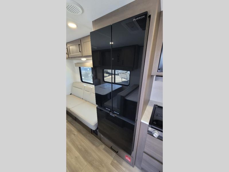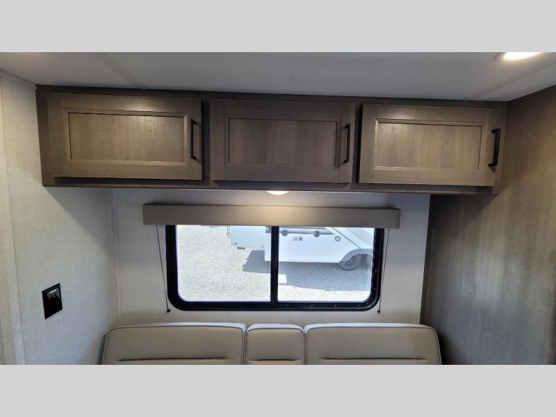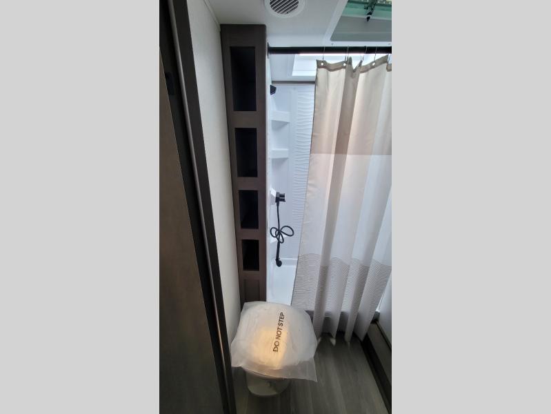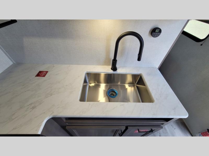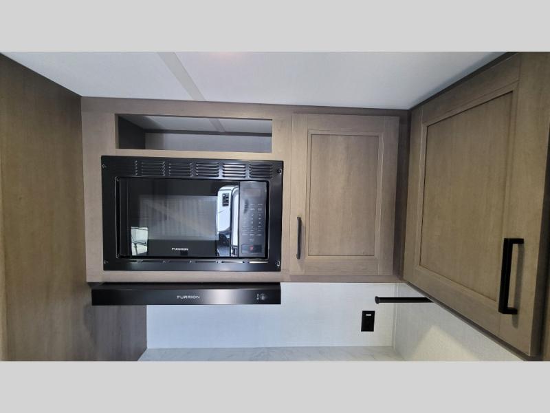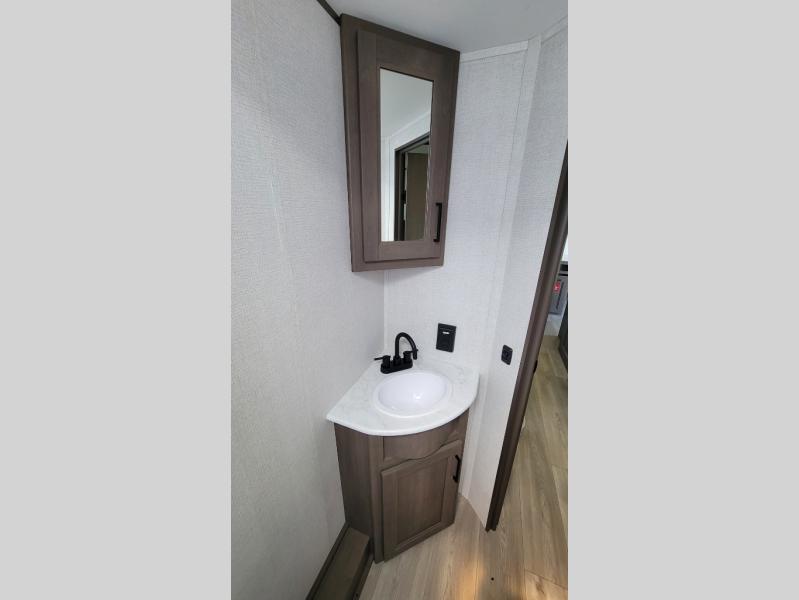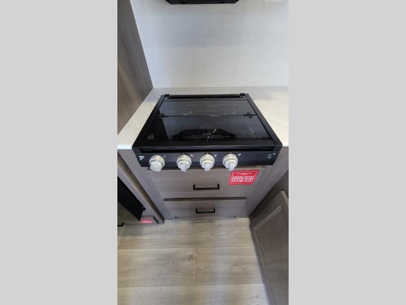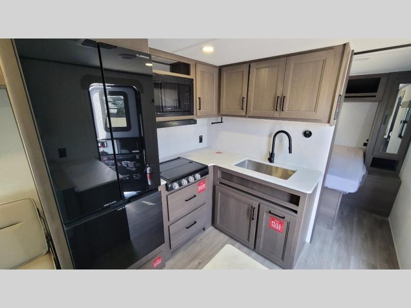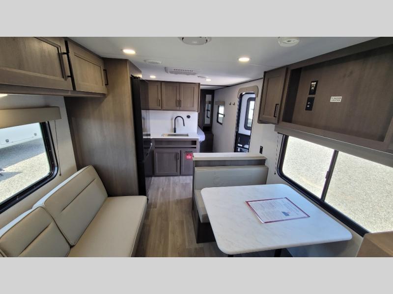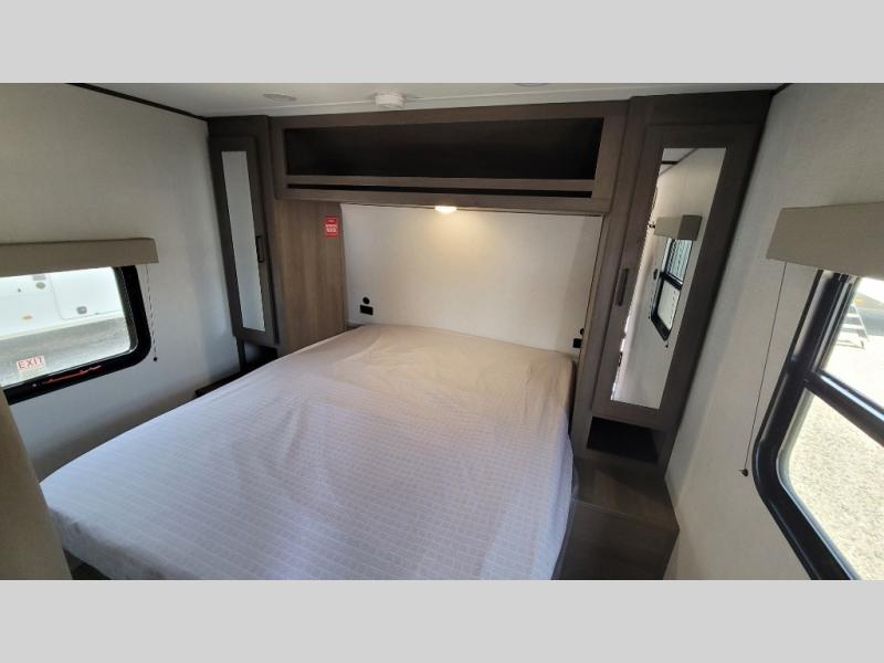 This is the perfect travel trailer if you like to camp with friends and family. Since there are double-size bunks, a queen bed in the front bedroom, plus a booth dinette and sofa, you can sleep eight campers each night! The three burner range and microwave in the kitchen will let you cook meals each day, and the 12V refrigerator will keep your cold items fresh. This model also includes a counter with extra storage underneath, a pull-out trash can storage for convenience, and a full bath to freshen up in each day. And you'll love having your own space in the front bedroom with a privacy curtain, dual wardrobes, and TV prep if you want to add a television!