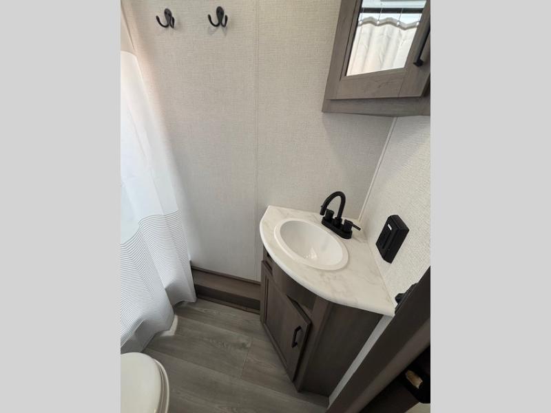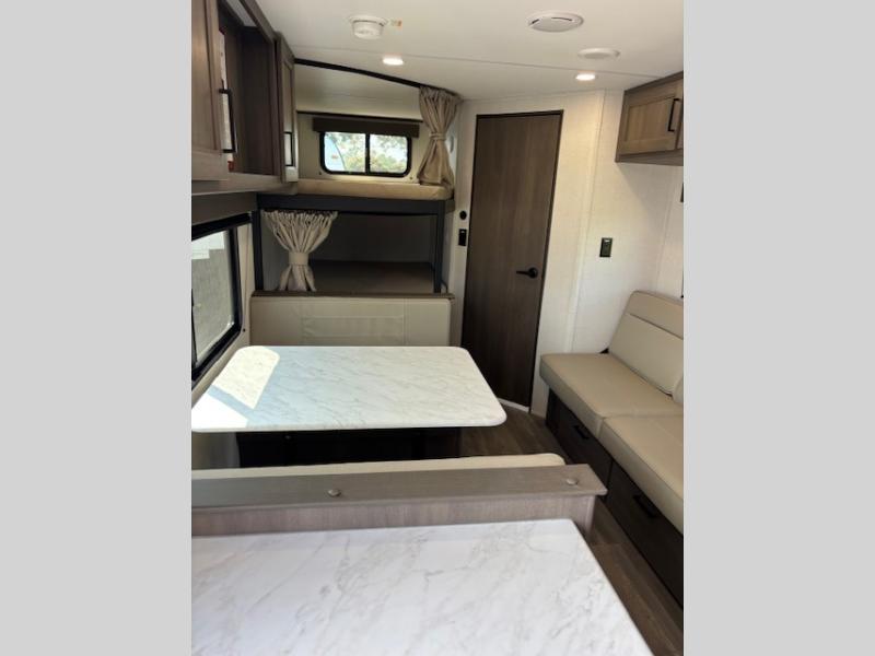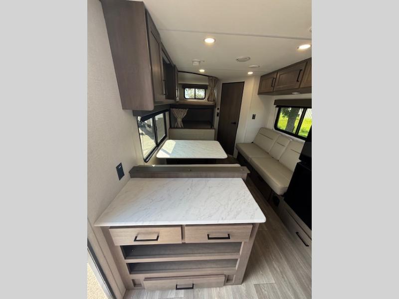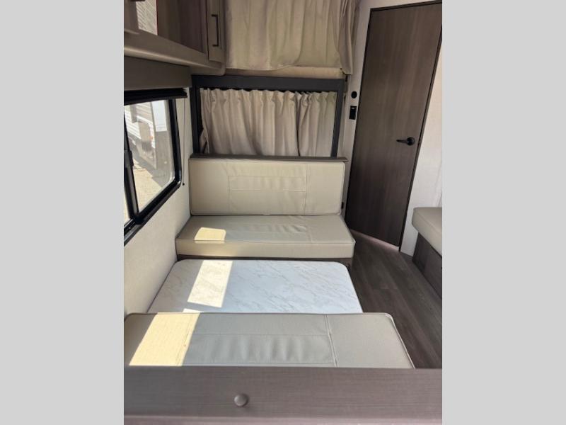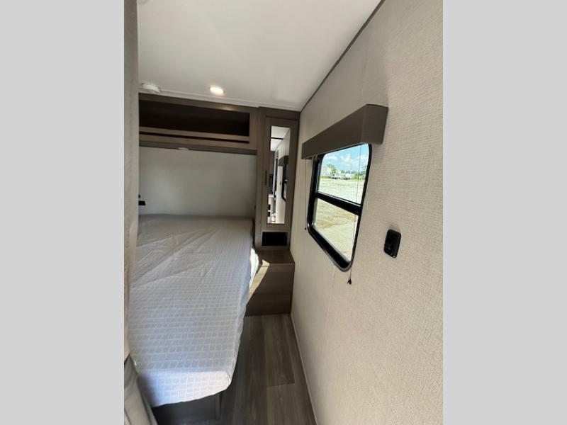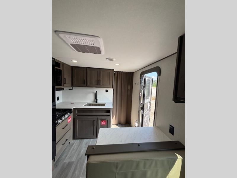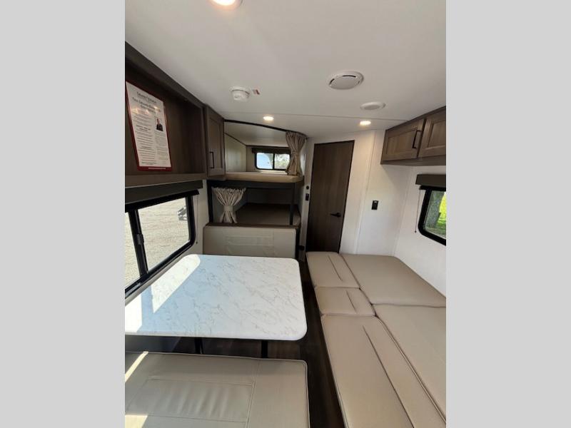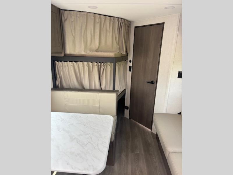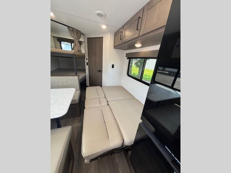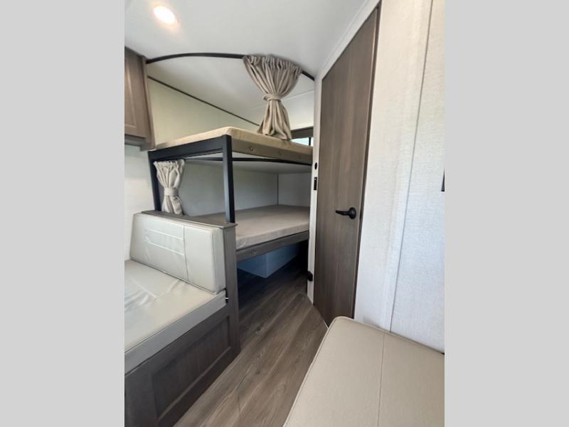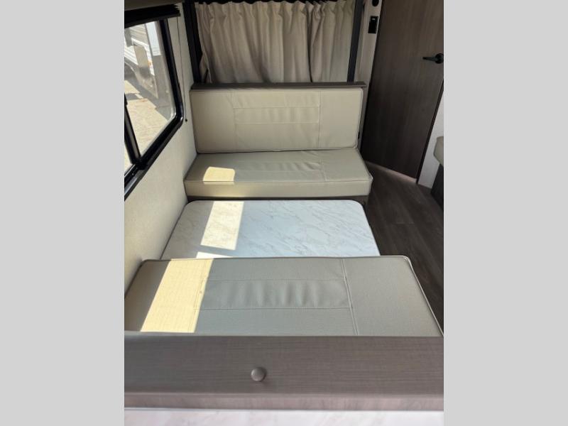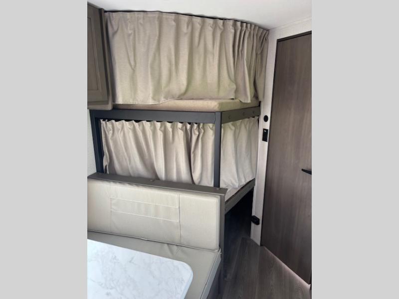 This is the perfect travel trailer if you like to camp with friends and family. Since there are double-size bunks, a queen bed in the front bedroom, plus a booth dinette and sofa, you can sleep eight campers each night! The three burner range and microwave in the kitchen will let you cook meals each day, and the 12V refrigerator will keep your cold items fresh. This model also includes a counter with extra storage underneath, a pull-out trash can storage for convenience, and a full bath to freshen up in each day. And you'll love having your own space in the front bedroom with a privacy curtain, dual wardrobes, and TV prep if you want to add a television!
