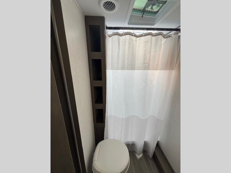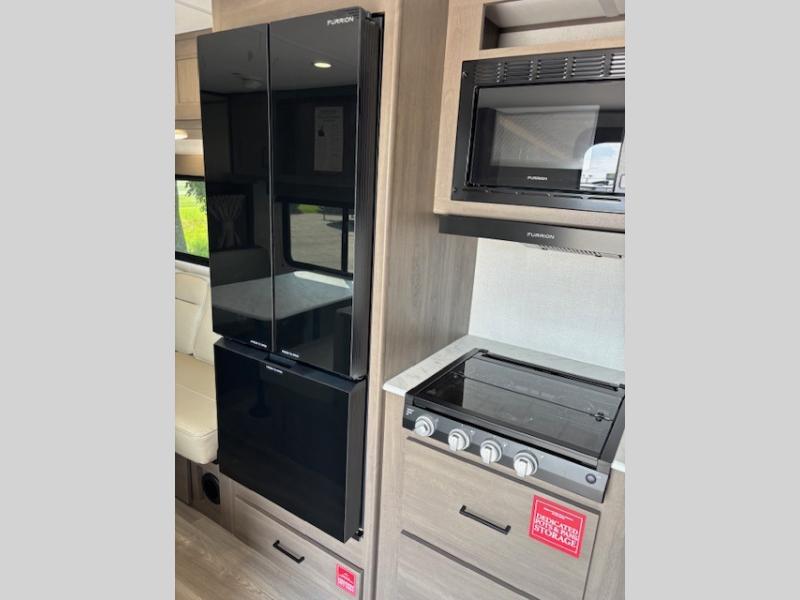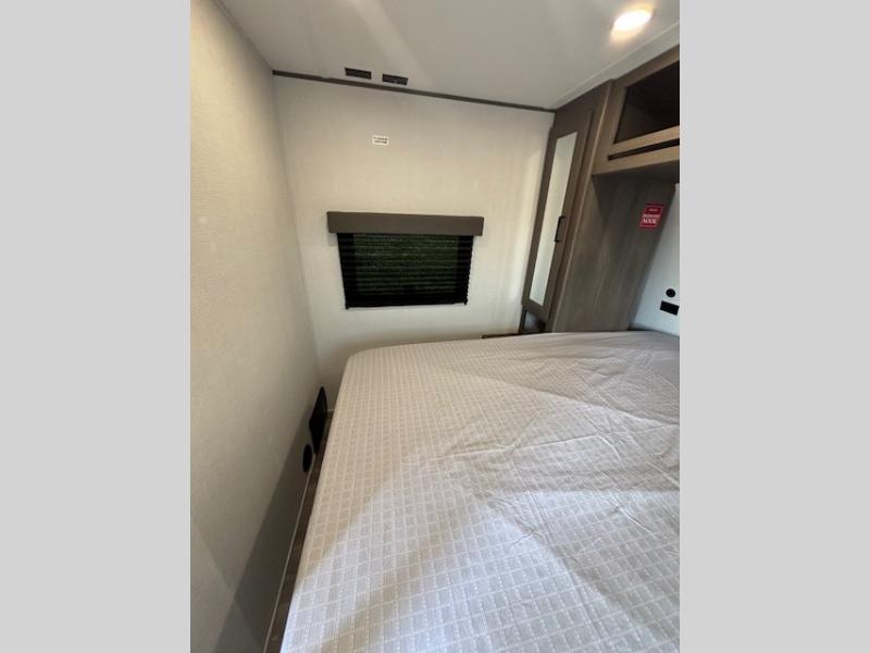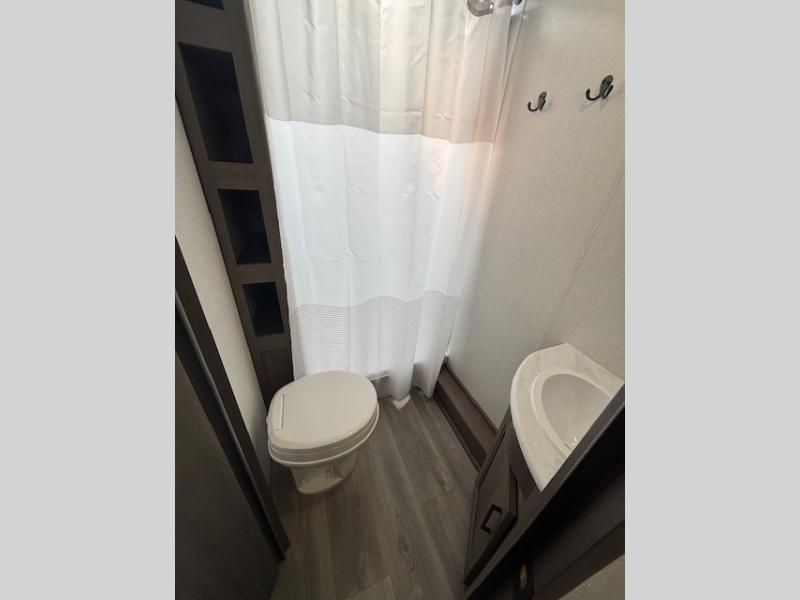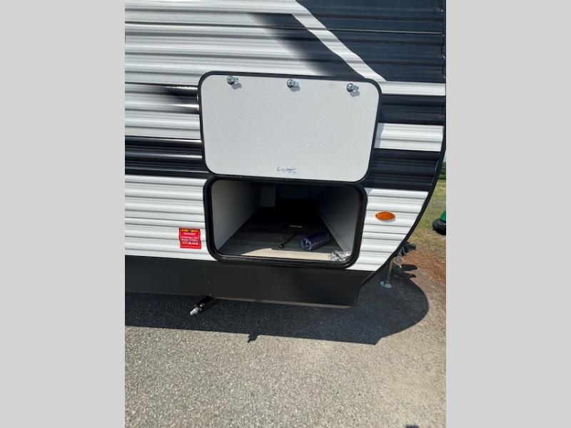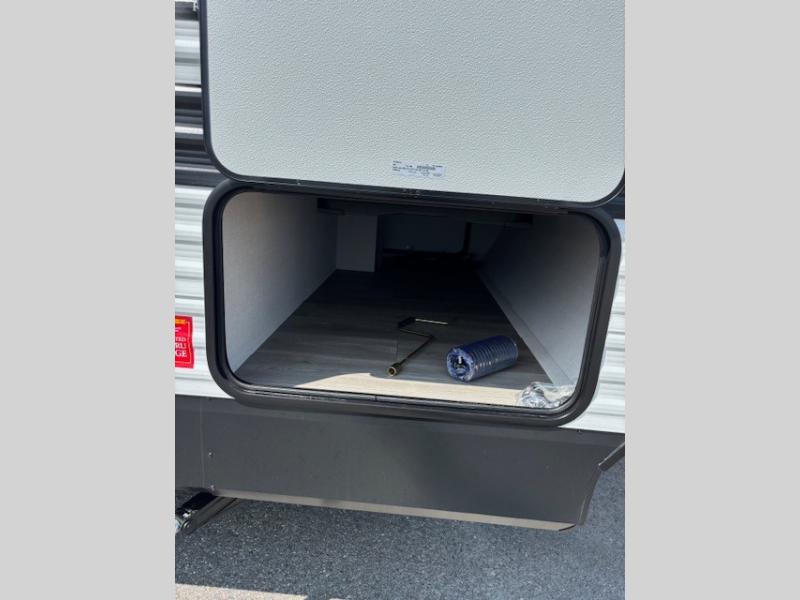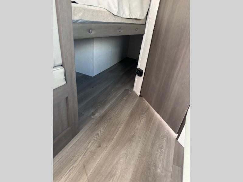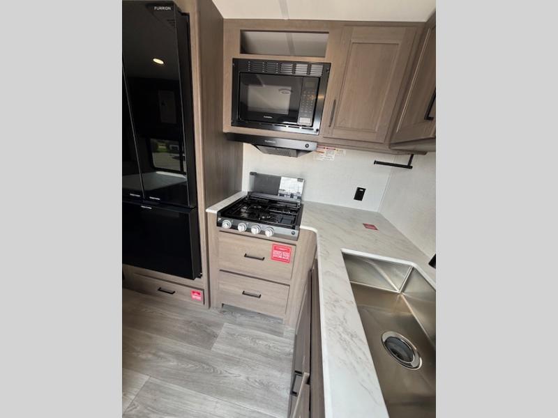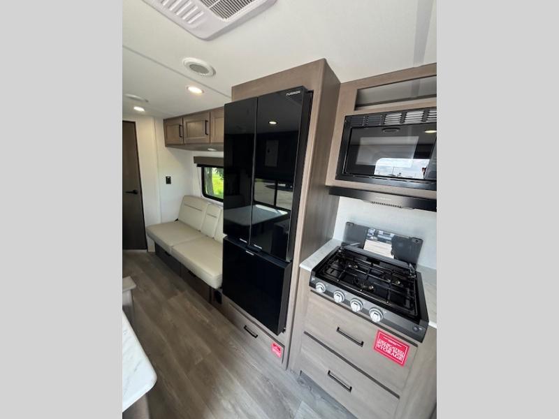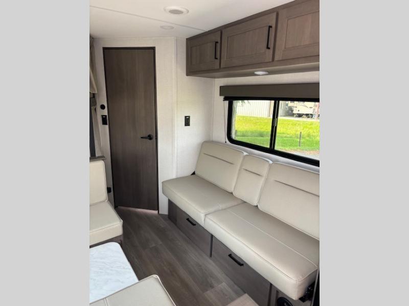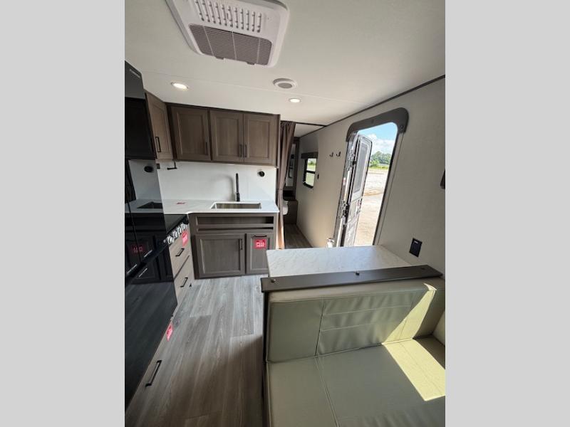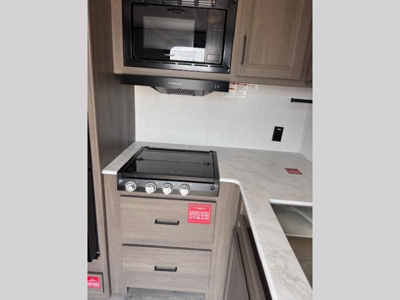 This is the perfect travel trailer if you like to camp with friends and family. Since there are double-size bunks, a queen bed in the front bedroom, plus a booth dinette and sofa, you can sleep eight campers each night! The three burner range and microwave in the kitchen will let you cook meals each day, and the 12V refrigerator will keep your cold items fresh. This model also includes a counter with extra storage underneath, a pull-out trash can storage for convenience, and a full bath to freshen up in each day. And you'll love having your own space in the front bedroom with a privacy curtain, dual wardrobes, and TV prep if you want to add a television!