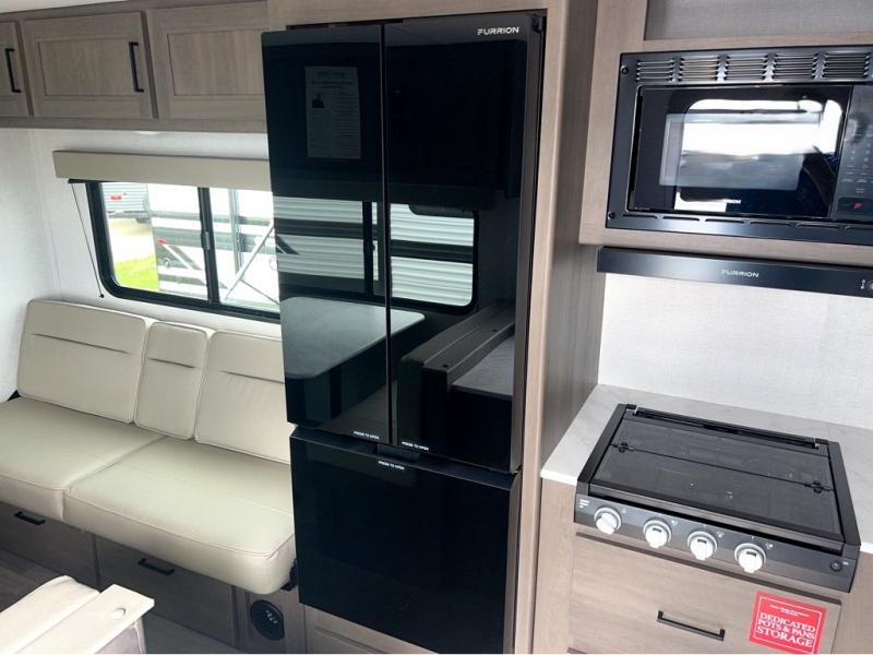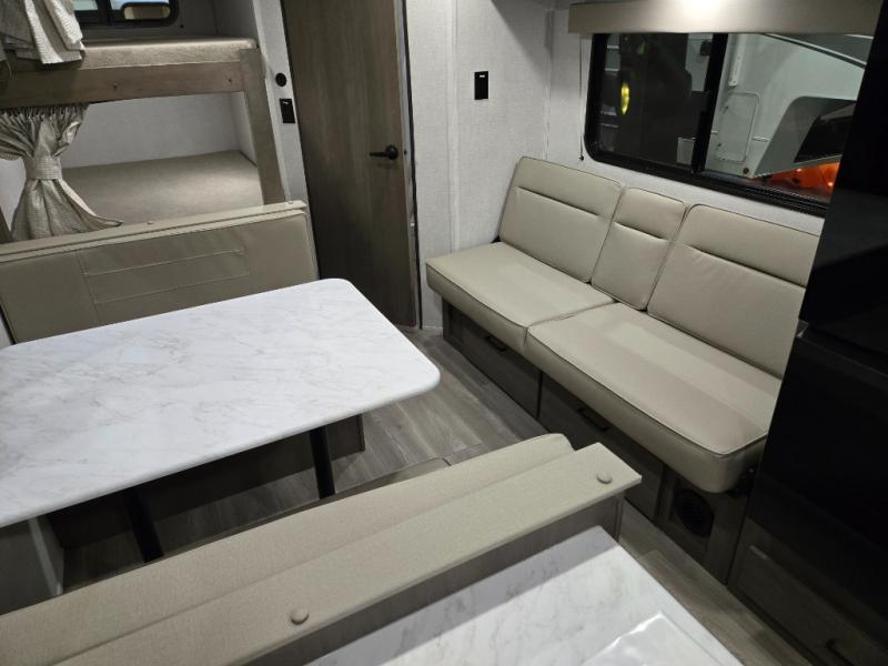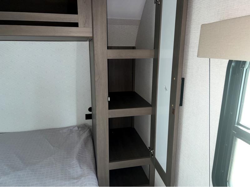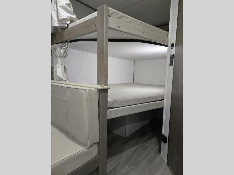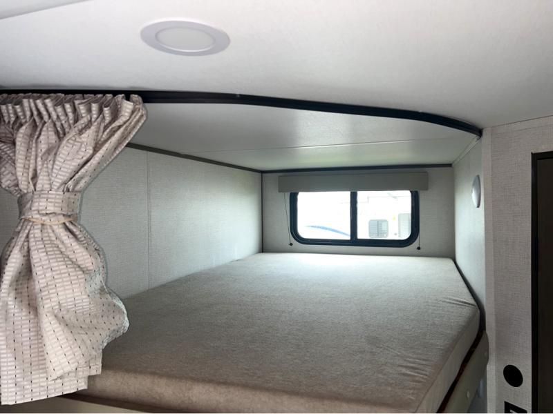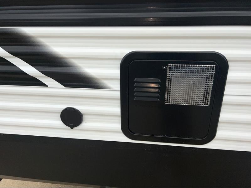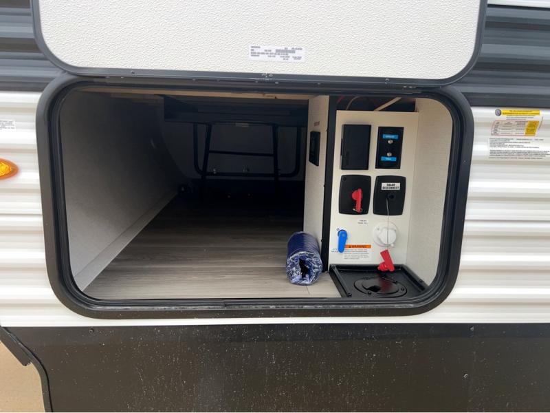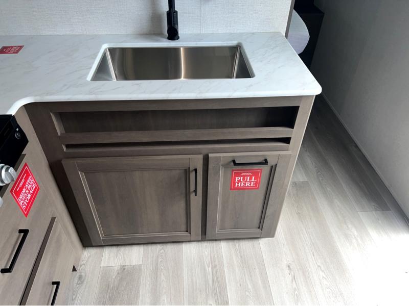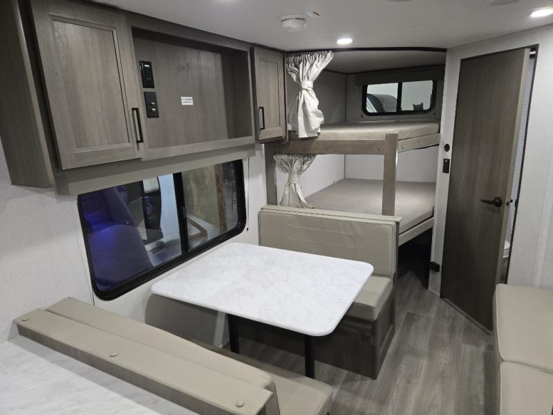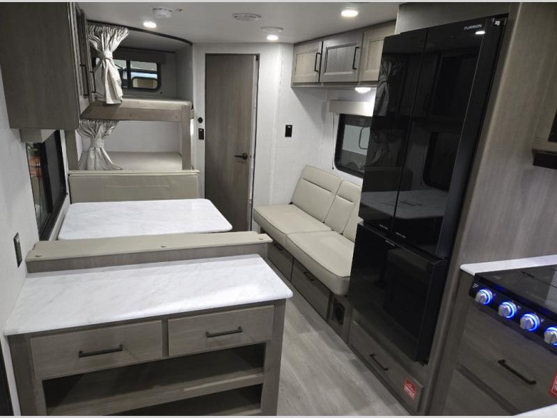 This is the perfect travel trailer if you like to camp with friends and family. Since there are double-size bunks, a queen bed in the front bedroom, plus a booth dinette and sofa, you can sleep eight campers each night! The three burner range and microwave in the kitchen will let you cook meals each day, and the 12V refrigerator will keep your cold items fresh. This model also includes a counter with extra storage underneath, a pull-out trash can storage for convenience, and a full bath to freshen up in each day. And you'll love having your own space in the front bedroom with a privacy curtain, dual wardrobes, and TV prep if you want to add a television!