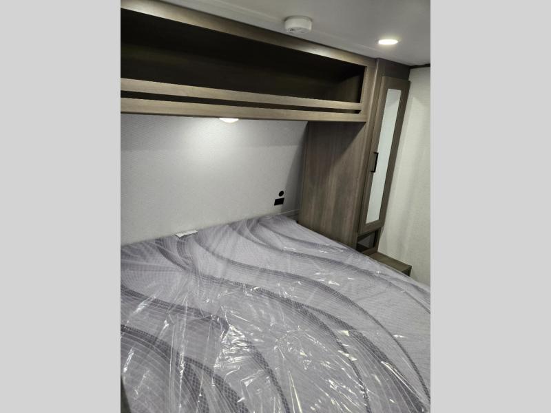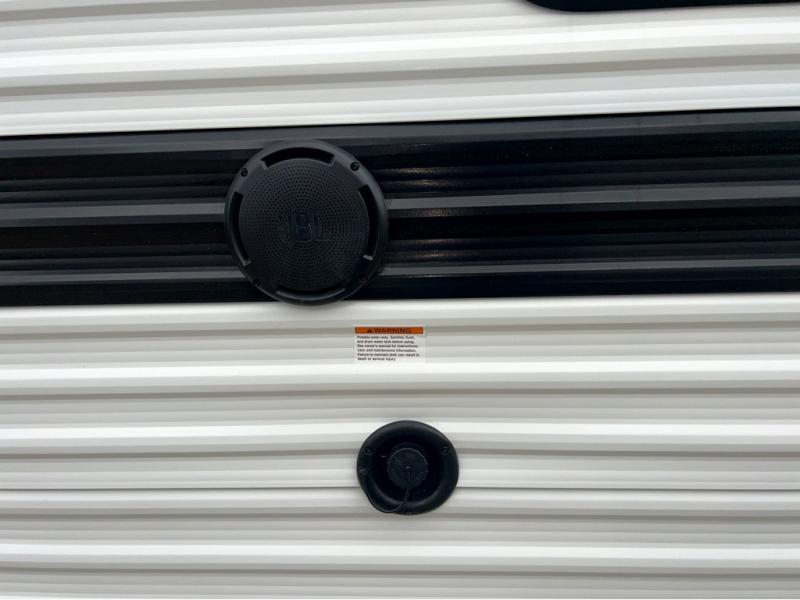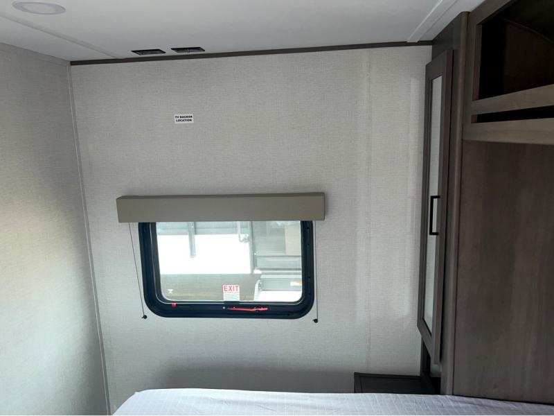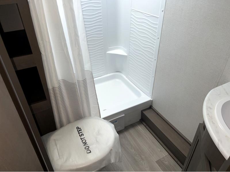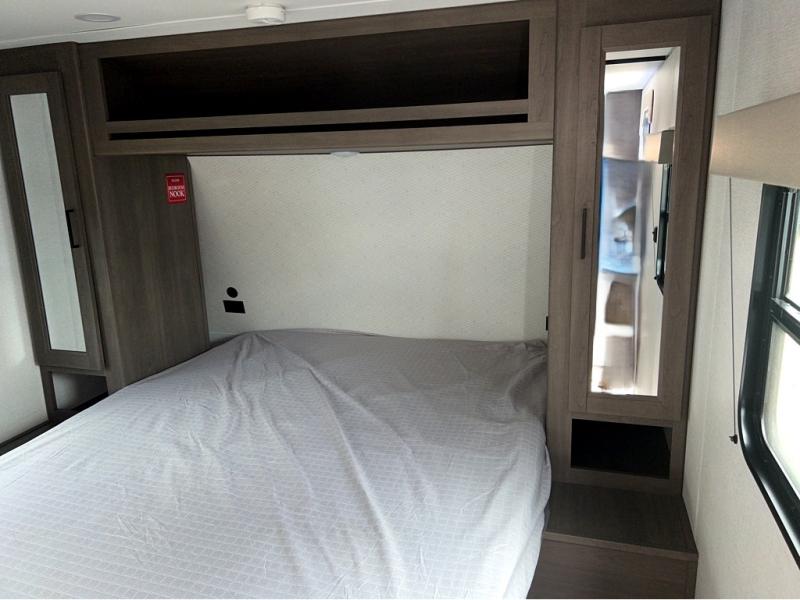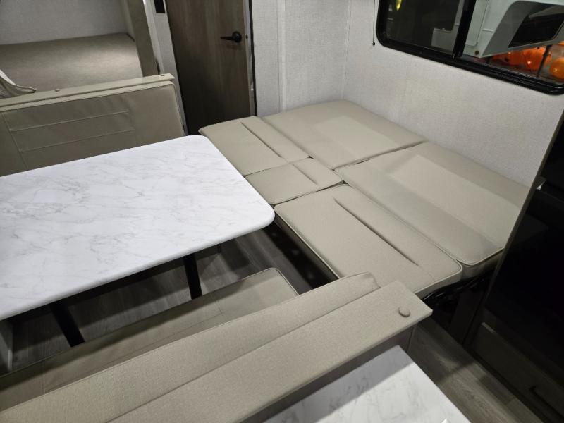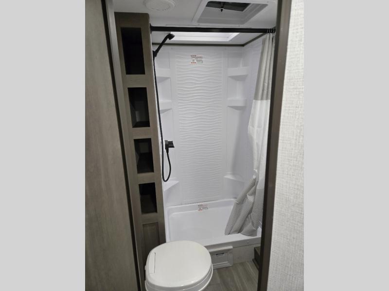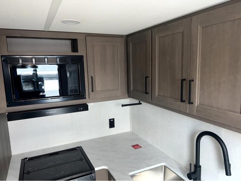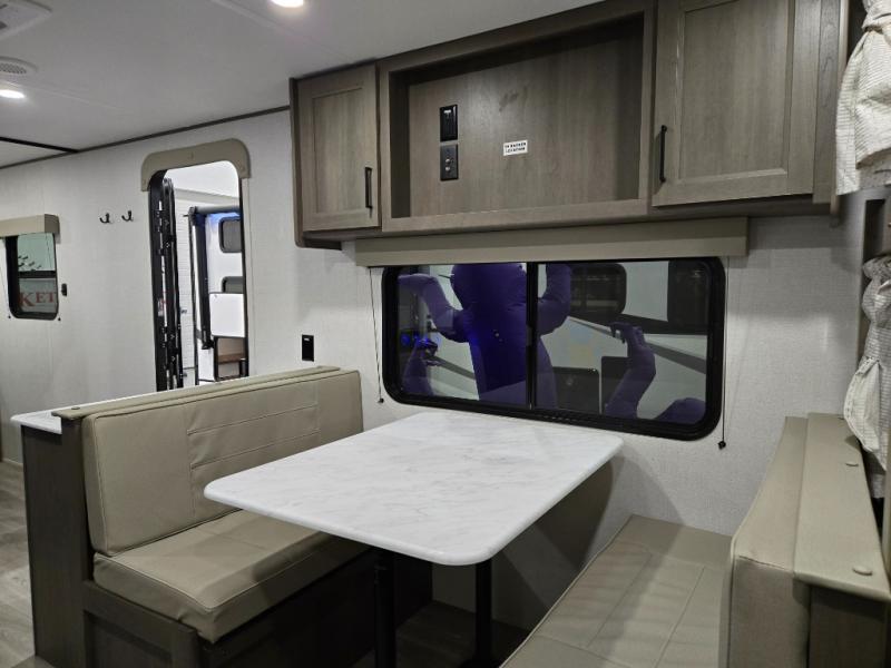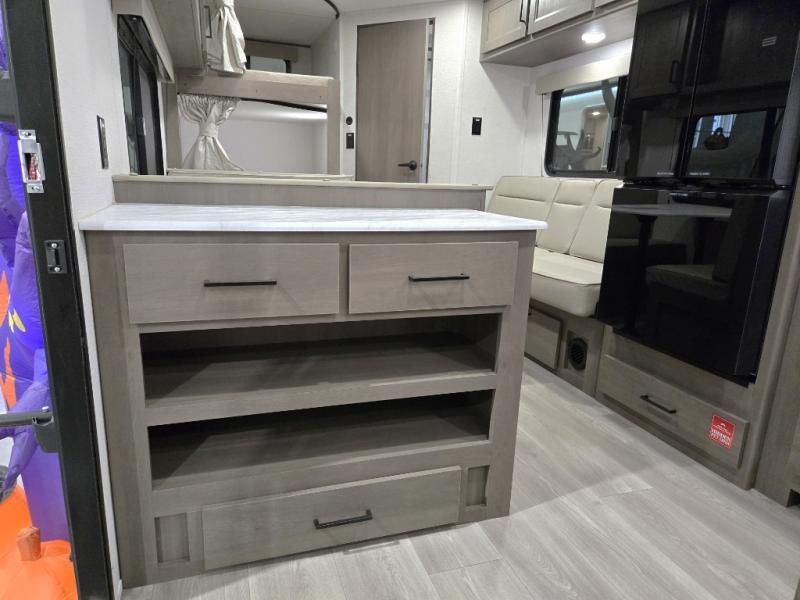 This is the perfect travel trailer if you like to camp with friends and family. Since there are double-size bunks, a queen bed in the front bedroom, plus a booth dinette and sofa, you can sleep eight campers each night! The three burner range and microwave in the kitchen will let you cook meals each day, and the 12V refrigerator will keep your cold items fresh. This model also includes a counter with extra storage underneath, a pull-out trash can storage for convenience, and a full bath to freshen up in each day. And you'll love having your own space in the front bedroom with a privacy curtain, dual wardrobes, and TV prep if you want to add a television!