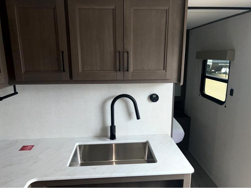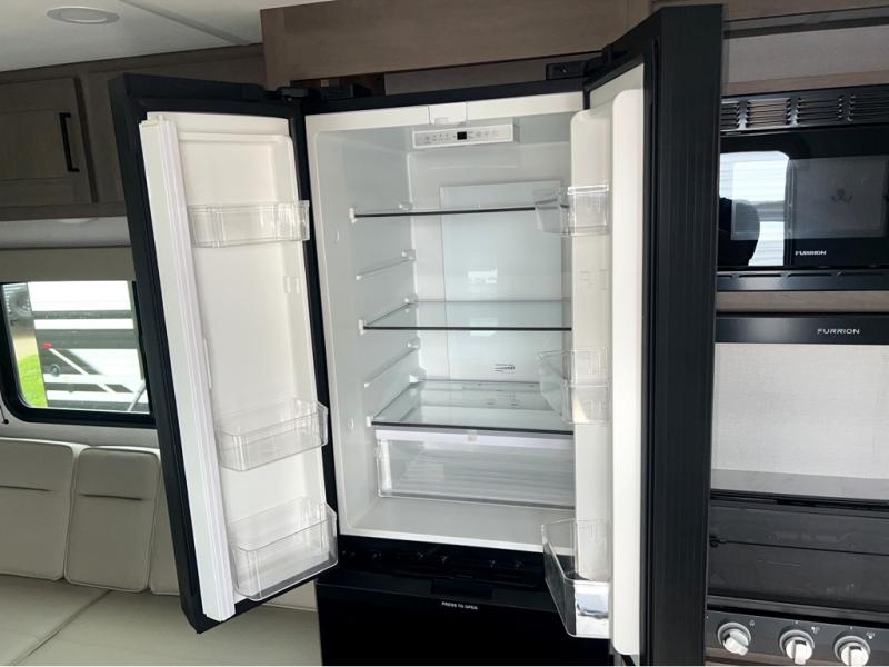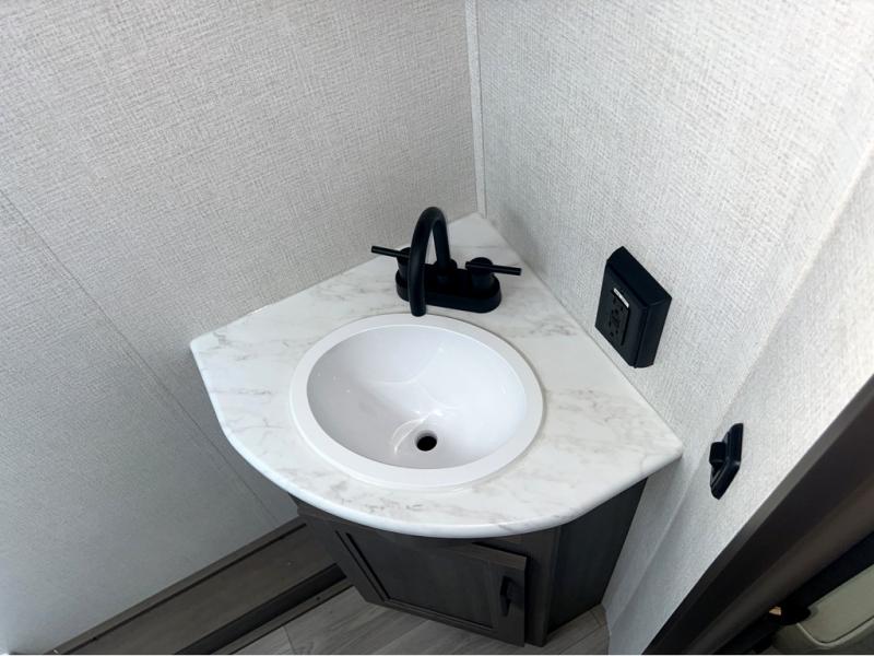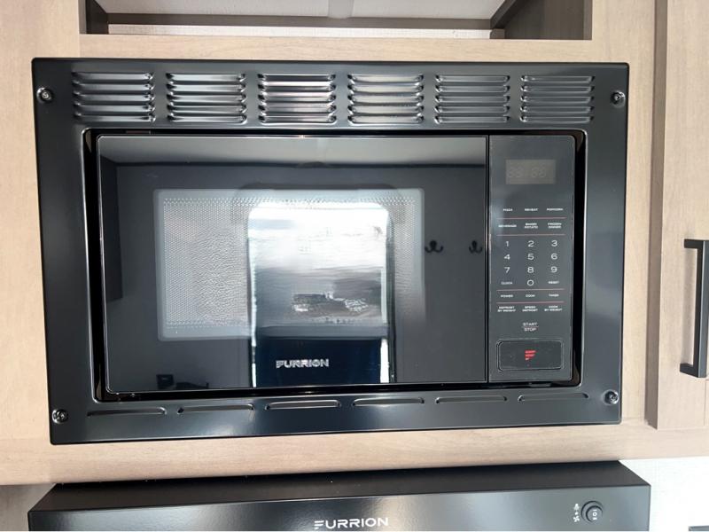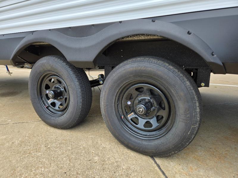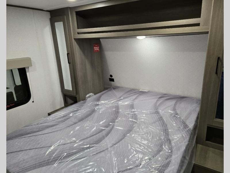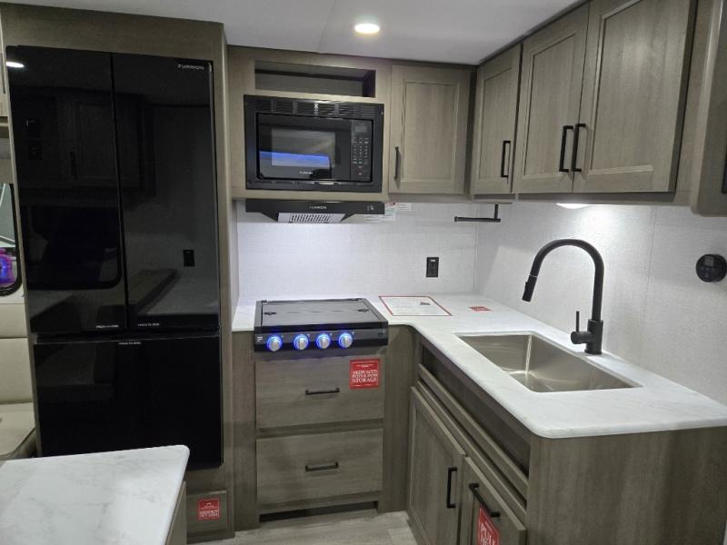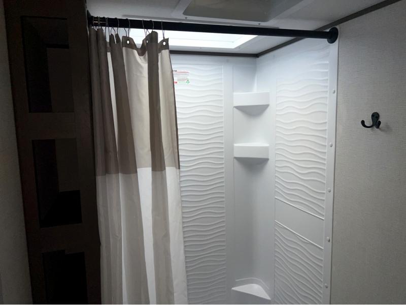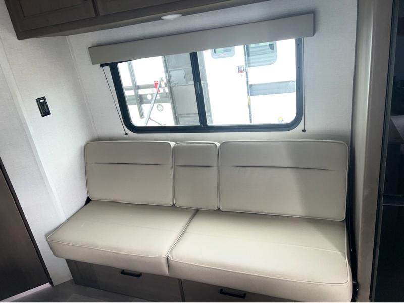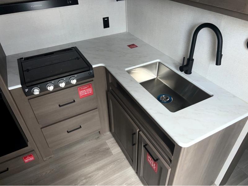 This is the perfect travel trailer if you like to camp with friends and family. Since there are double-size bunks, a queen bed in the front bedroom, plus a booth dinette and sofa, you can sleep eight campers each night! The three burner range and microwave in the kitchen will let you cook meals each day, and the 12V refrigerator will keep your cold items fresh. This model also includes a counter with extra storage underneath, a pull-out trash can storage for convenience, and a full bath to freshen up in each day. And you'll love having your own space in the front bedroom with a privacy curtain, dual wardrobes, and TV prep if you want to add a television!