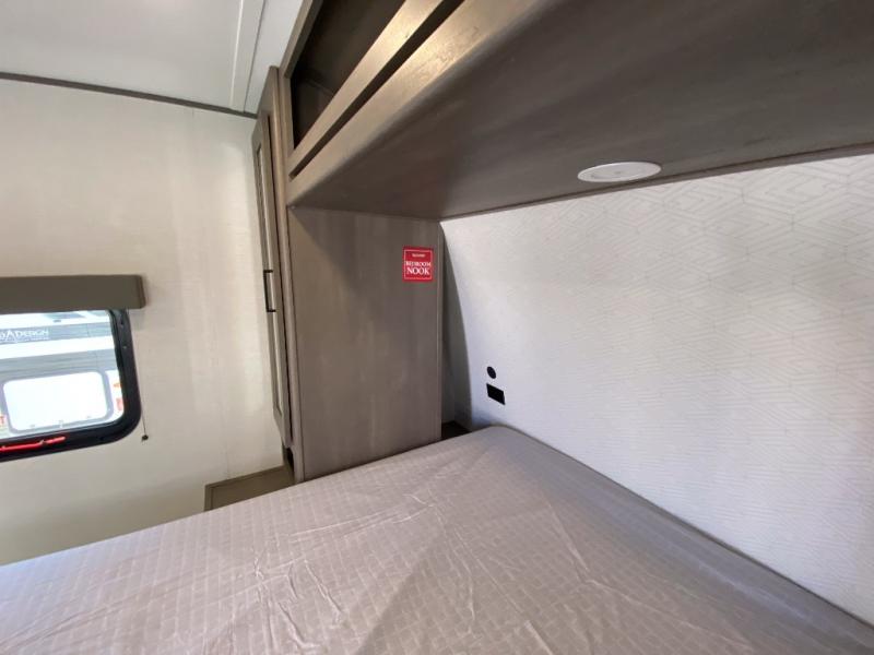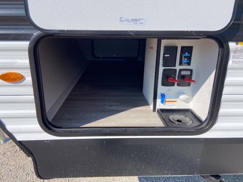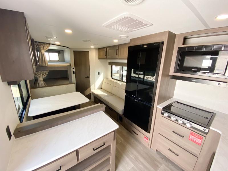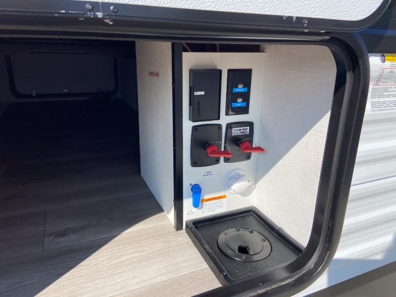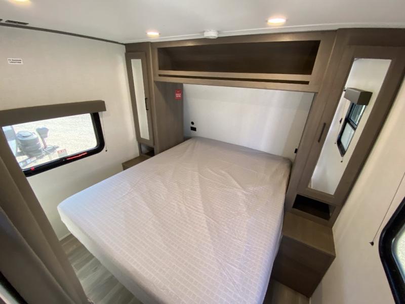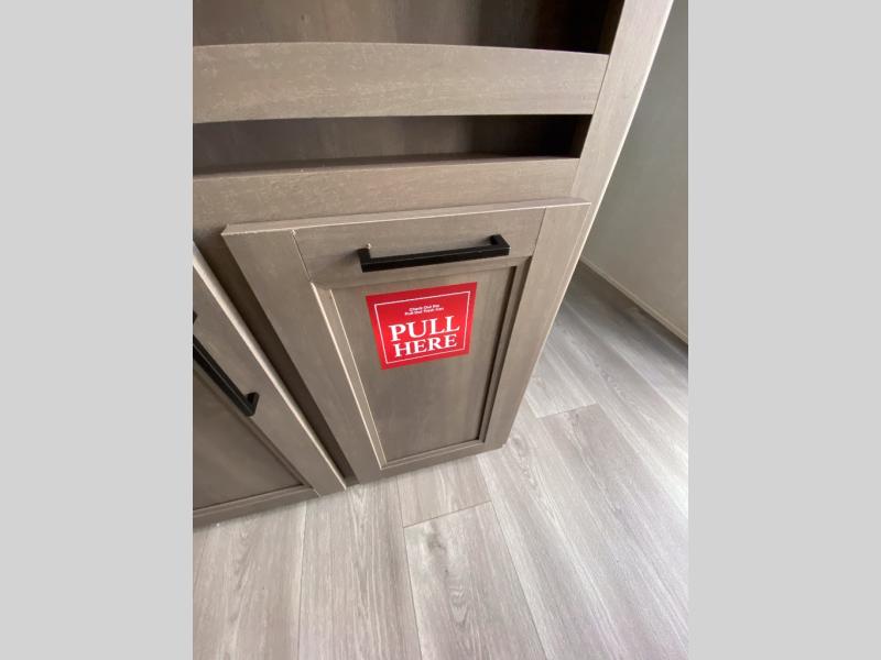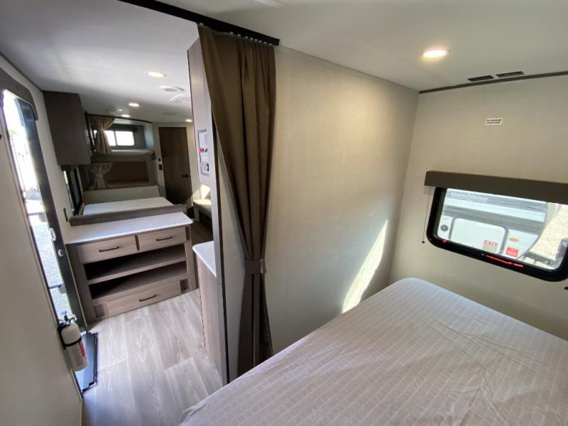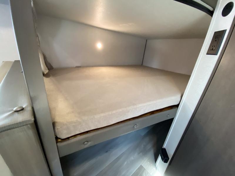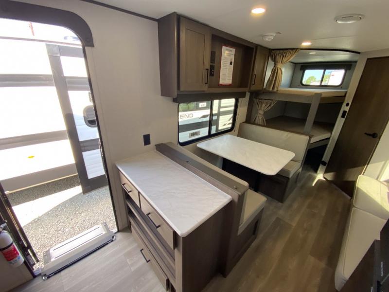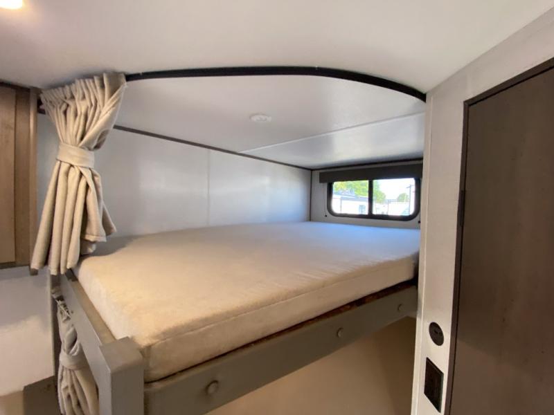 This is the perfect travel trailer if you like to camp with friends and family. Since there are double-size bunks, a queen bed in the front bedroom, plus a booth dinette and sofa, you can sleep eight campers each night! The three burner range and microwave in the kitchen will let you cook meals each day, and the 12V refrigerator will keep your cold items fresh. This model also includes a counter with extra storage underneath, a pull-out trash can storage for convenience, and a full bath to freshen up in each day. And you'll love having your own space in the front bedroom with a privacy curtain, dual wardrobes, and TV prep if you want to add a television!