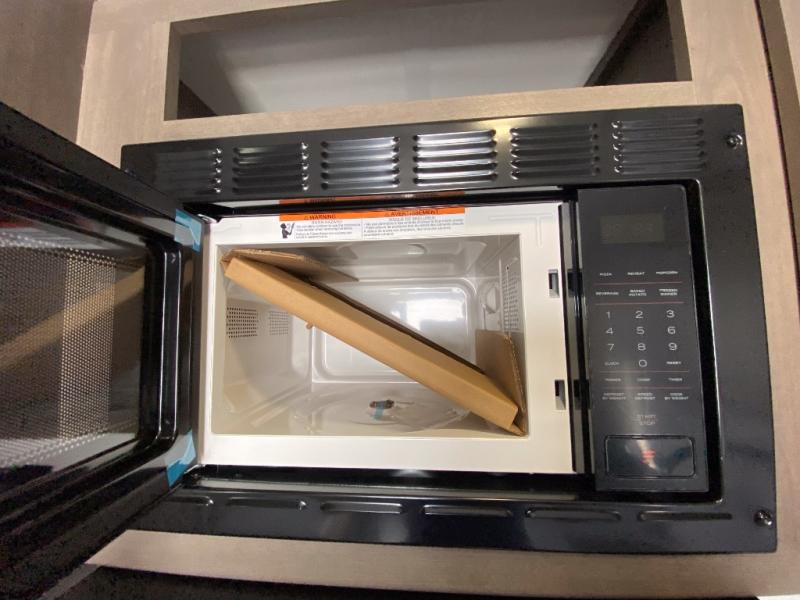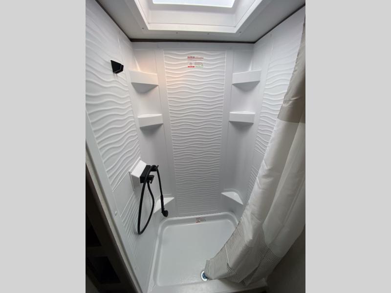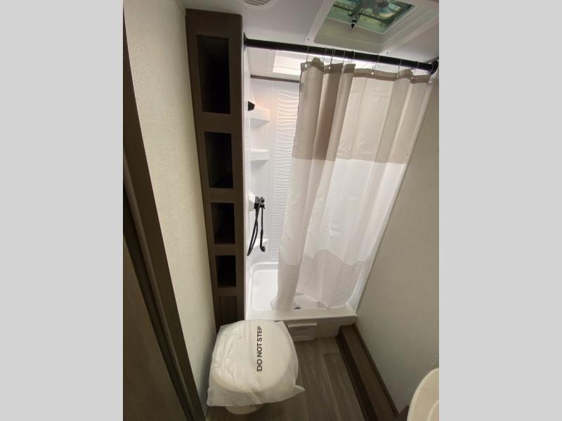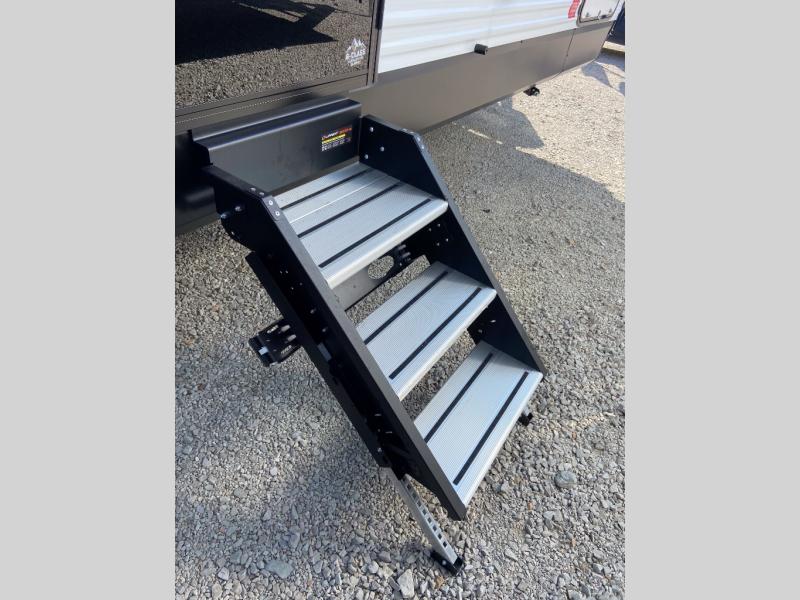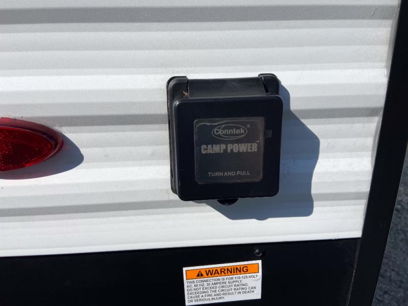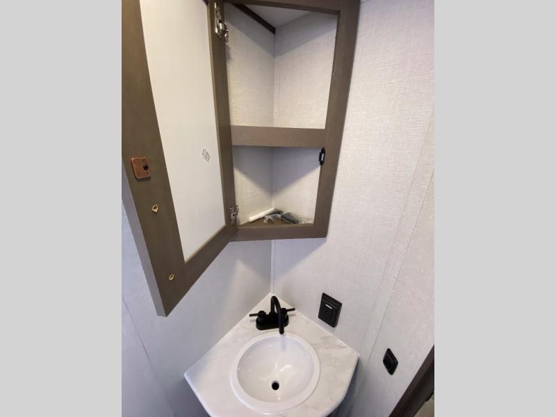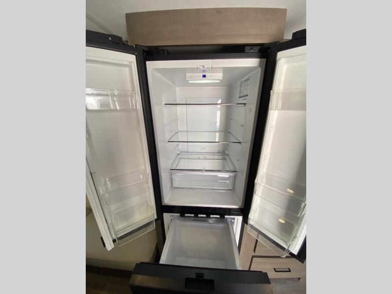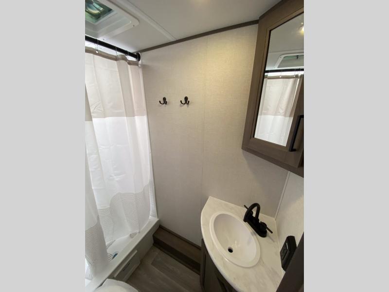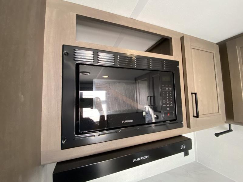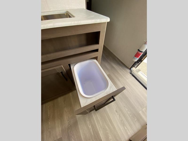 This is the perfect travel trailer if you like to camp with friends and family. Since there are double-size bunks, a queen bed in the front bedroom, plus a booth dinette and sofa, you can sleep eight campers each night! The three burner range and microwave in the kitchen will let you cook meals each day, and the 12V refrigerator will keep your cold items fresh. This model also includes a counter with extra storage underneath, a pull-out trash can storage for convenience, and a full bath to freshen up in each day. And you'll love having your own space in the front bedroom with a privacy curtain, dual wardrobes, and TV prep if you want to add a television!