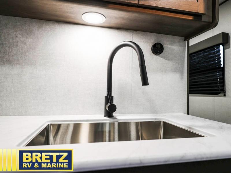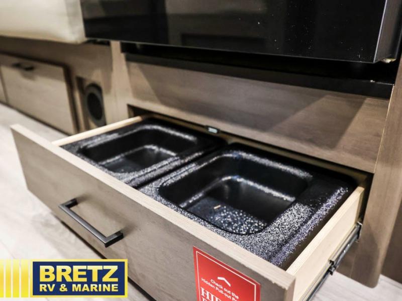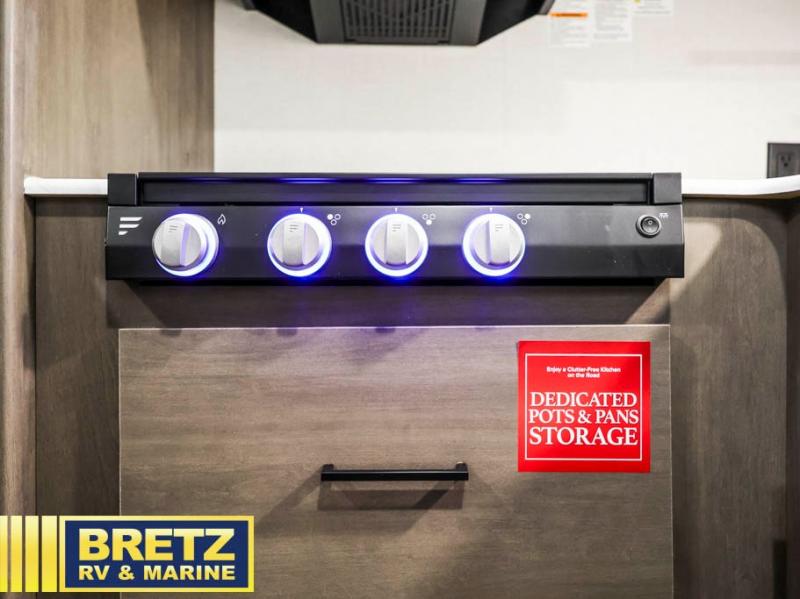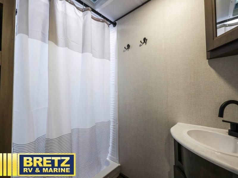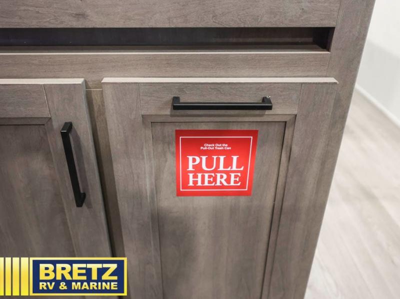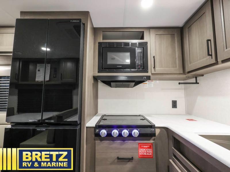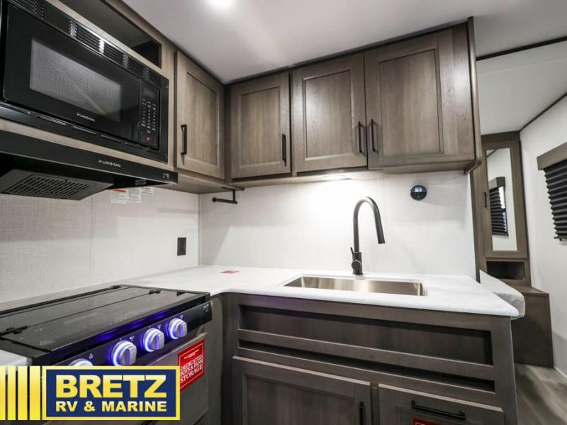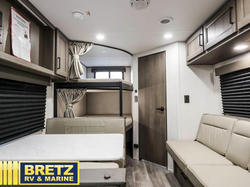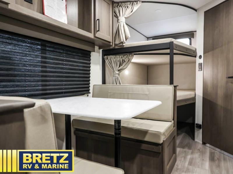 This is the perfect travel trailer if you like to camp with friends and family. Since there are double-size bunks, a queen bed in the front bedroom, plus a booth dinette and sofa, you can sleep eight campers each night! The three burner range and microwave in the kitchen will let you cook meals each day, and the 12V refrigerator will keep your cold items fresh. This model also includes a counter with extra storage underneath, a pull-out trash can storage for convenience, and a full bath to freshen up in each day. And you'll love having your own space in the front bedroom with a privacy curtain, dual wardrobes, and TV prep if you want to add a television!