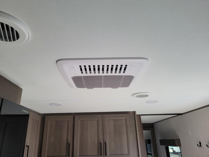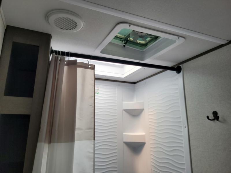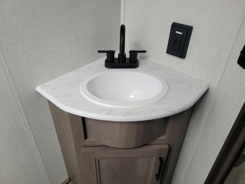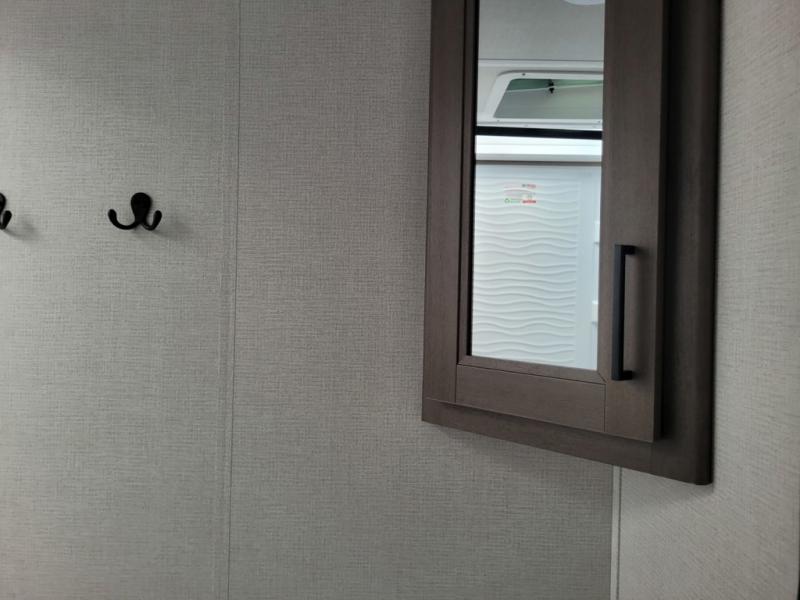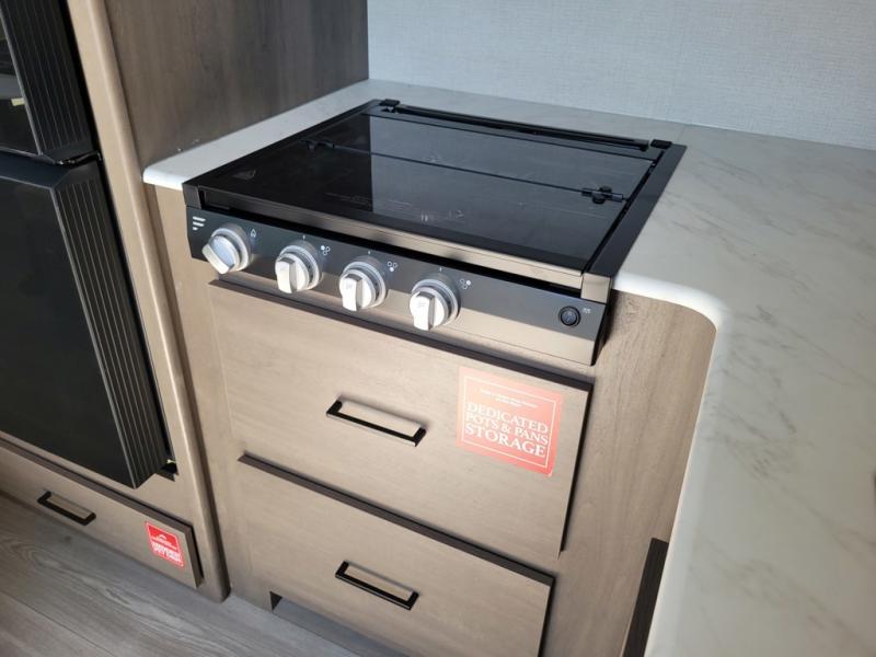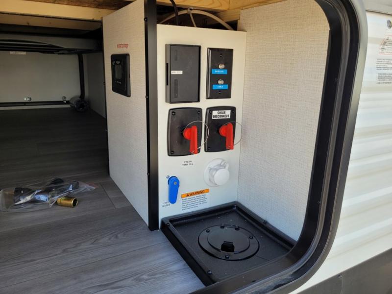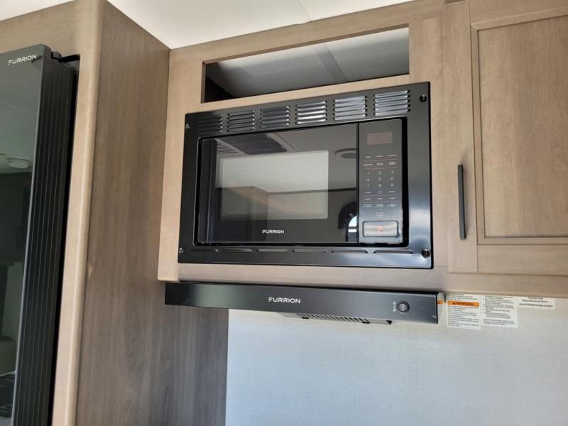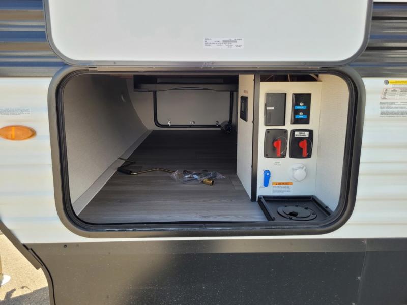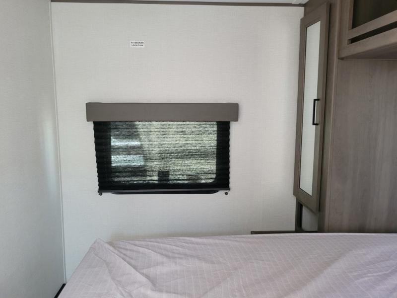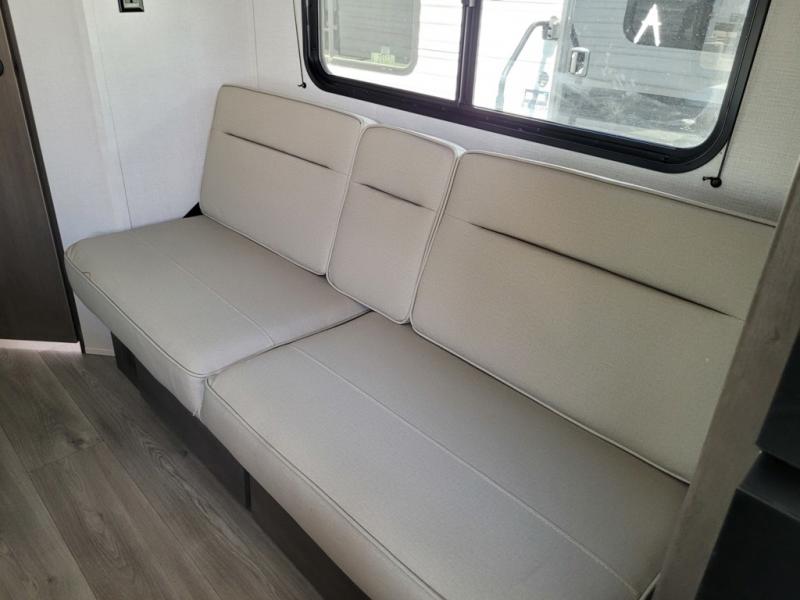 This is the perfect travel trailer if you like to camp with friends and family. Since there are double-size bunks, a queen bed in the front bedroom, plus a booth dinette and sofa, you can sleep eight campers each night! The three burner range and microwave in the kitchen will let you cook meals each day, and the 12V refrigerator will keep your cold items fresh. This model also includes a counter with extra storage underneath, a pull-out trash can storage for convenience, and a full bath to freshen up in each day. And you'll love having your own space in the front bedroom with a privacy curtain, dual wardrobes, and TV prep if you want to add a television!