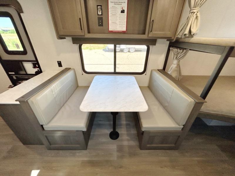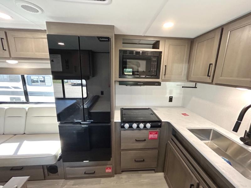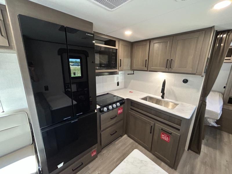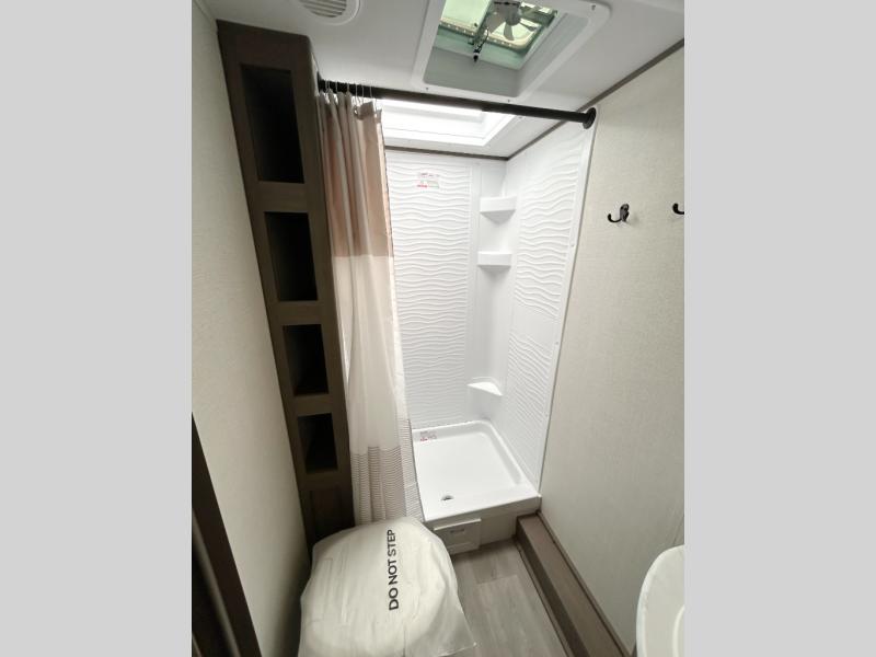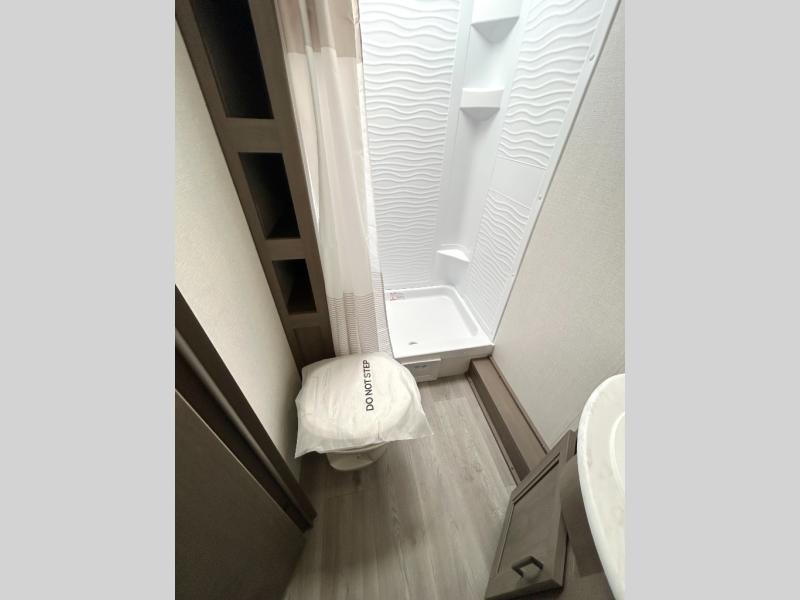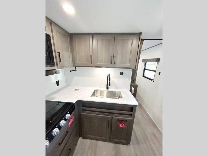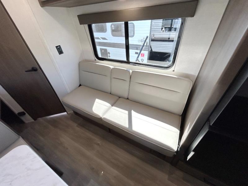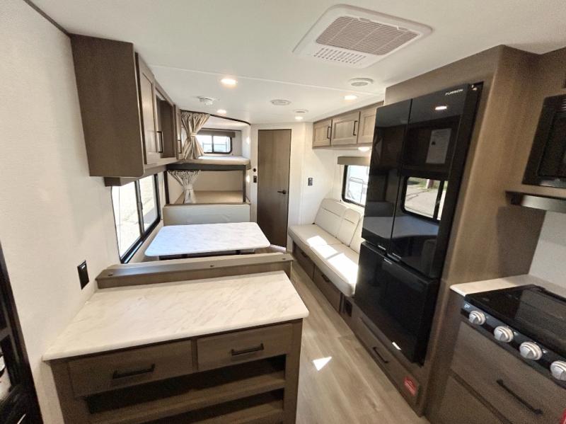 This is the perfect travel trailer if you like to camp with friends and family. Since there are double-size bunks, a queen bed in the front bedroom, plus a booth dinette and sofa, you can sleep eight campers each night! The three burner range and microwave in the kitchen will let you cook meals each day, and the 12V refrigerator will keep your cold items fresh. This model also includes a counter with extra storage underneath, a pull-out trash can storage for convenience, and a full bath to freshen up in each day. And you'll love having your own space in the front bedroom with a privacy curtain, dual wardrobes, and TV prep if you want to add a television!