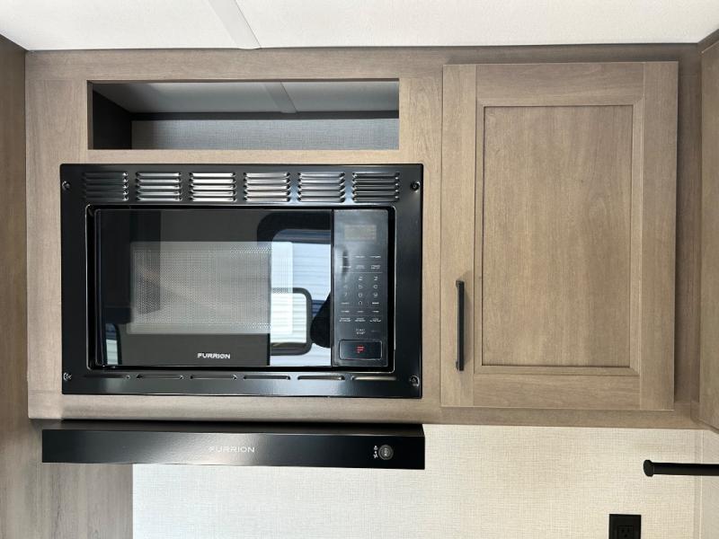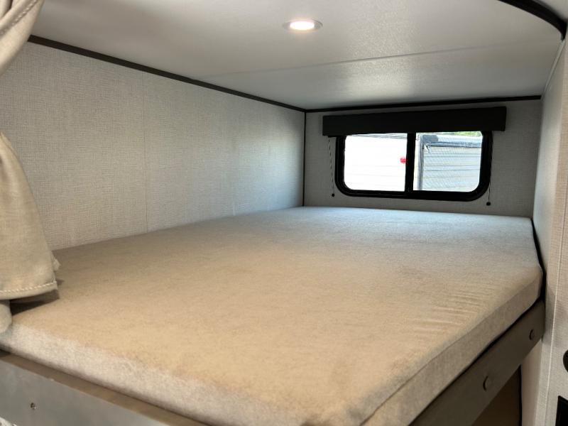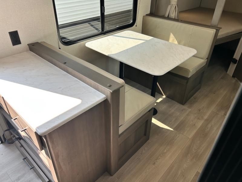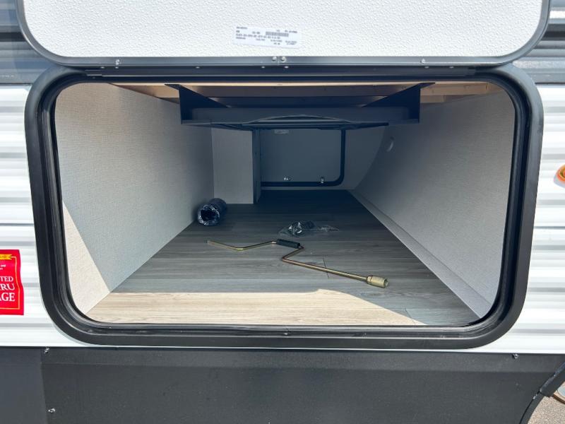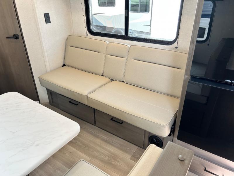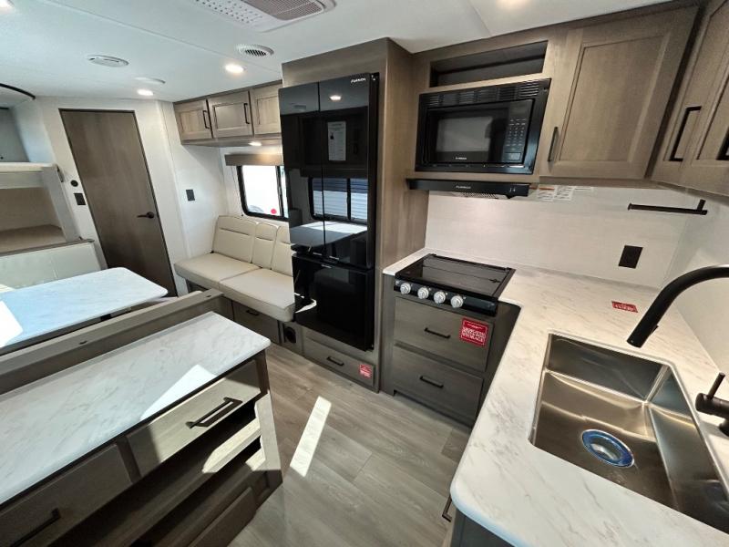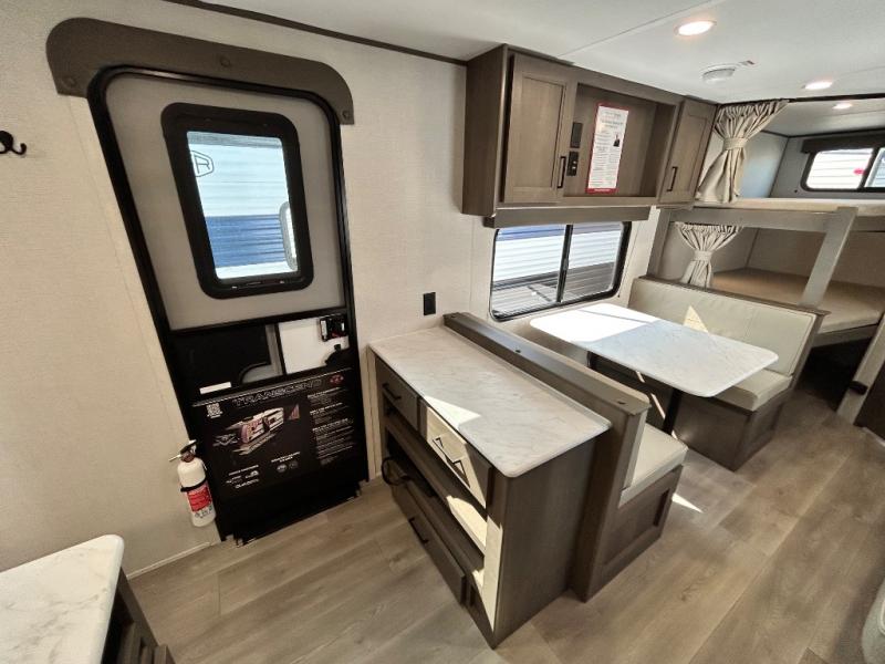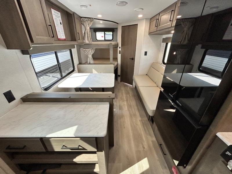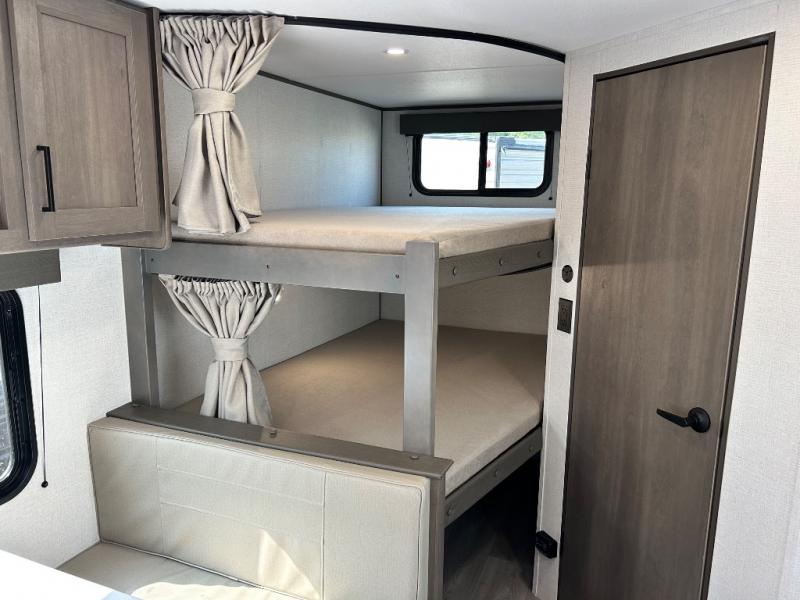 This is the perfect travel trailer if you like to camp with friends and family. Since there are double-size bunks, a queen bed in the front bedroom, plus a booth dinette and sofa, you can sleep eight campers each night! The three burner range and microwave in the kitchen will let you cook meals each day, and the 12V refrigerator will keep your cold items fresh. This model also includes a counter with extra storage underneath, a pull-out trash can storage for convenience, and a full bath to freshen up in each day. And you'll love having your own space in the front bedroom with a privacy curtain, dual wardrobes, and TV prep if you want to add a television!