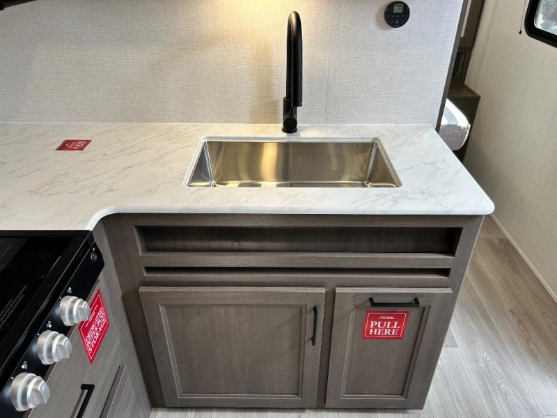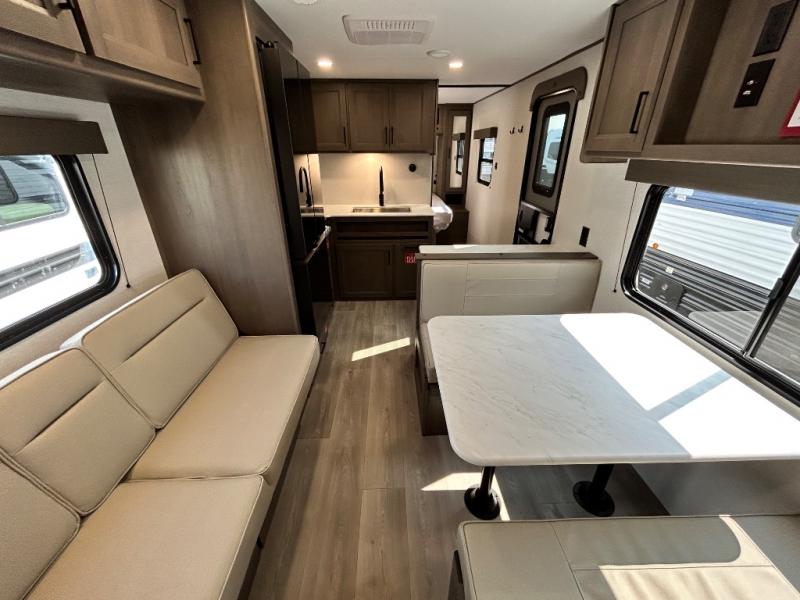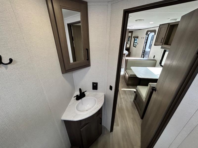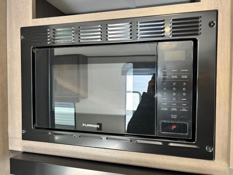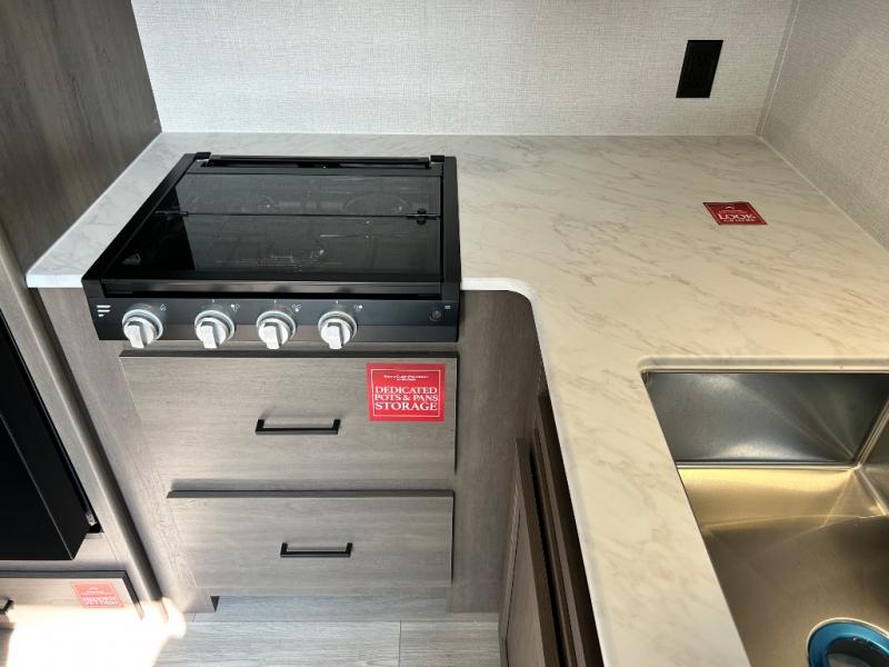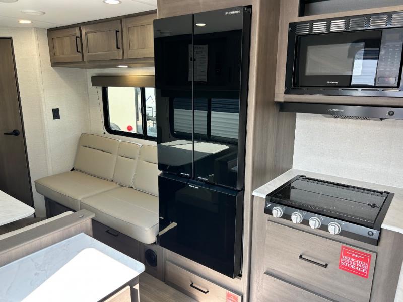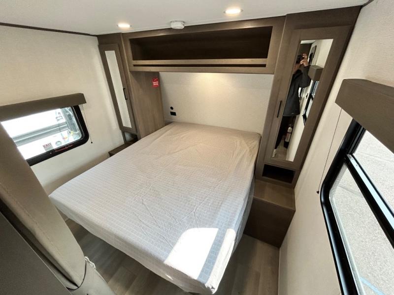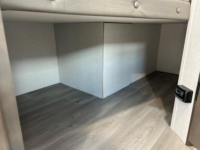 This is the perfect travel trailer if you like to camp with friends and family. Since there are double-size bunks, a queen bed in the front bedroom, plus a booth dinette and sofa, you can sleep eight campers each night! The three burner range and microwave in the kitchen will let you cook meals each day, and the 12V refrigerator will keep your cold items fresh. This model also includes a counter with extra storage underneath, a pull-out trash can storage for convenience, and a full bath to freshen up in each day. And you'll love having your own space in the front bedroom with a privacy curtain, dual wardrobes, and TV prep if you want to add a television!