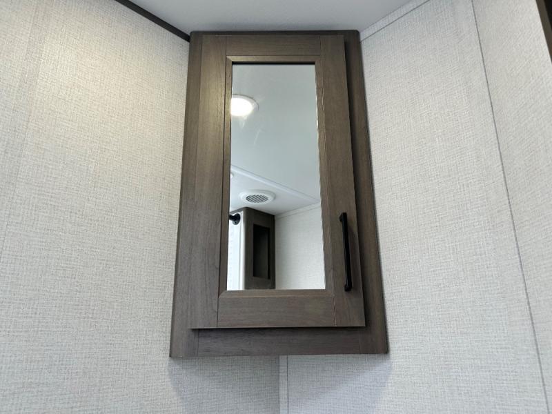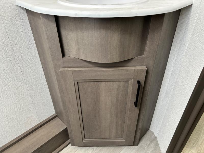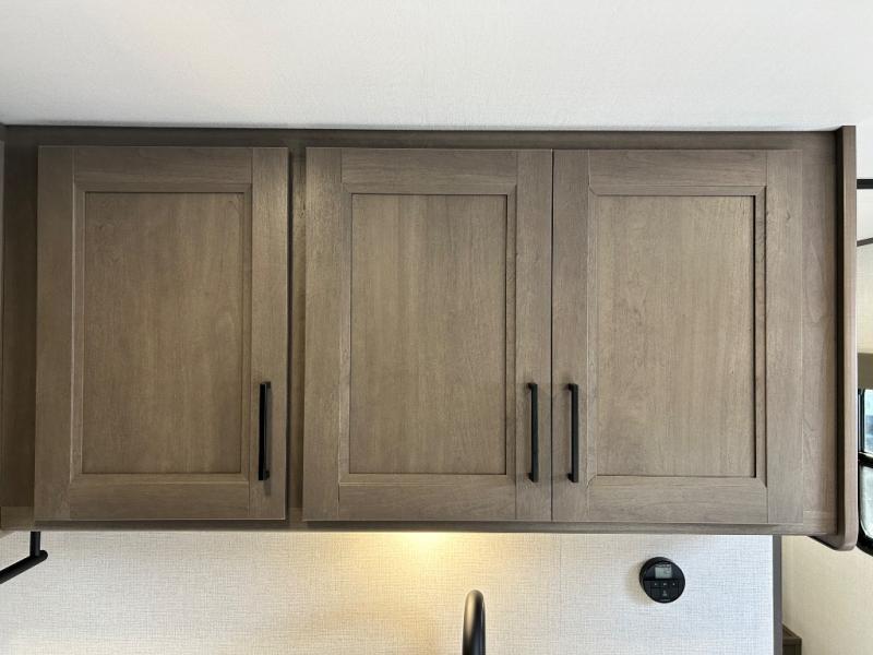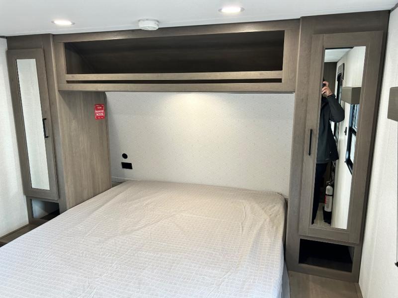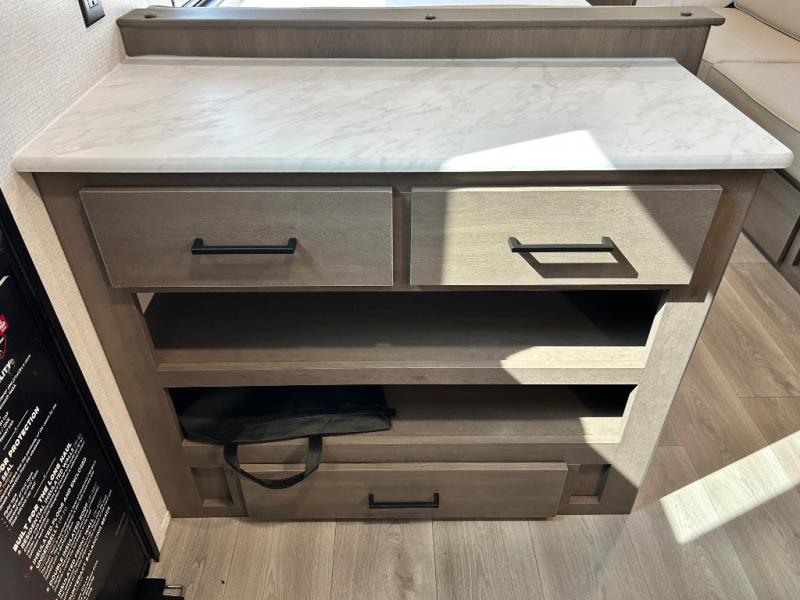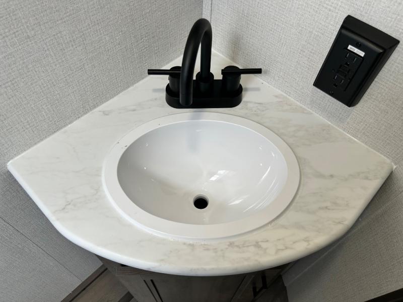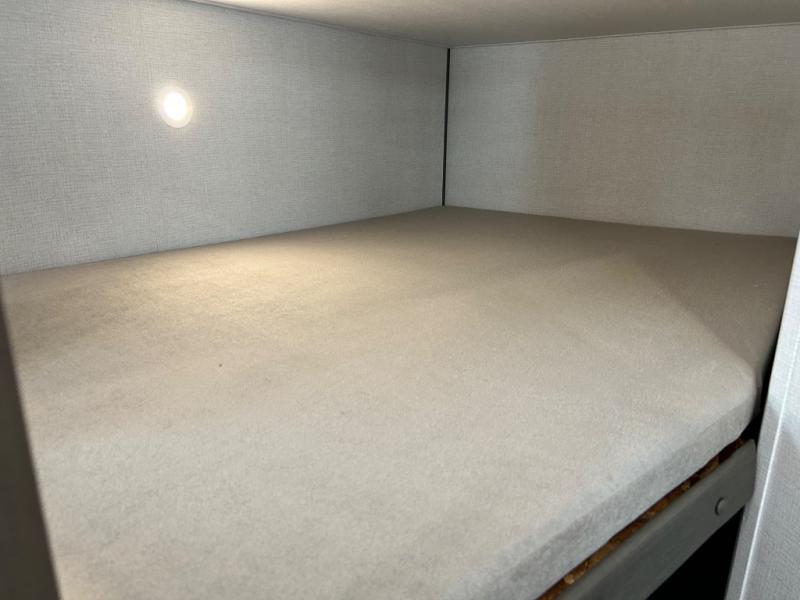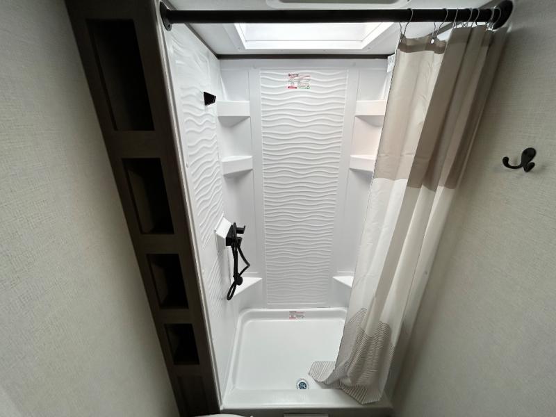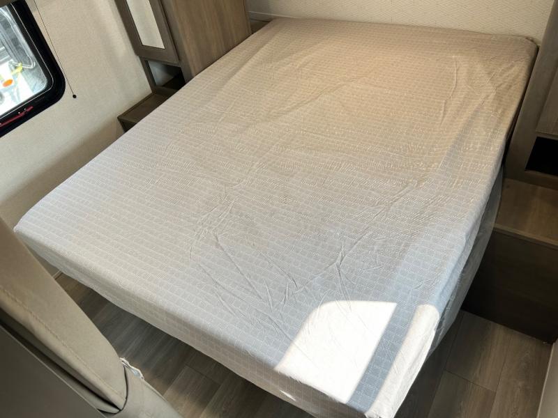 This is the perfect travel trailer if you like to camp with friends and family. Since there are double-size bunks, a queen bed in the front bedroom, plus a booth dinette and sofa, you can sleep eight campers each night! The three burner range and microwave in the kitchen will let you cook meals each day, and the 12V refrigerator will keep your cold items fresh. This model also includes a counter with extra storage underneath, a pull-out trash can storage for convenience, and a full bath to freshen up in each day. And you'll love having your own space in the front bedroom with a privacy curtain, dual wardrobes, and TV prep if you want to add a television!